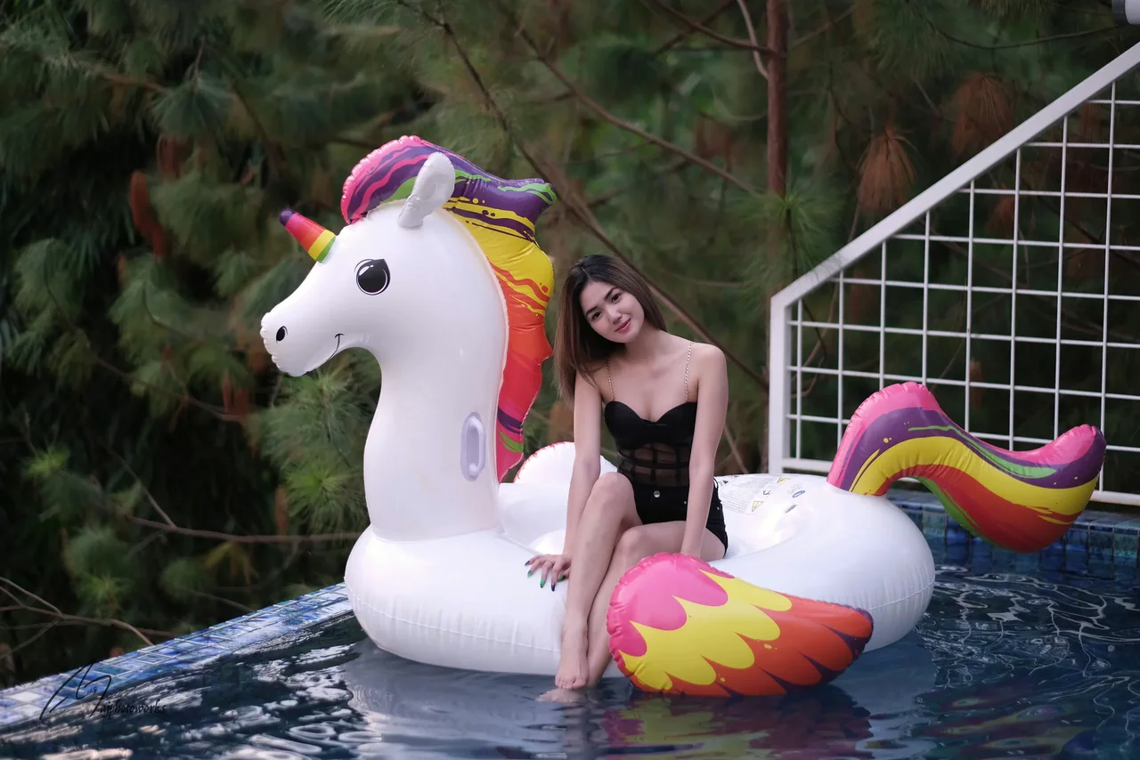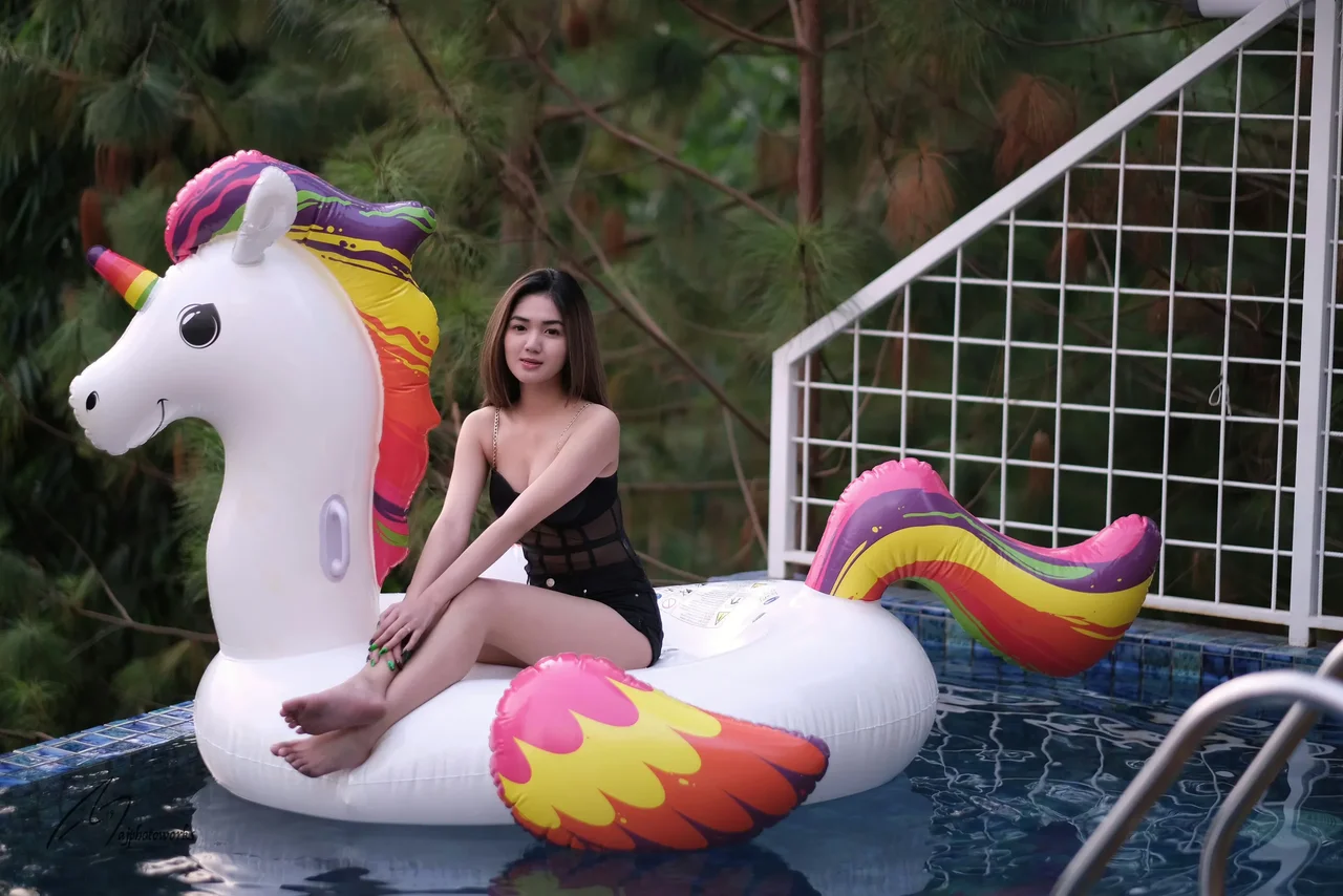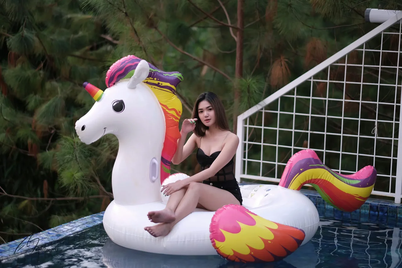 A young woman lounges on a vibrant unicorn inflatable in a serene outdoor pool, blending playful whimsy with summer vibes.