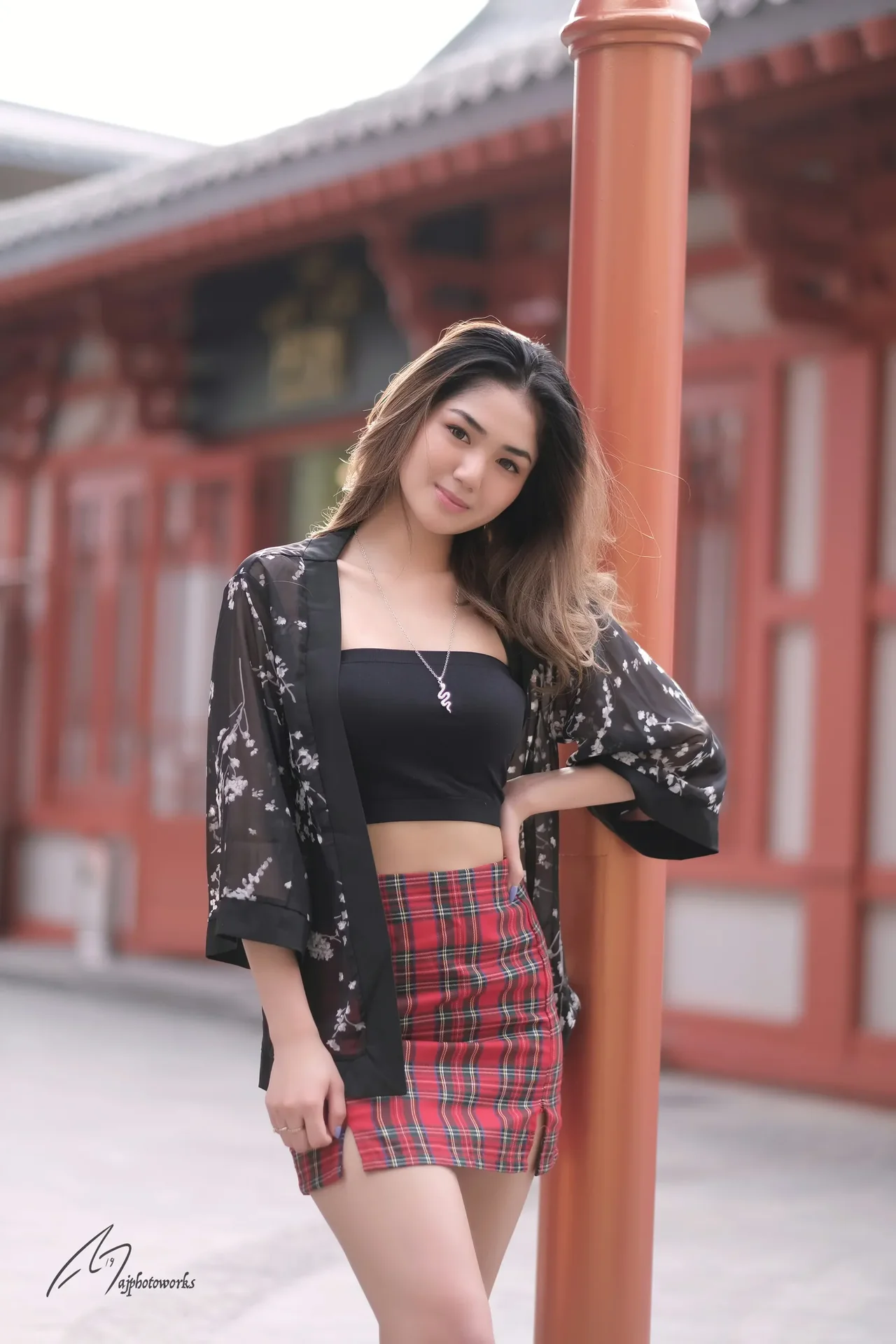 A woman blends traditional and modern aesthetics in a series of fashion-forward portraits, merging vibrant red plaid skirts with contrasting tops and backdrops.