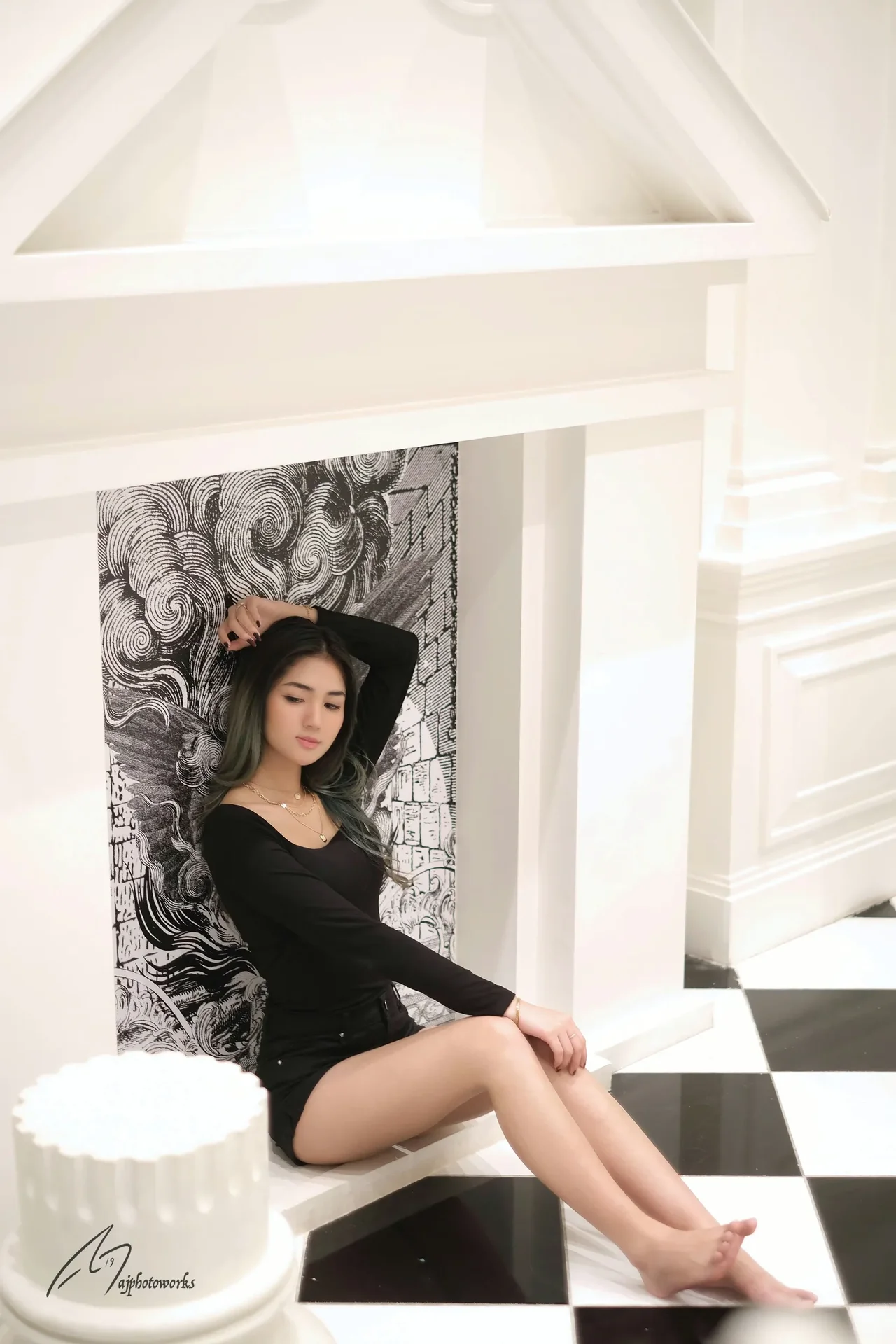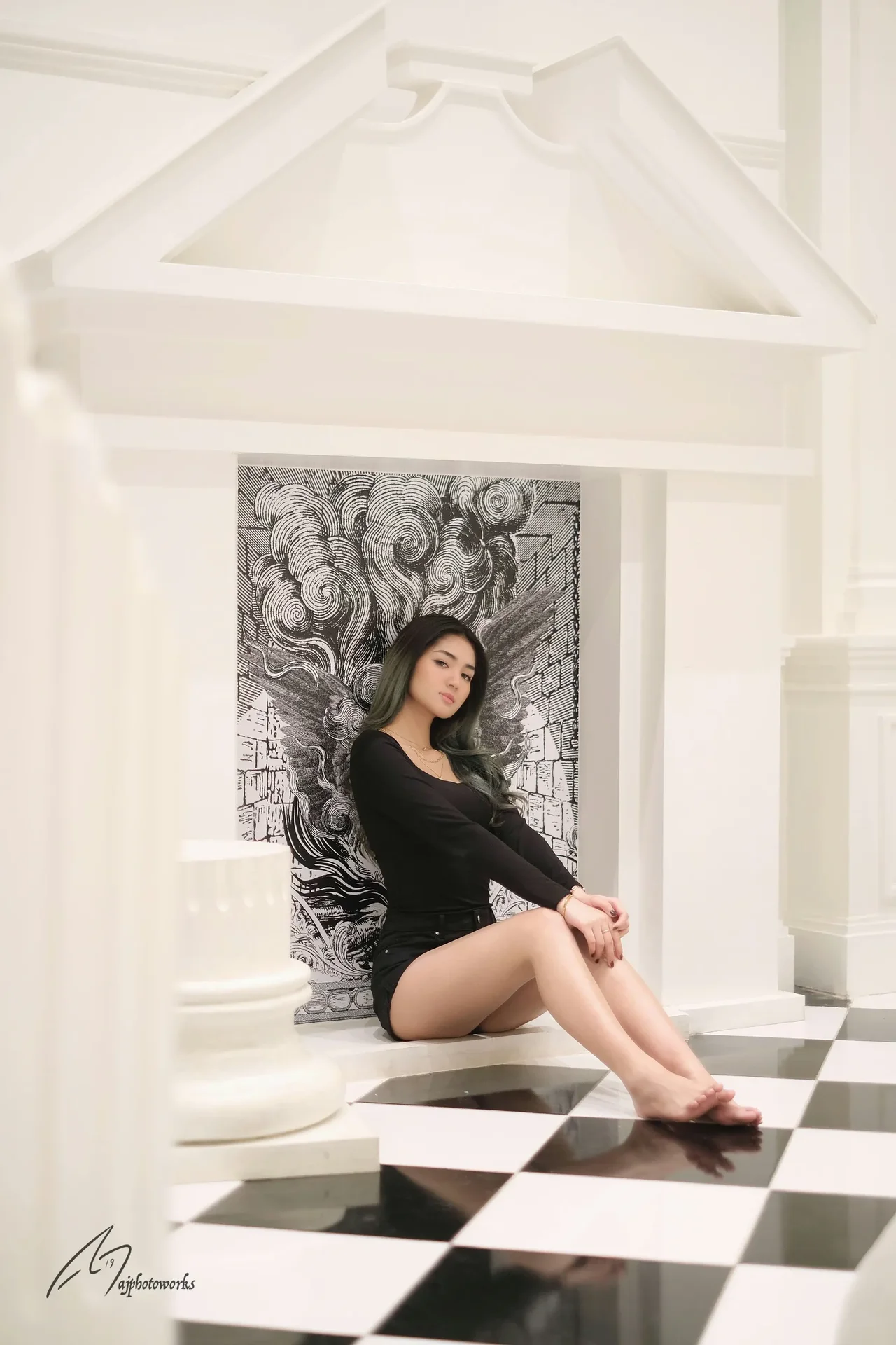 Elegantly posed in a minimalist, monochromatic setting with dramatic architectural elements.