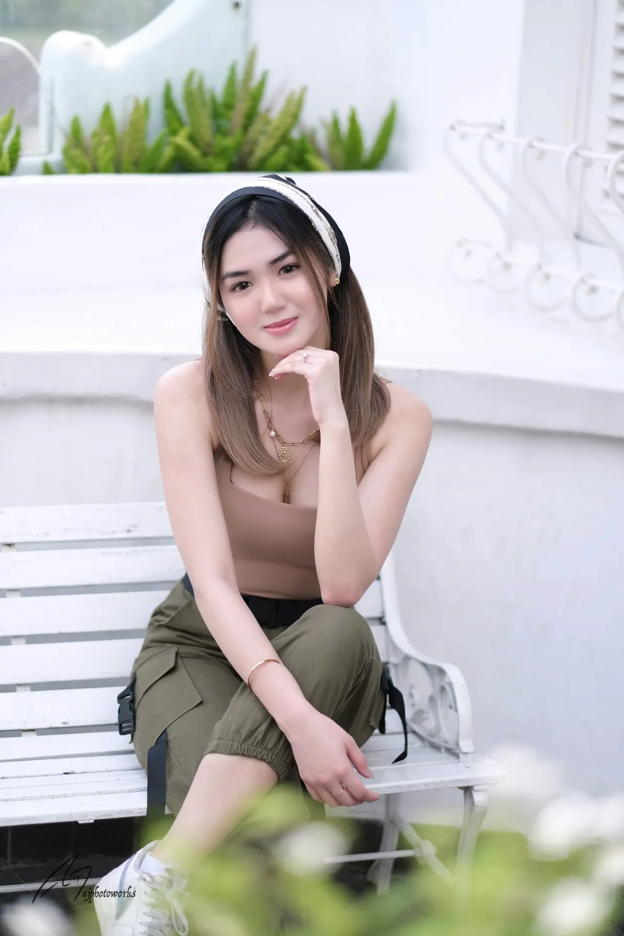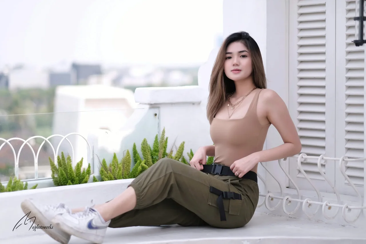 A confident woman enjoys a peaceful moment on a balcony, wearing a stylish casual outfit with a touch of elegance.