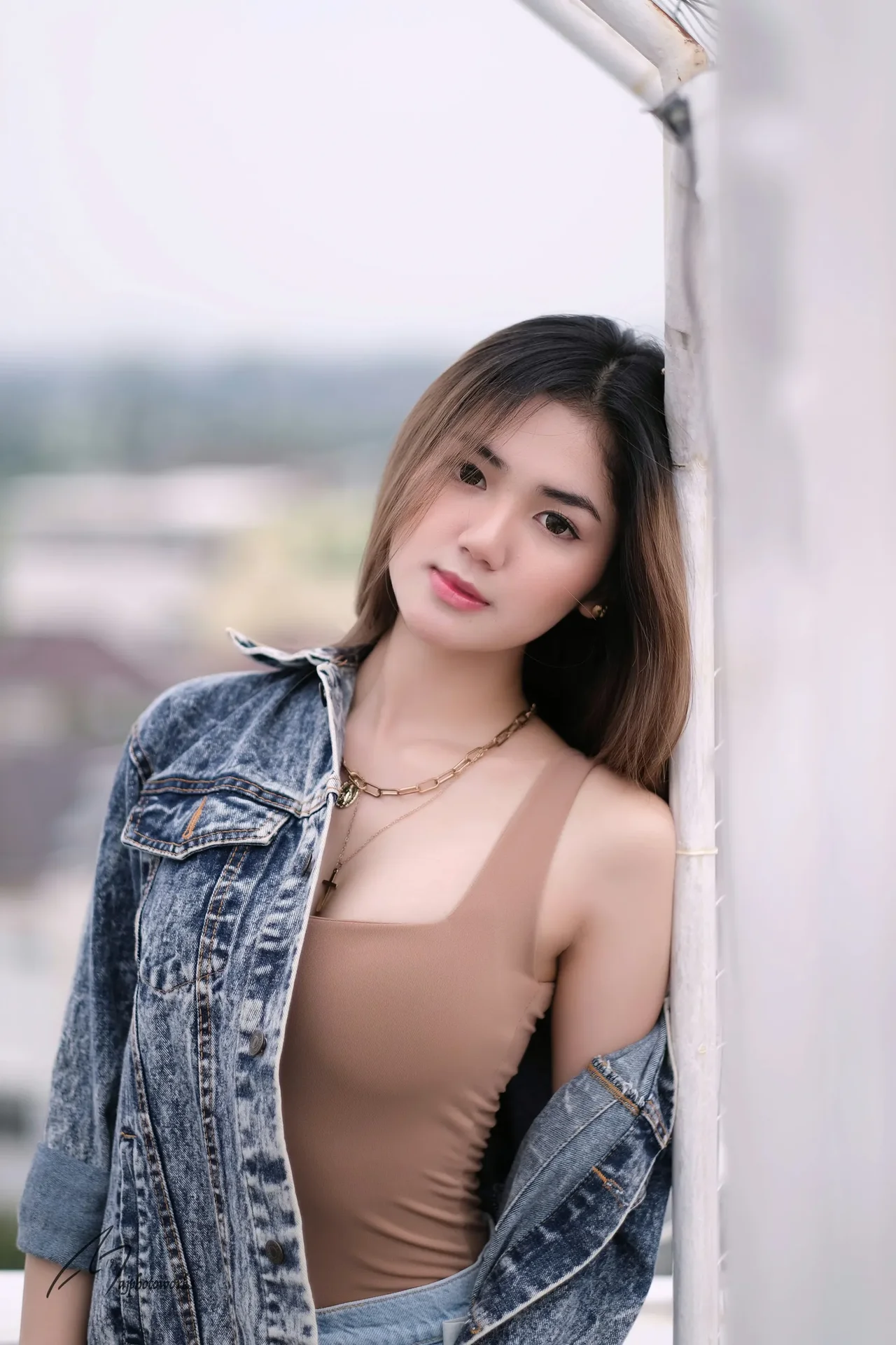 A model exudes casual elegance with a distressed denim jacket and neutral tones, framed by a textured urban backdrop and ethereal lighting.