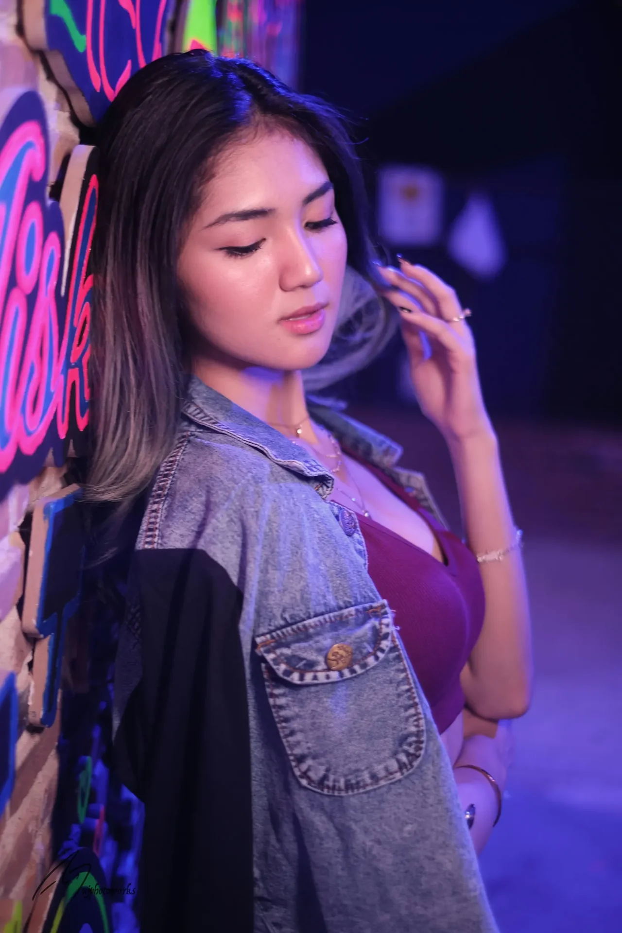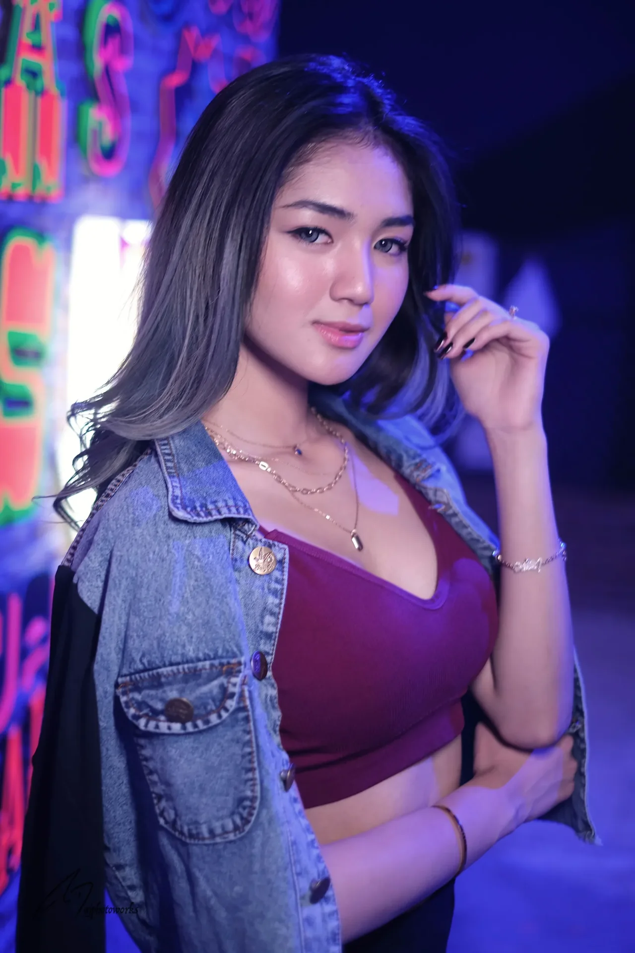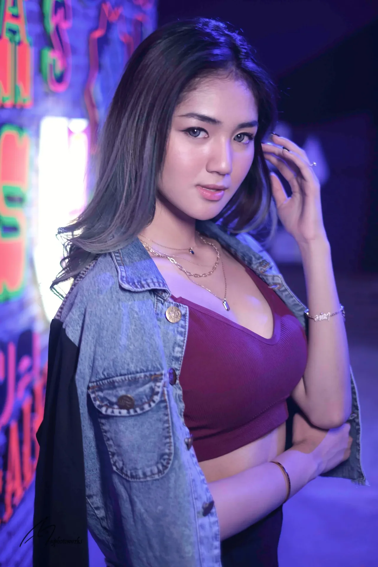 A woman confidently poses in a maroon cropped top and distressed denim jacket adorned with gold accessories against a vibrant neon-lit backdrop, capturing the essence of urban nightlife.