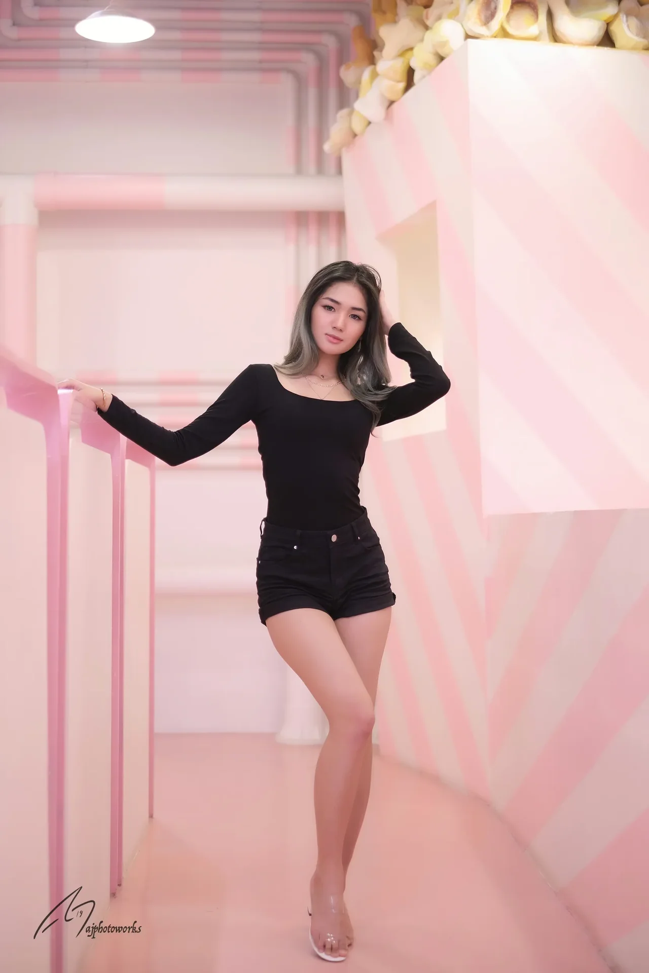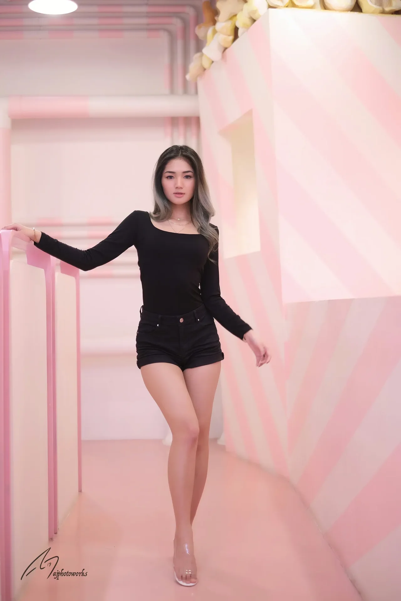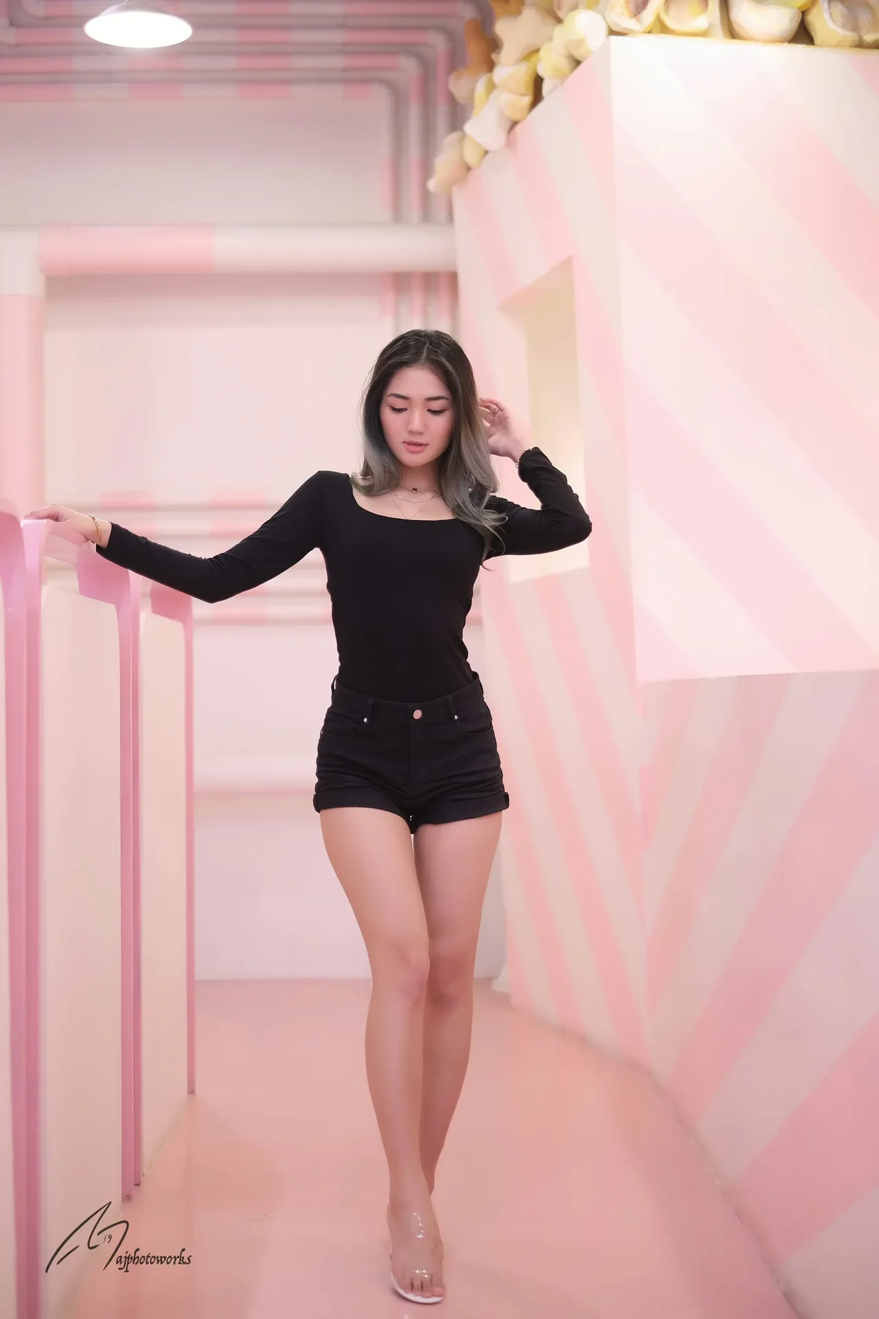 Striking a pose in a chic, monochrome outfit against a whimsical pink and white striped corridor with playful doughnut decorations.