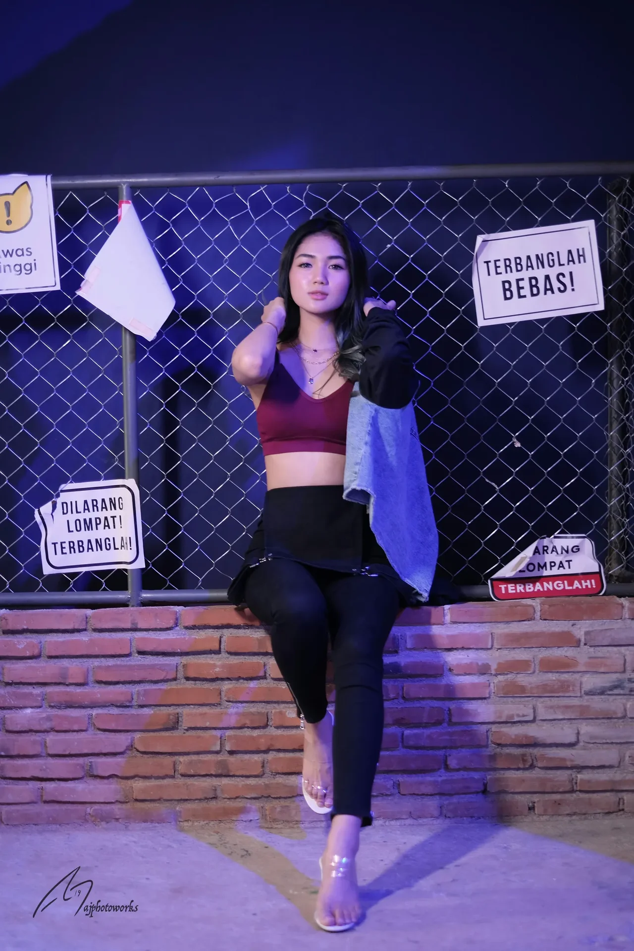 A confident young woman in a bold, edgy outfit stands against an urban backdrop with striking lighting and textured elements.