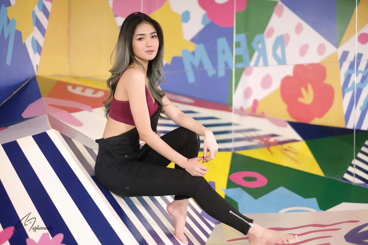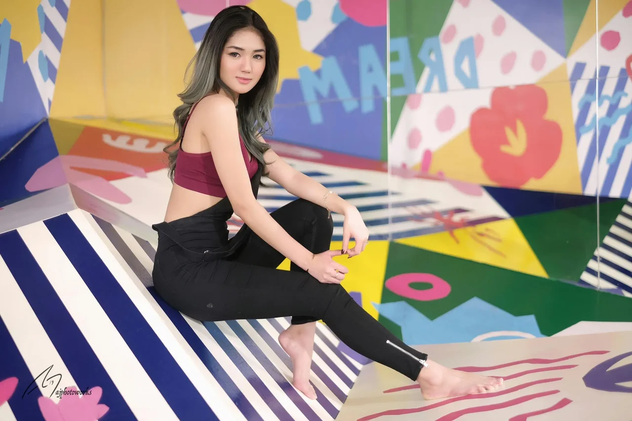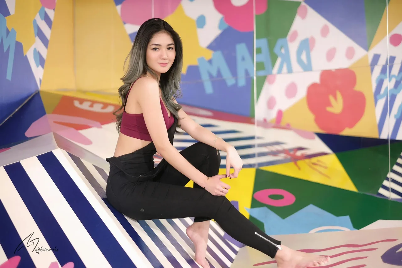 A striking portrait of a woman in a maroon crop top and black leggings, set against a vibrant geometric mural with bold colors and playful patterns, exuding a dreamy and artistic atmosphere.