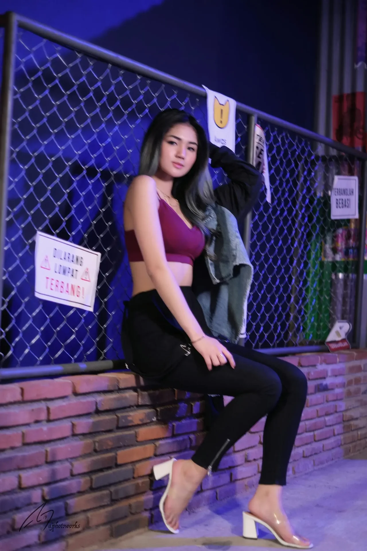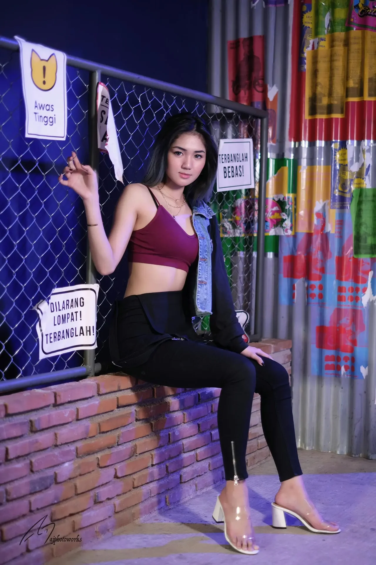 A woman in a stylish burgundy crop top and black skinny pants poses against a gritty urban backdrop, blending fashion with edgy street aesthetics.