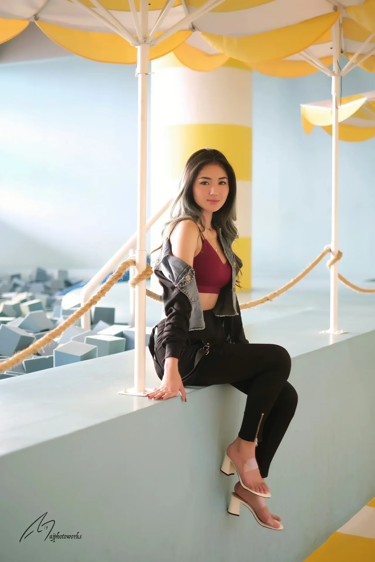 A vibrant fashion portrait blending stylish urban wear with a playful studio backdrop featuring bold color contrasts.