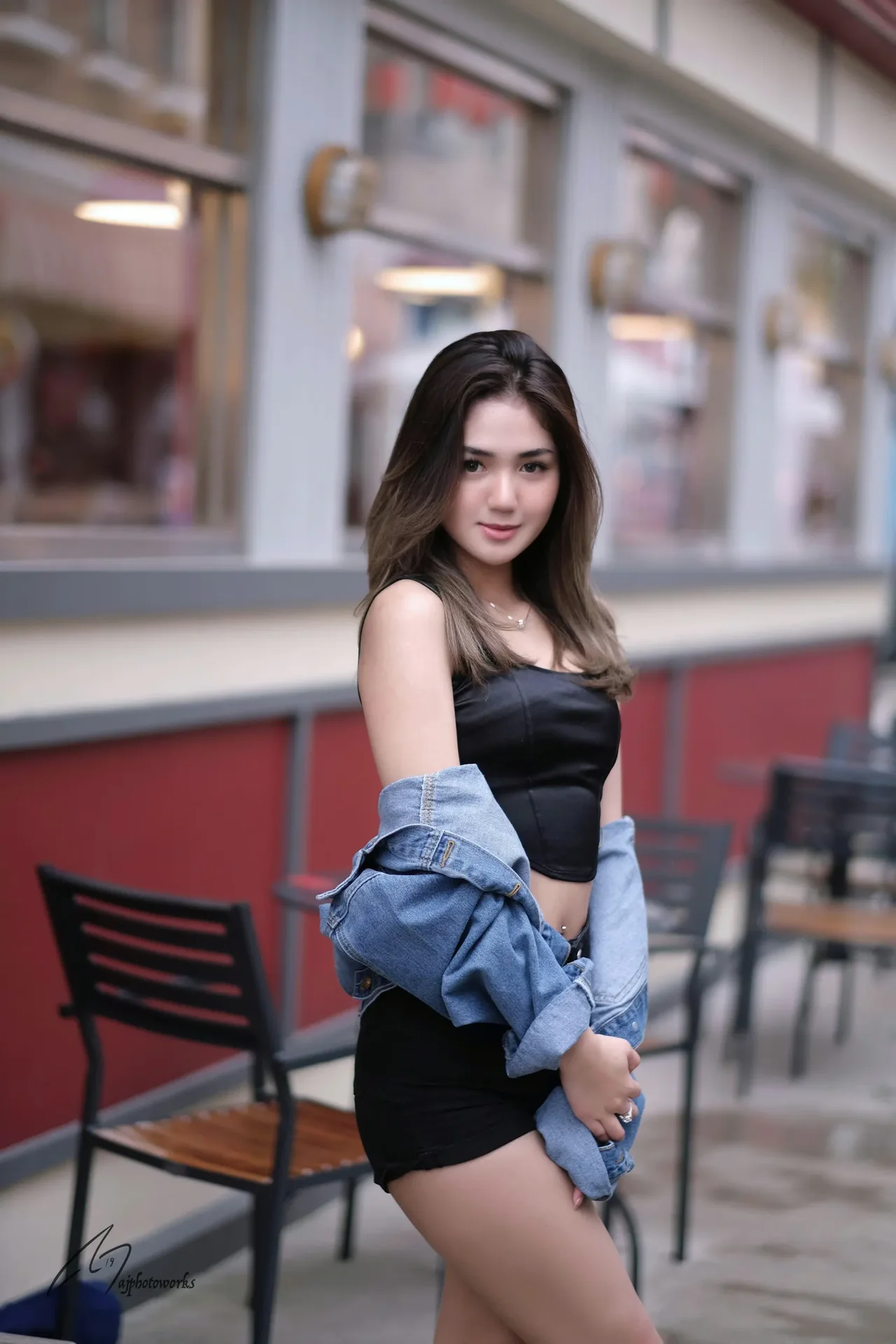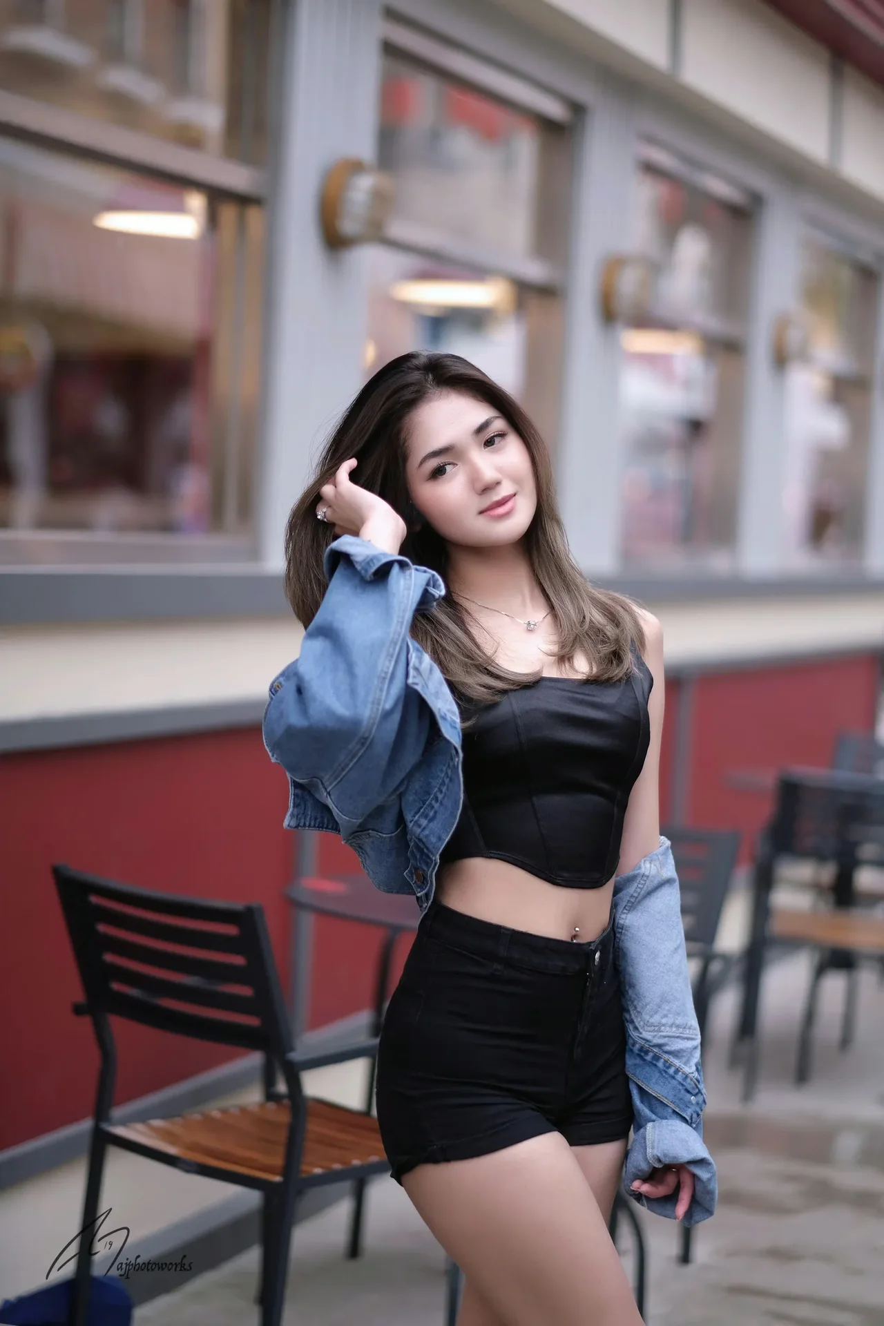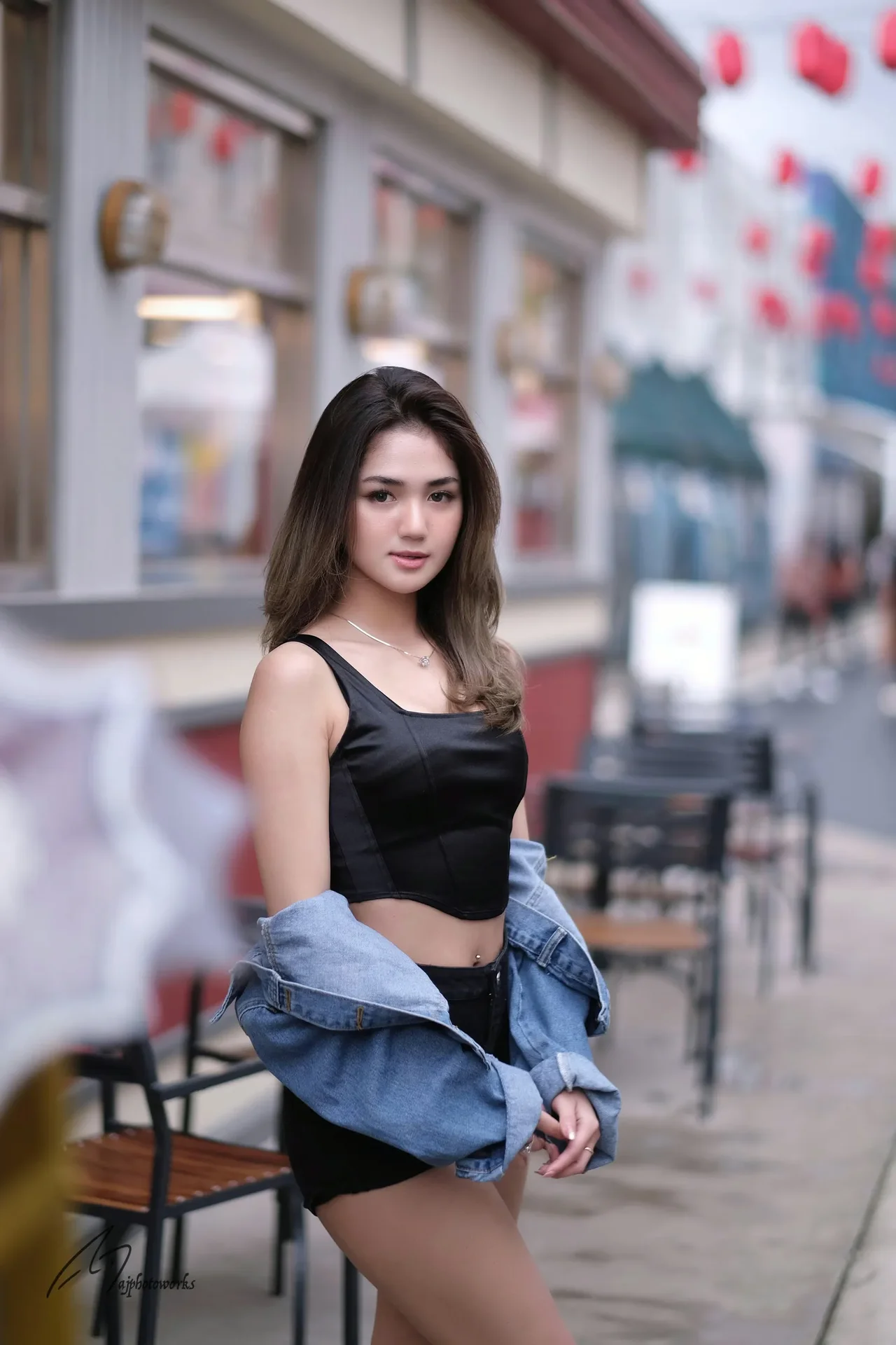 A confident woman poses in a casual urban outfit, blending vintage and modern style against the backdrop of a vibrant café scene.