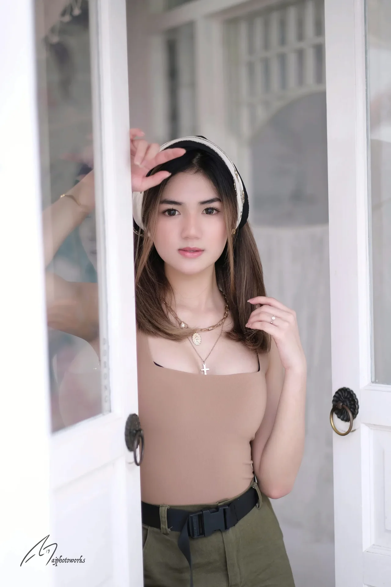 Effortless style and a captivating gaze. A moment of quiet confidence captured in a beautiful setting.