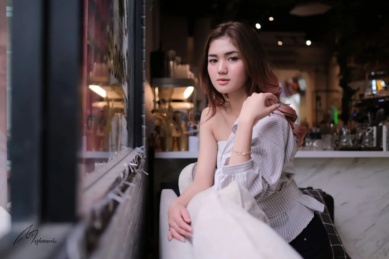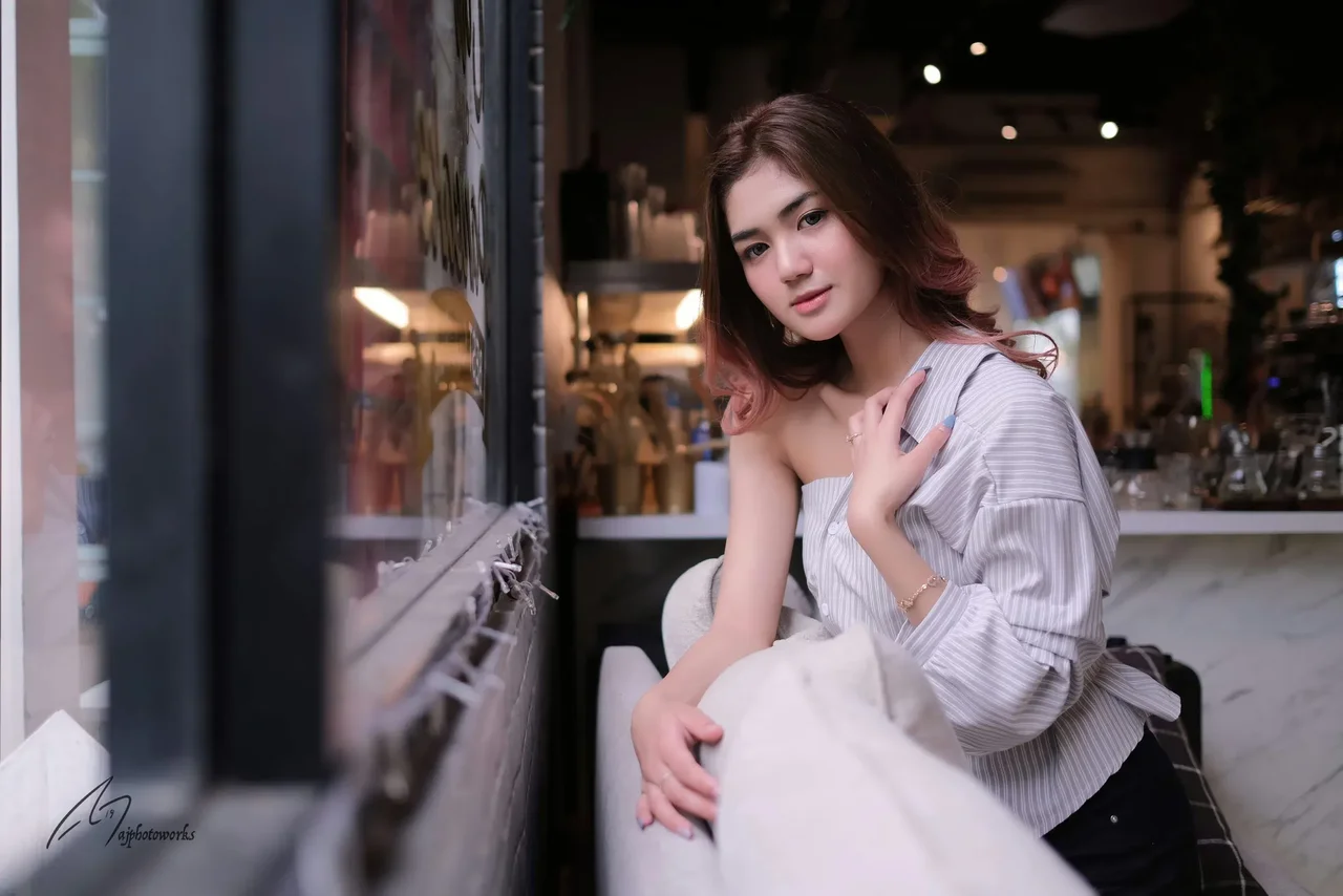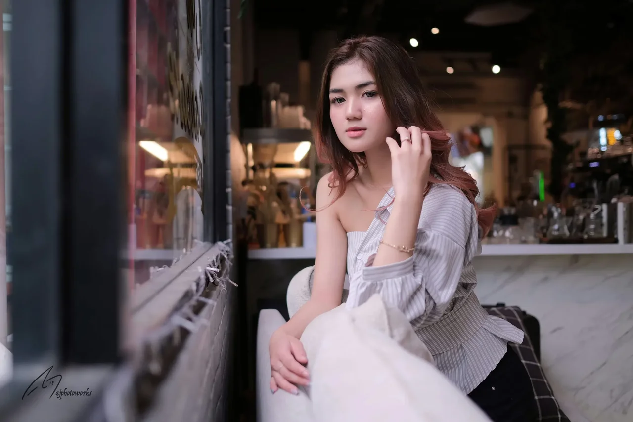 A moment of tranquility as a woman lounges by a sunlit window in a cozy café, her striped shirt and gold bracelet adding a touch of effortless style against the backdrop of steaming coffee machines and marble countertops.