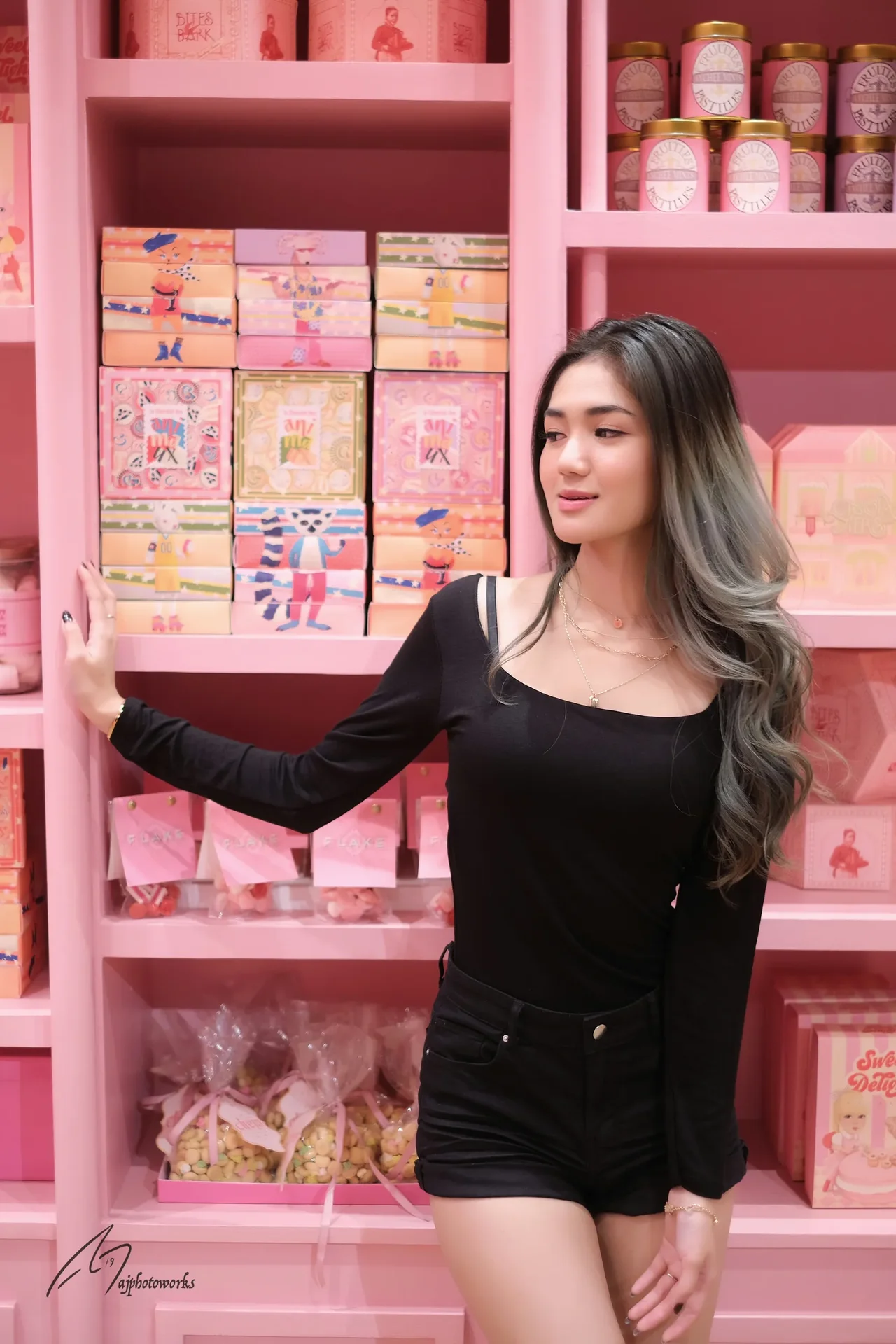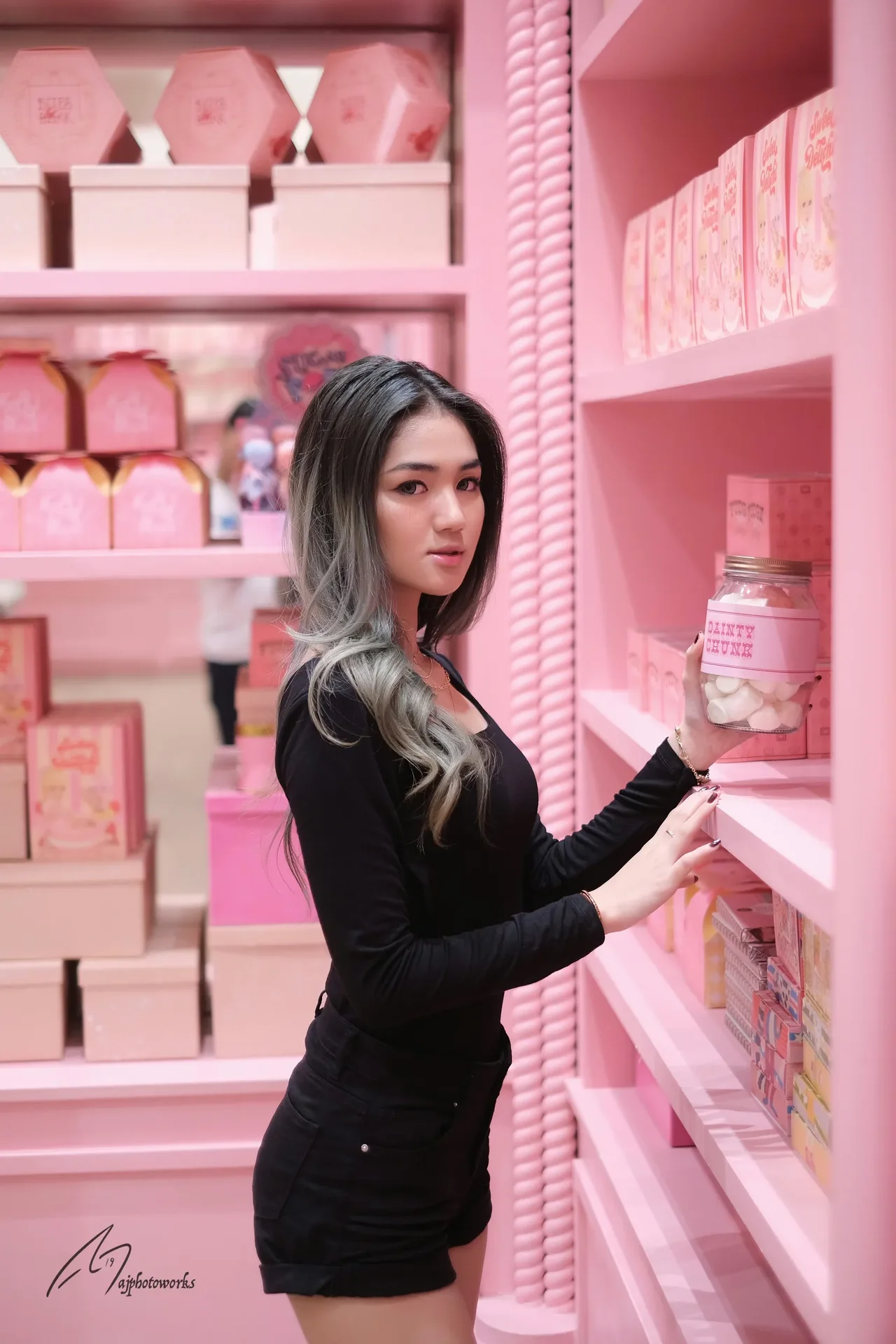 A playful interaction with vibrant confectionery displays in a pastel pink boutique, highlighting bold fashion contrasts and whimsical charm.
