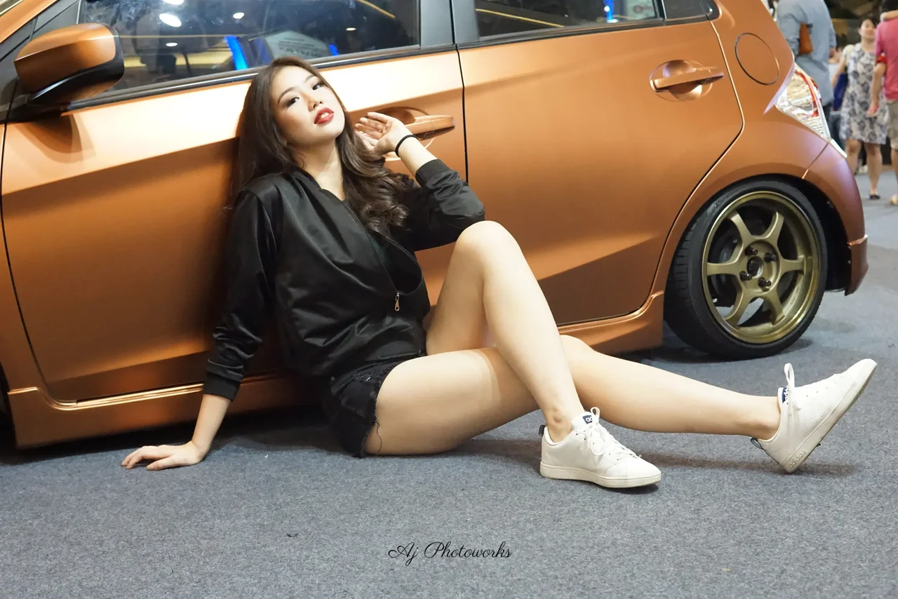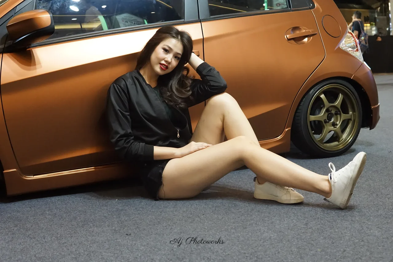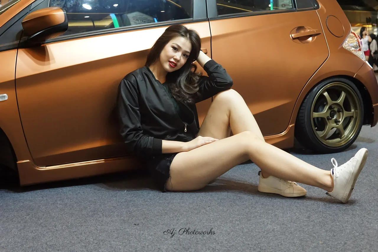 Elegance meets urban flair as the model reclines beside a vintage-inspired car, her confident pose contrasting the sleek, caramel-toned backdrop.