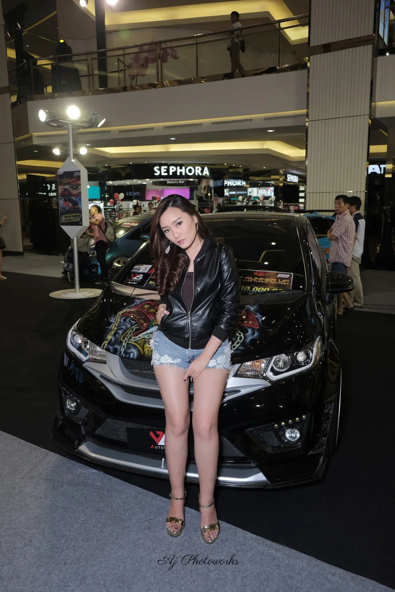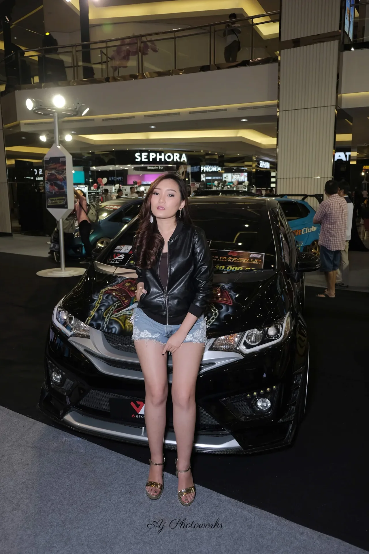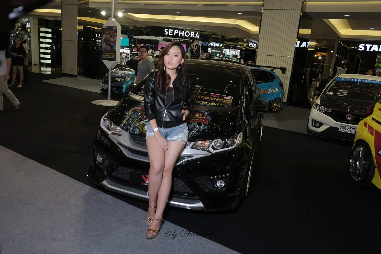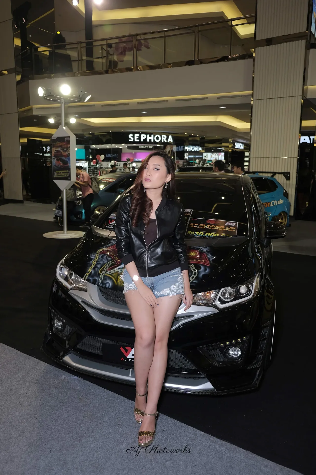 Bold fashion meets automotive artistry at a vibrant indoor car show.