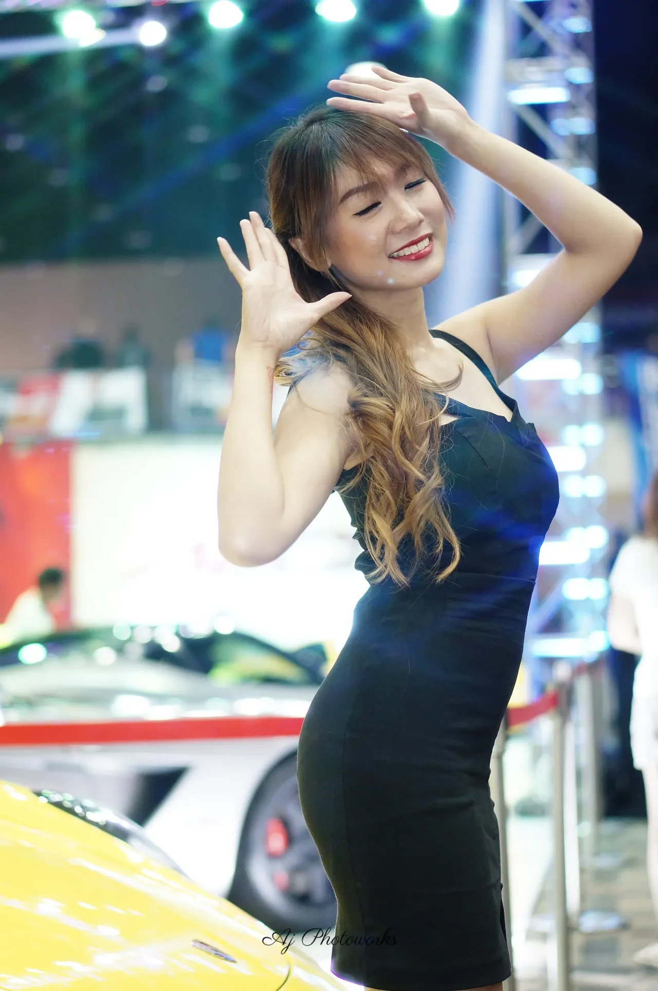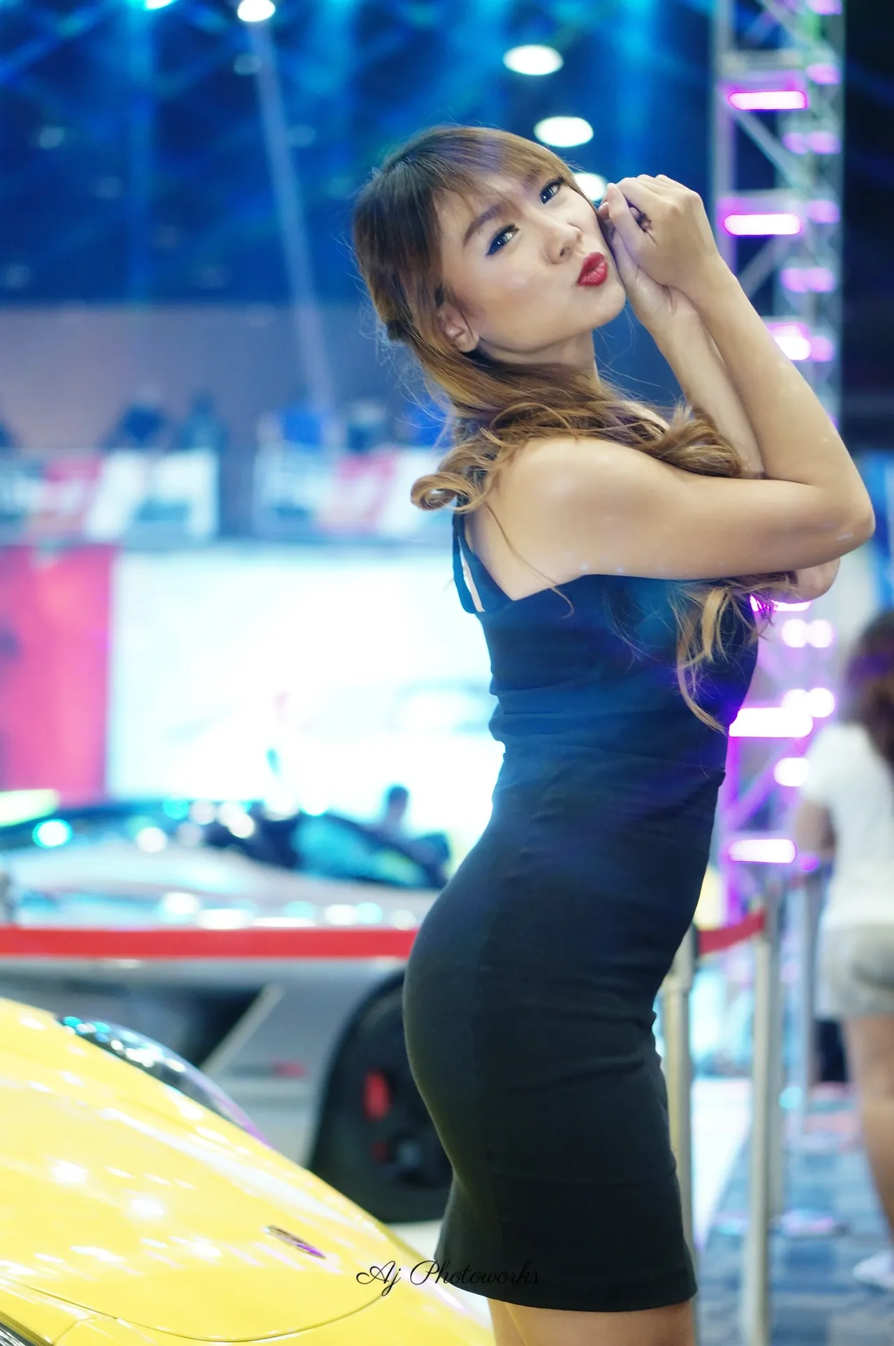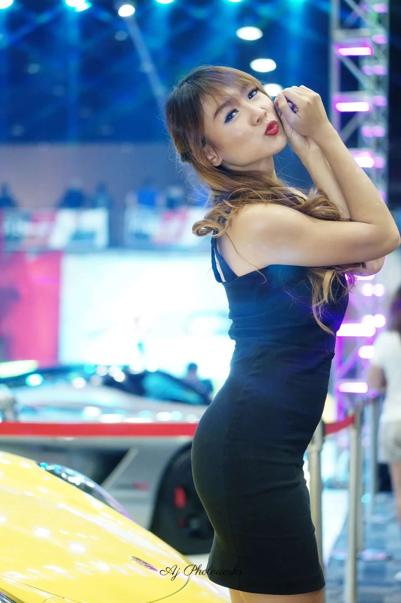 Elegance meets automotive passion in this vibrant car show scene, where fashion and speed collide under neon lights.