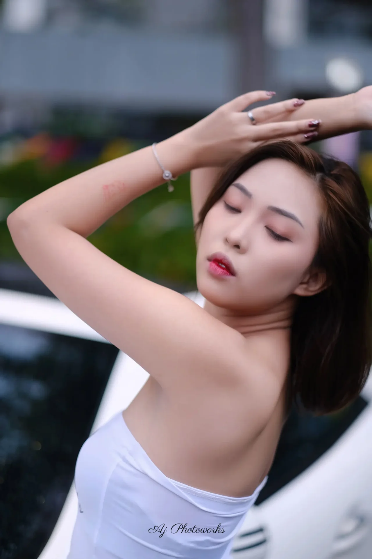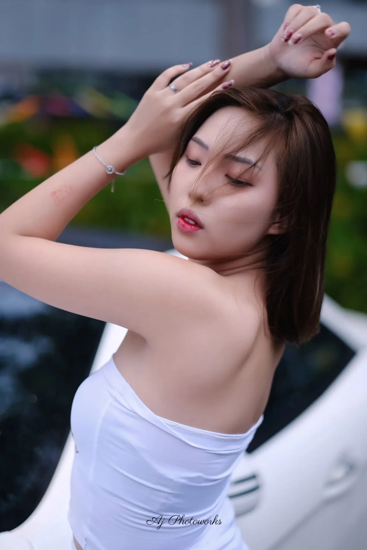 Chic fashion shoot with a white spaghetti-strapped outfit, a car, and vibrant outdoor flags.