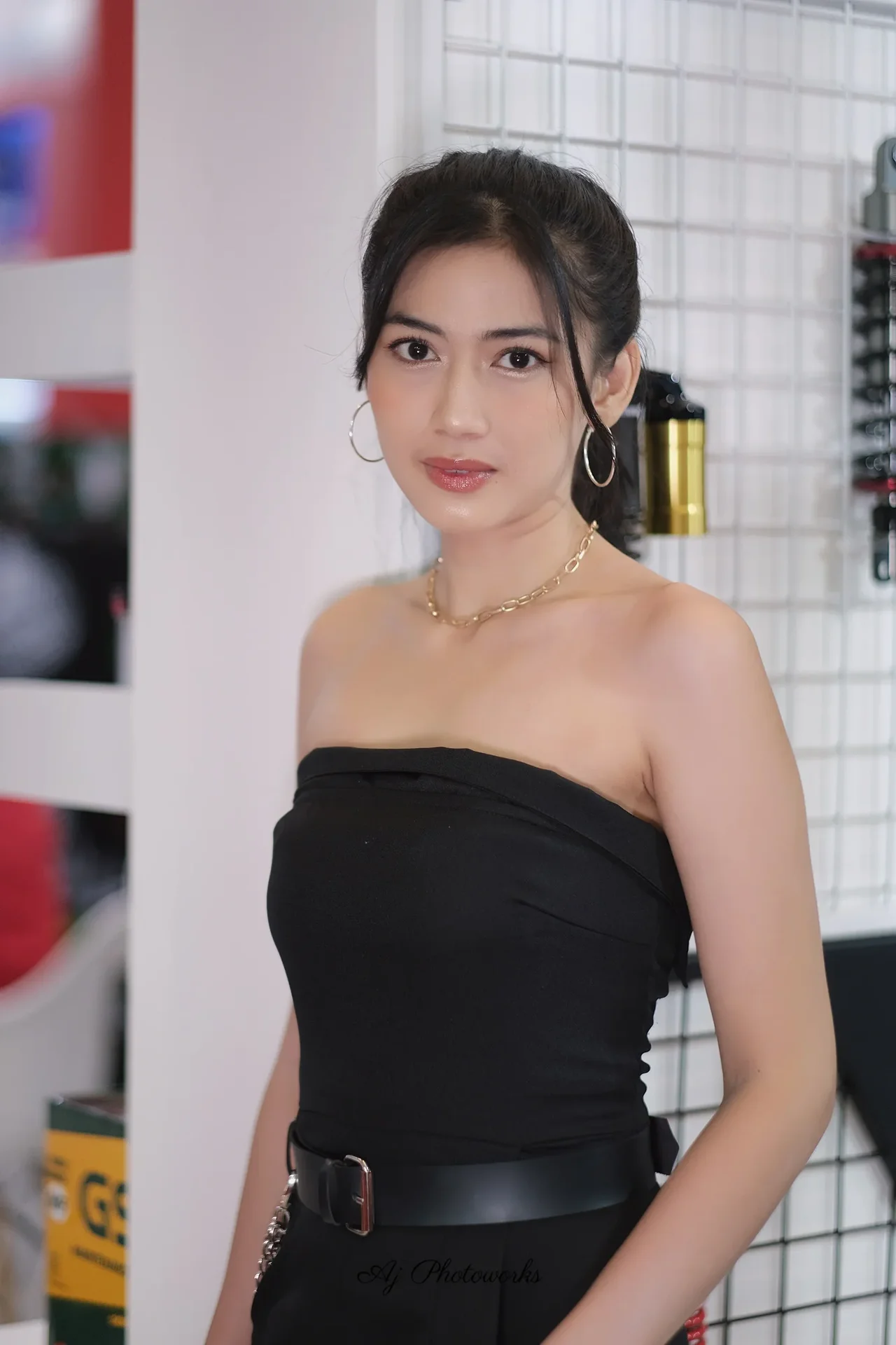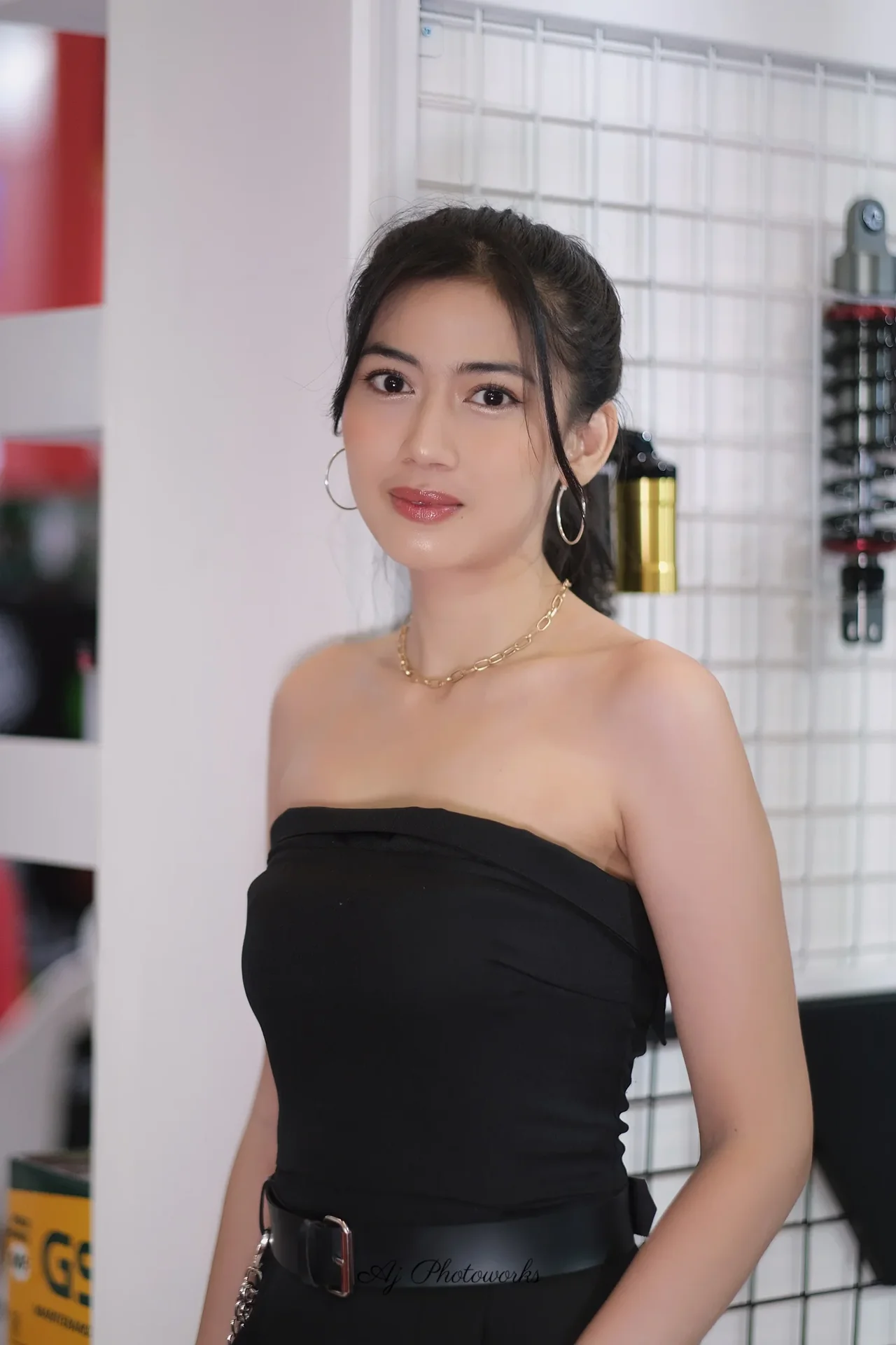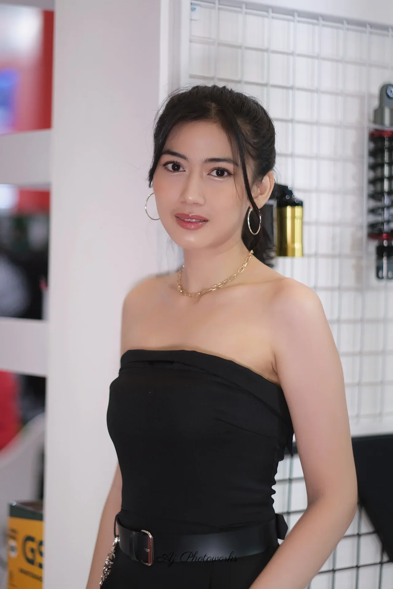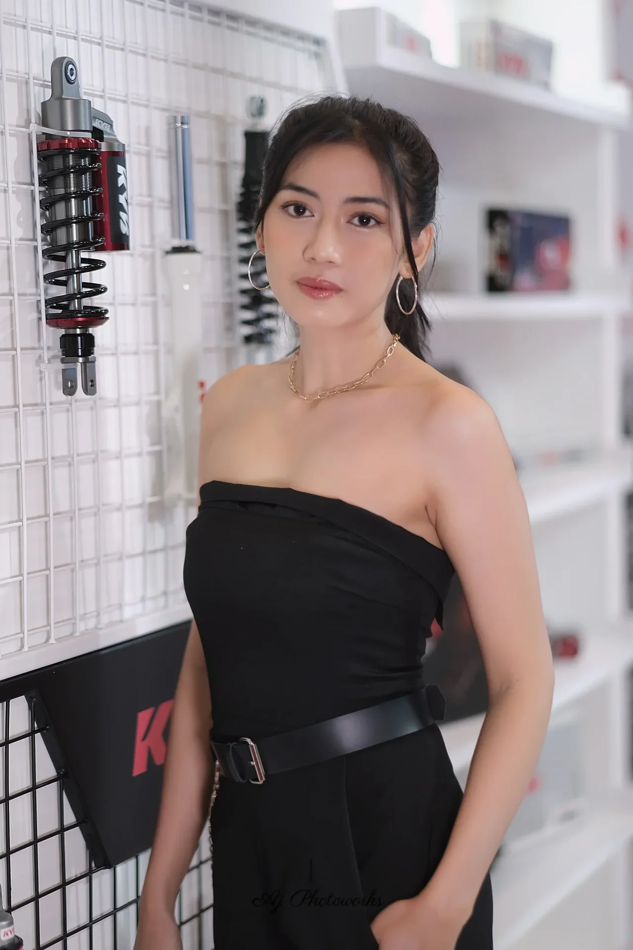 A confident woman in a stylish black strapless outfit poses in a bright showroom with motorcycle parts on display.