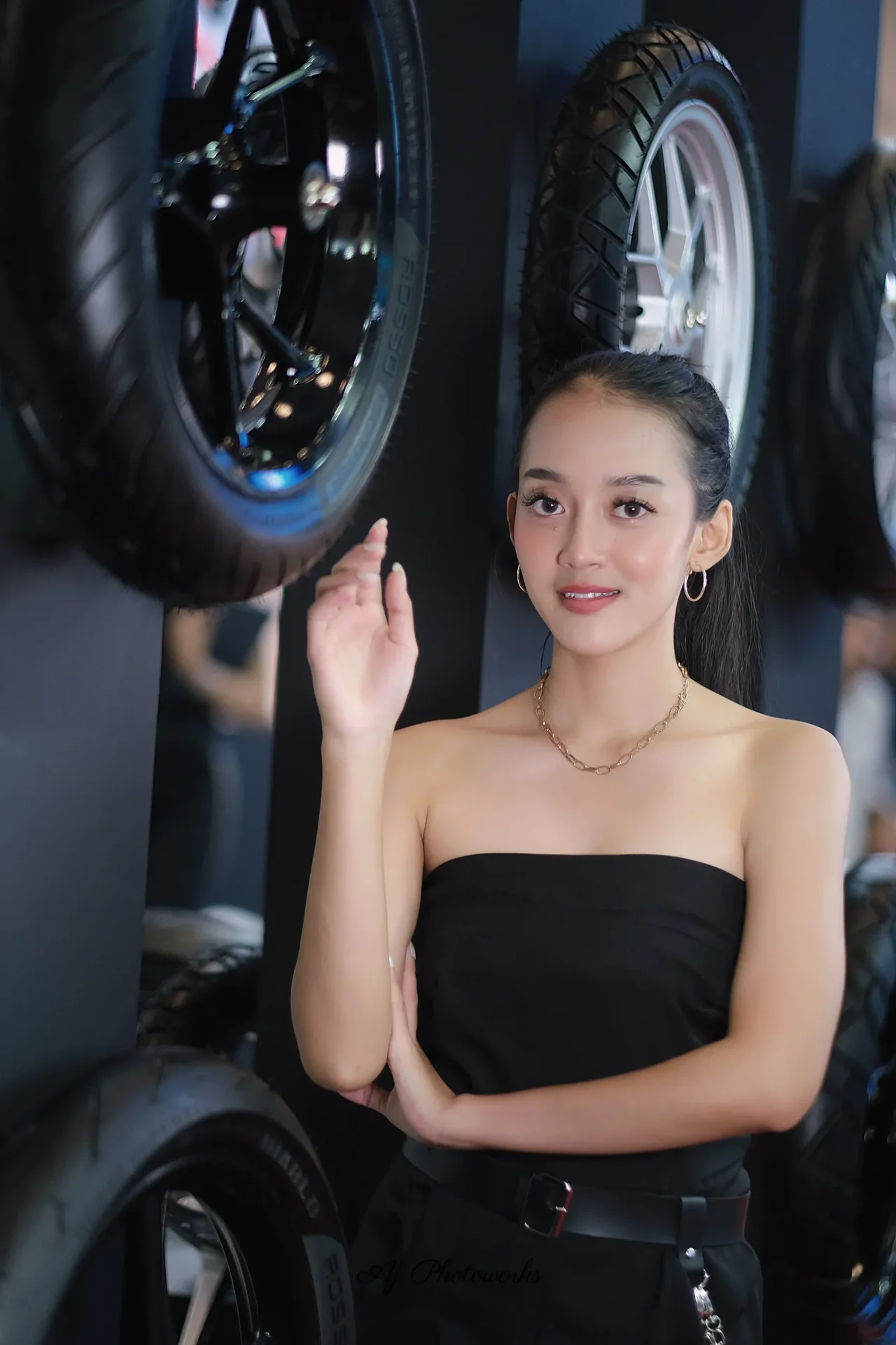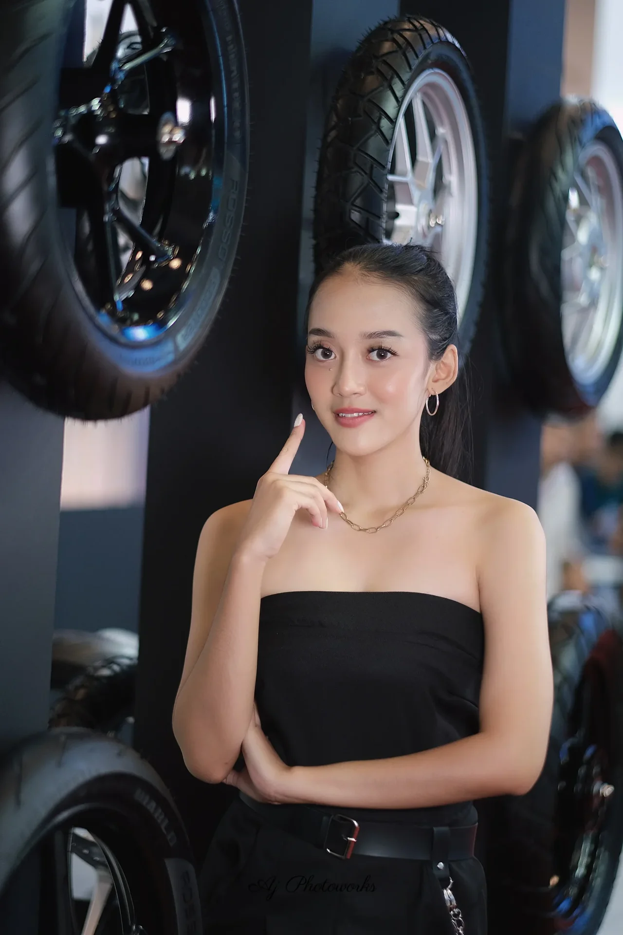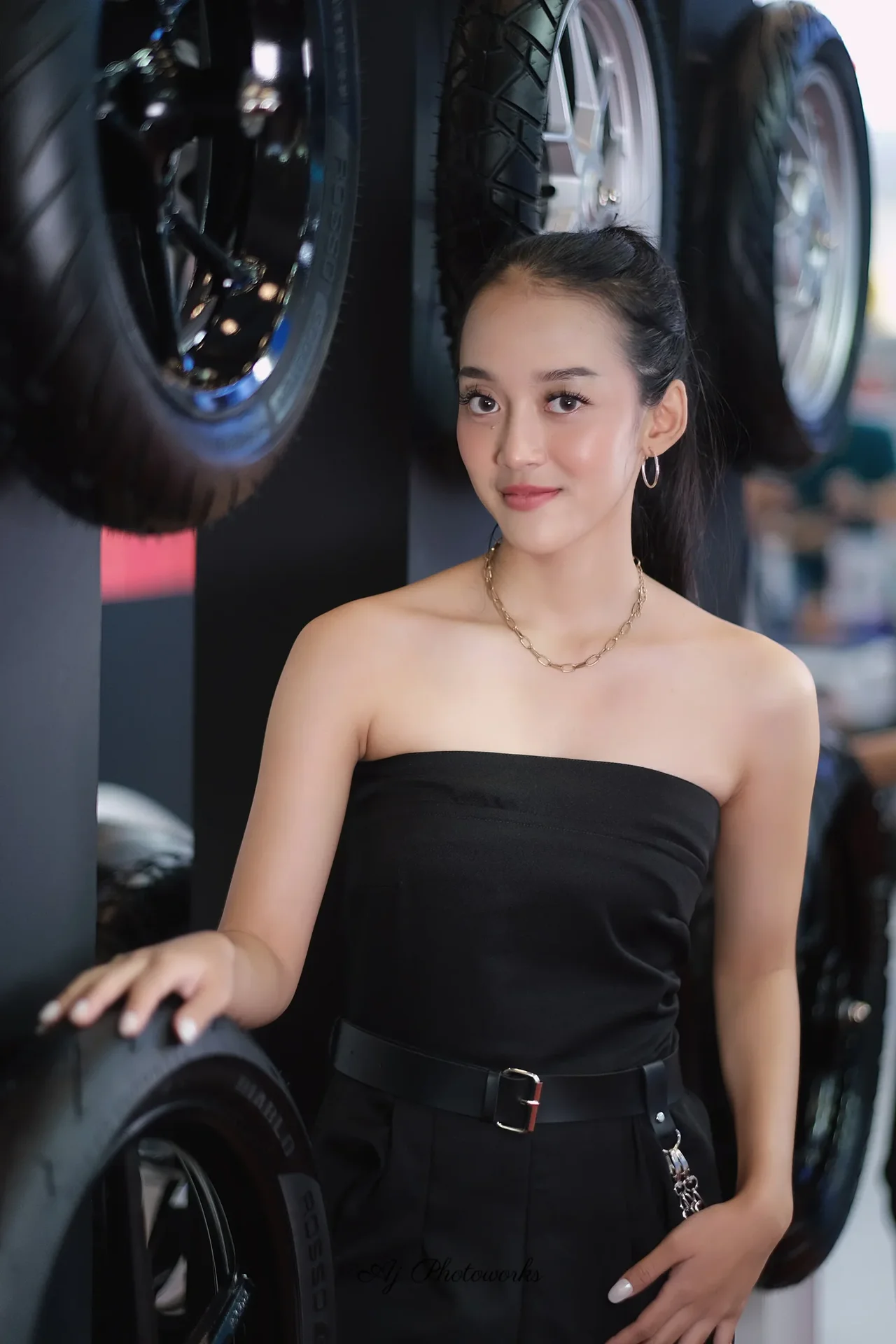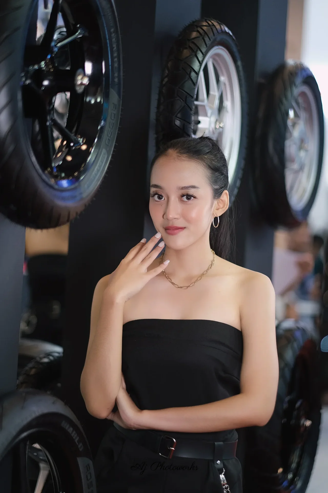 Black leather and latex textures meet gold accents in a high-fashion sportswear edit against a motorcycle tire backdrop.