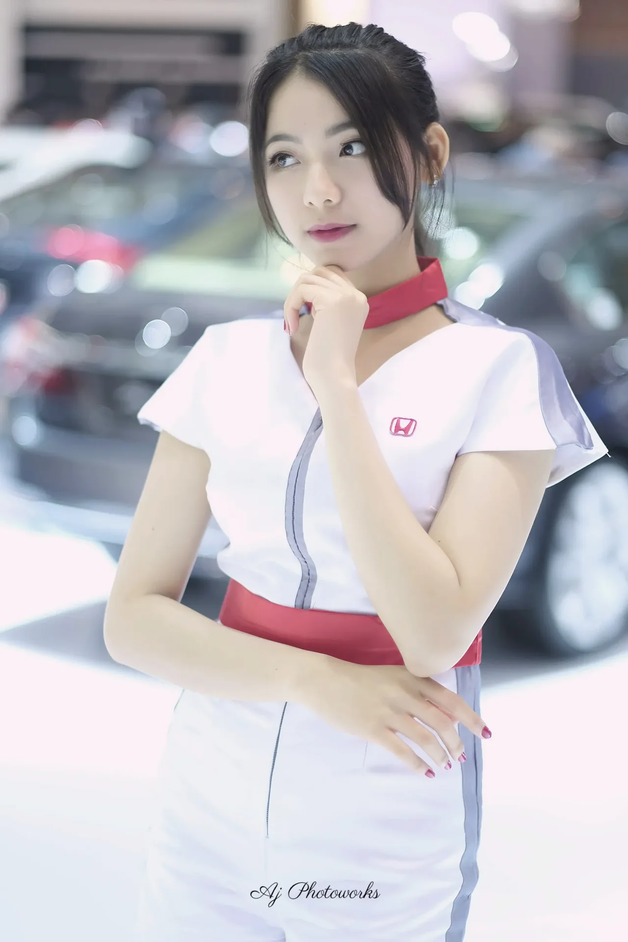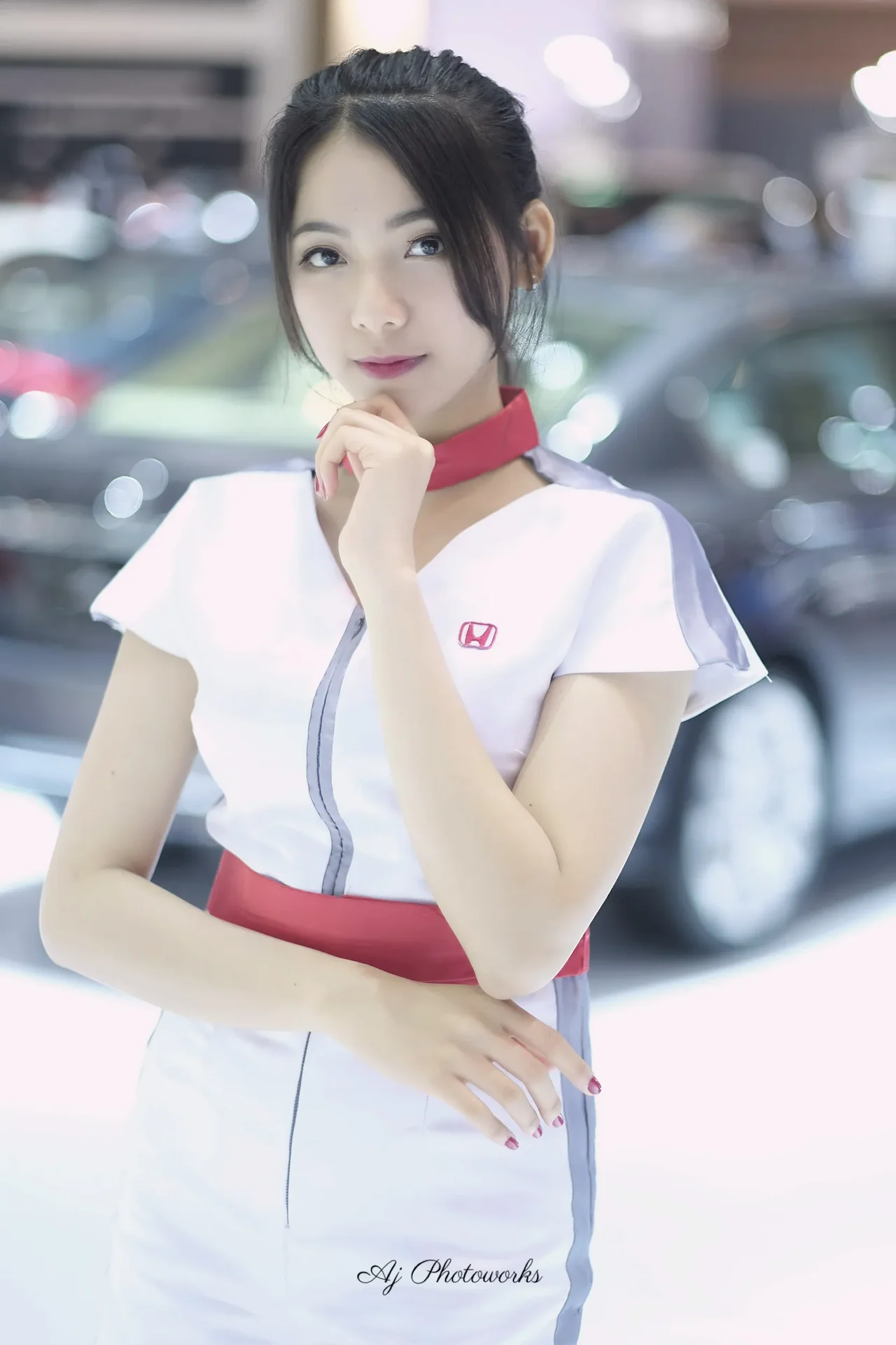 Elegant Honda promotional model radiates confidence at an automotive showcase.