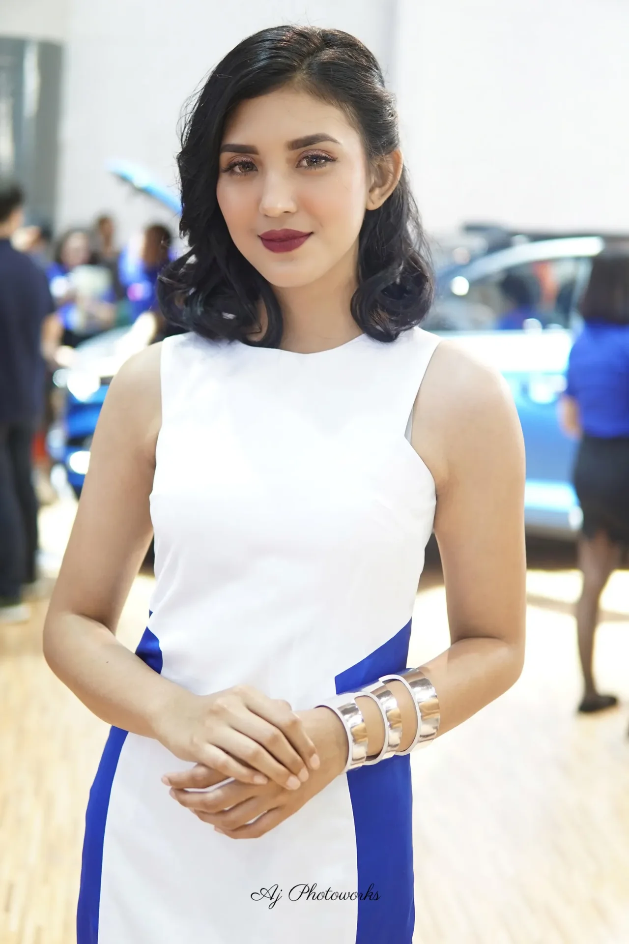 Elegant poise at a vibrant auto show, where fashion meets automotive allure.