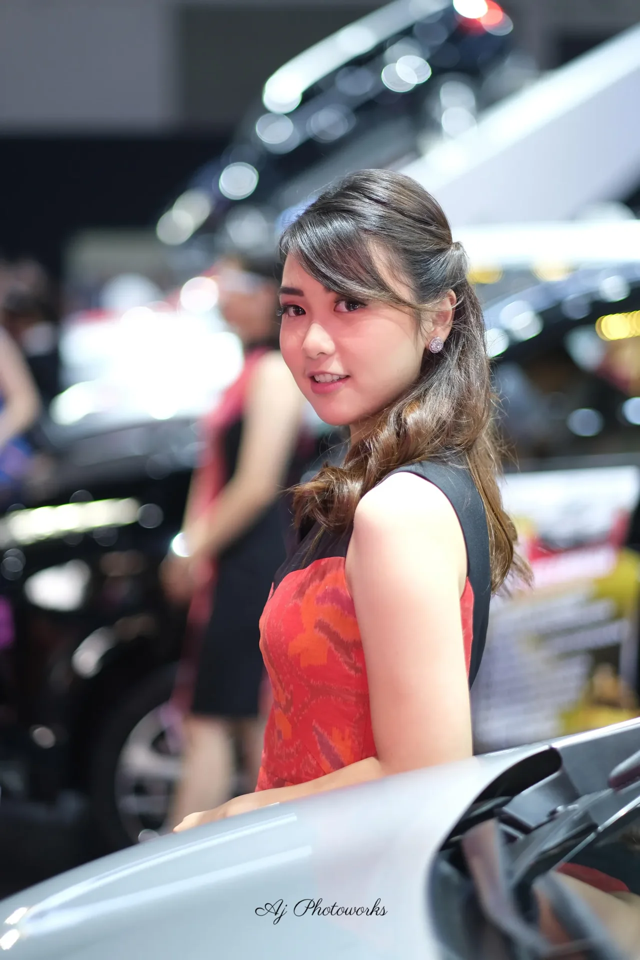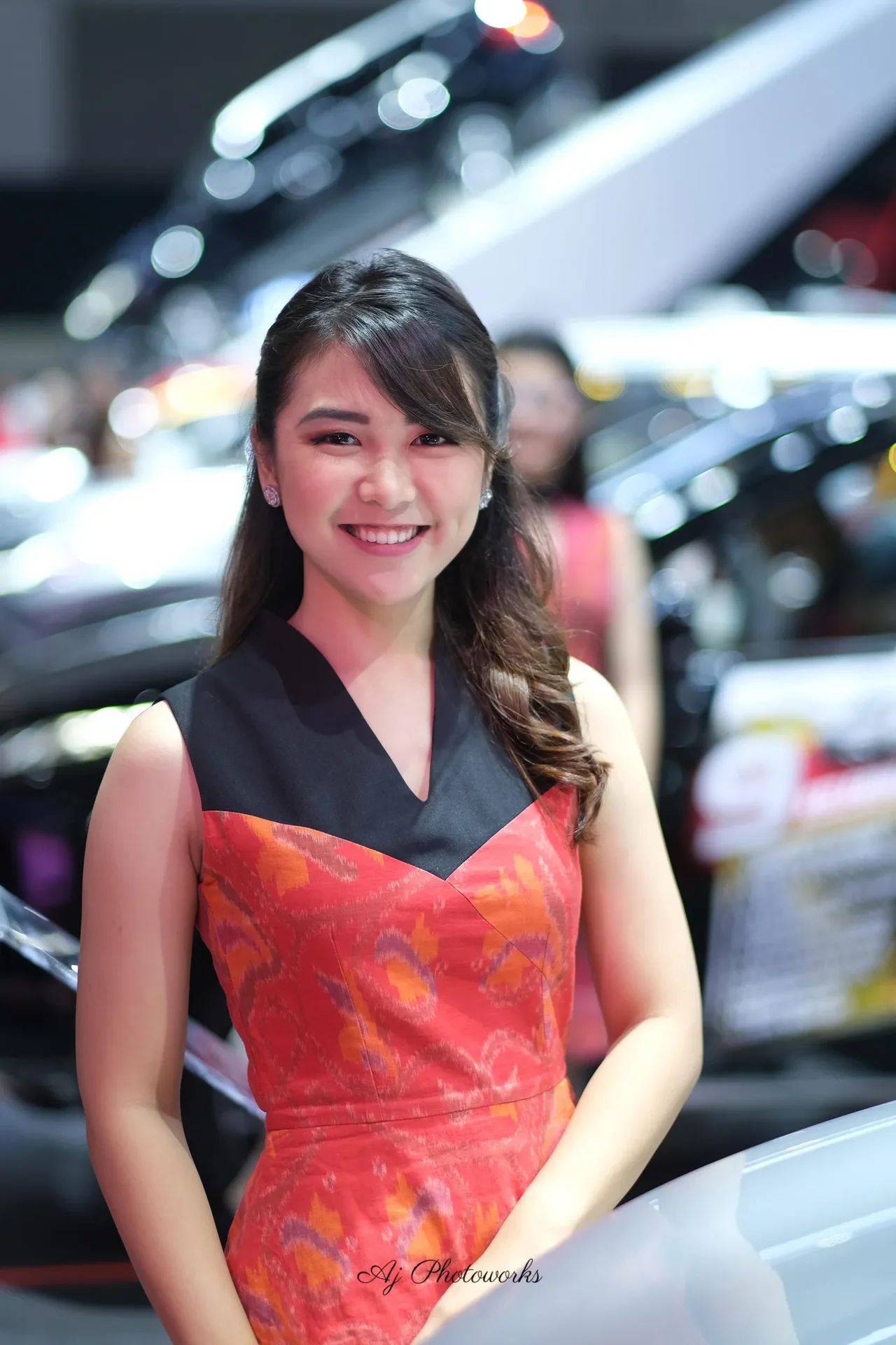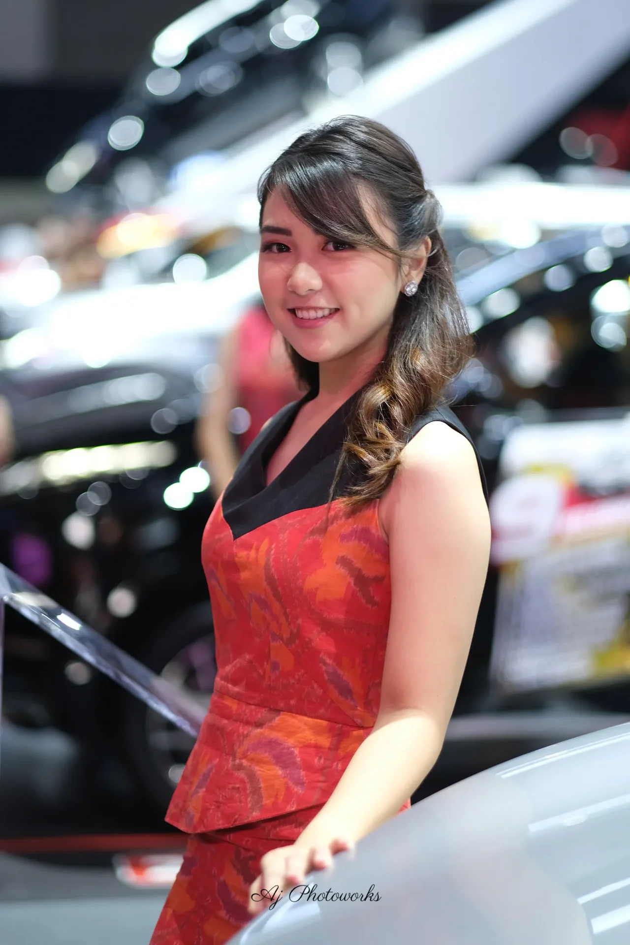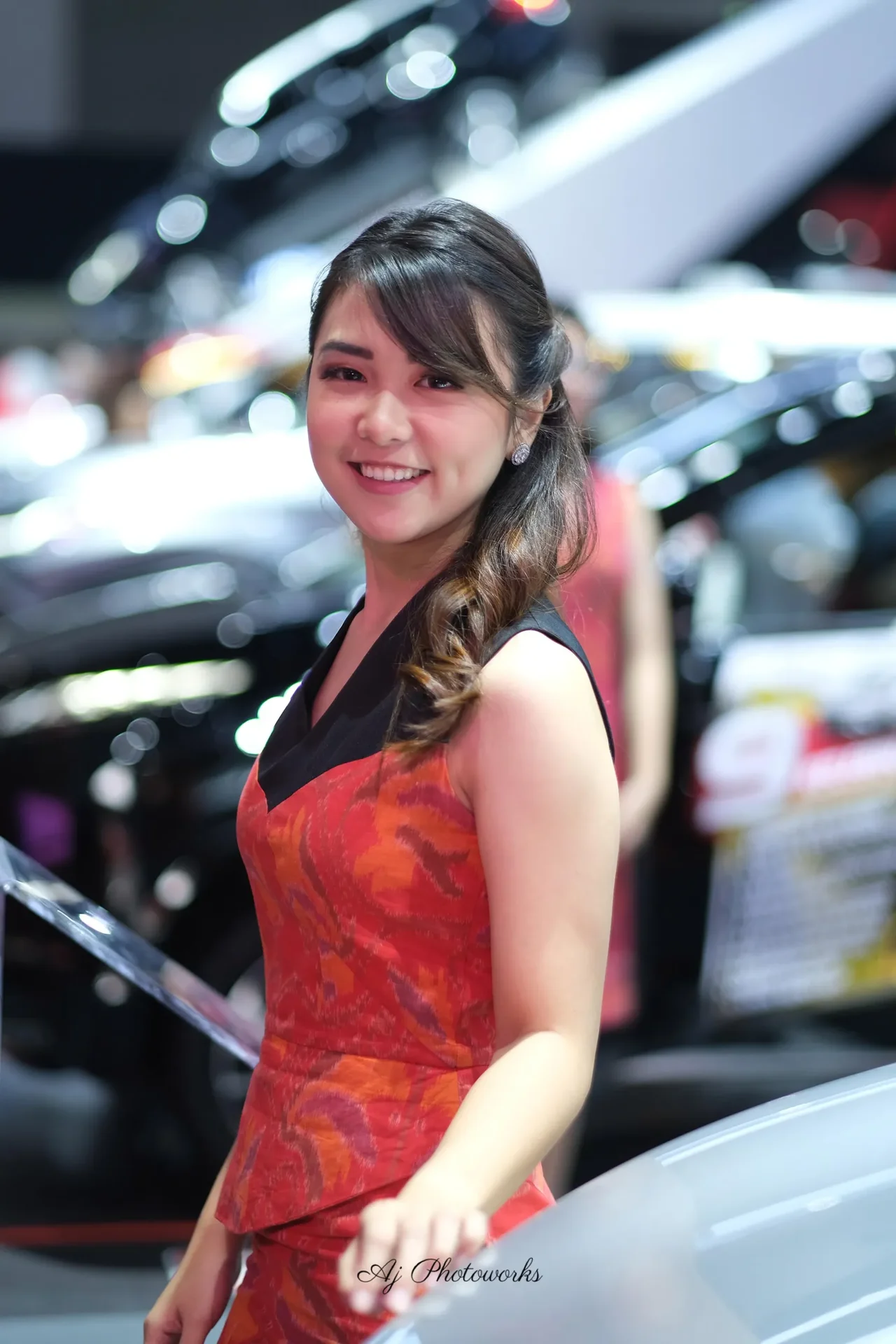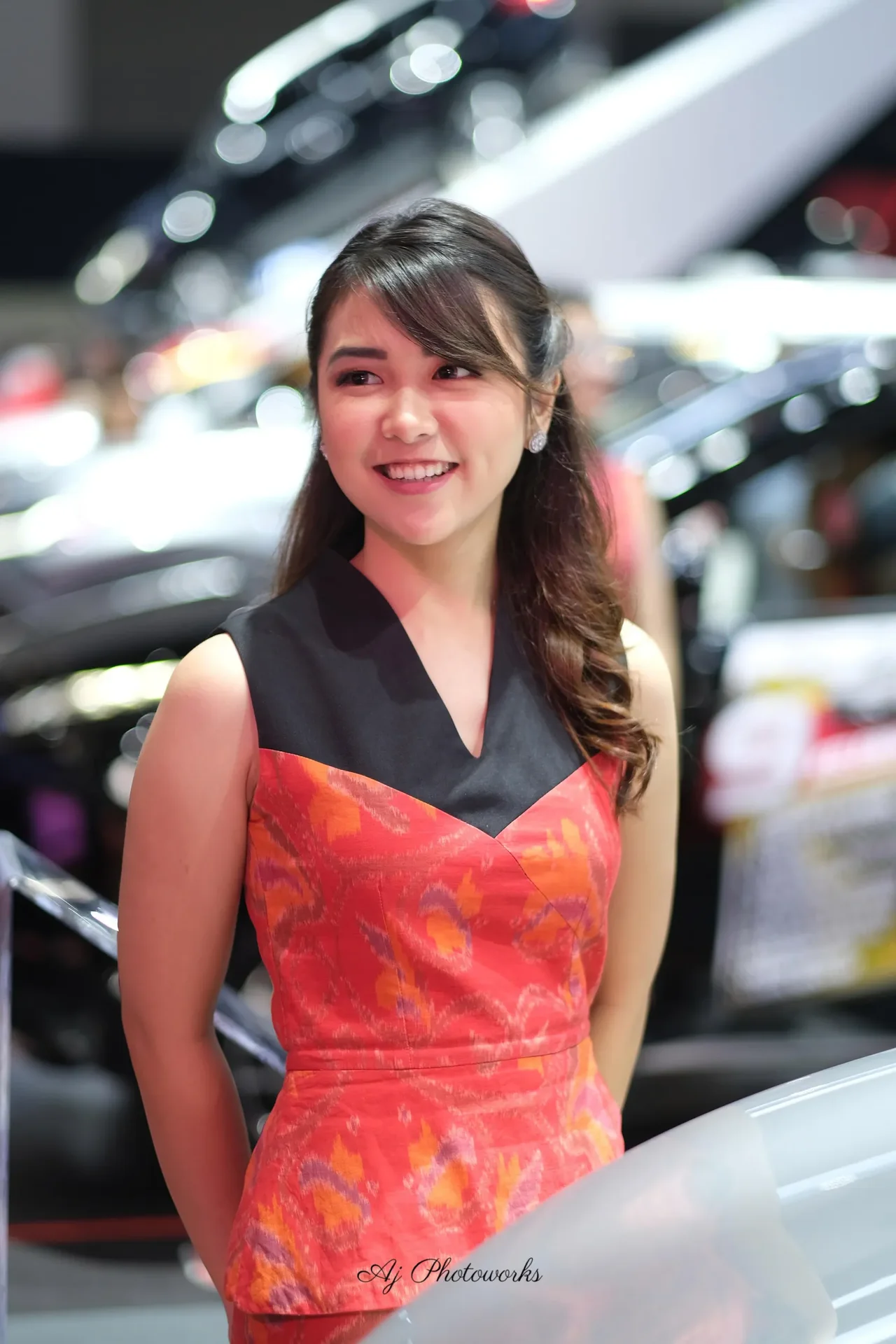 Vibrant colors and elegant design take center stage in this dynamic fashion shot, set against the backdrop of a bustling car show. The model's radiant smile and intricate dress detail create a striking focal point.