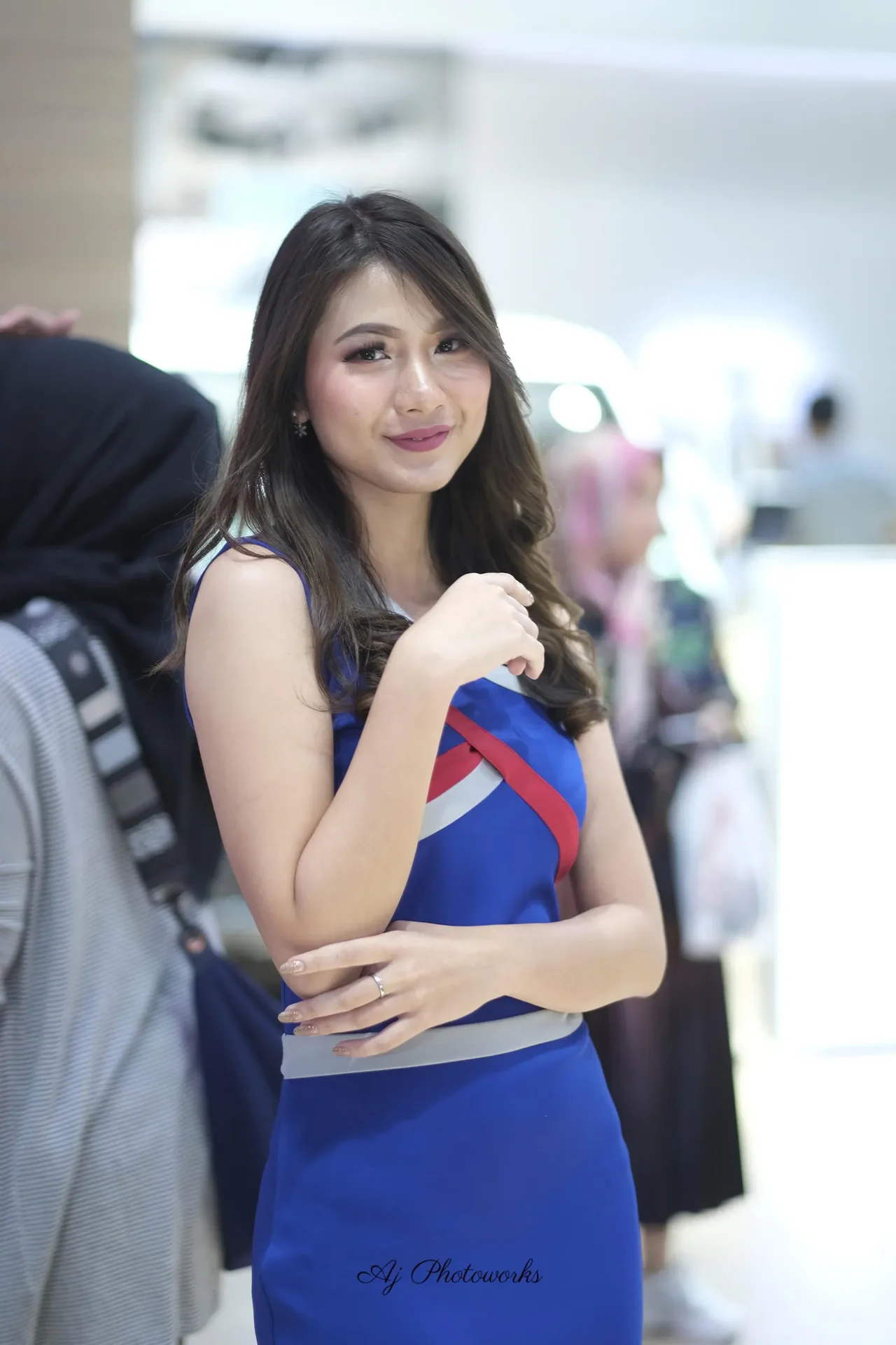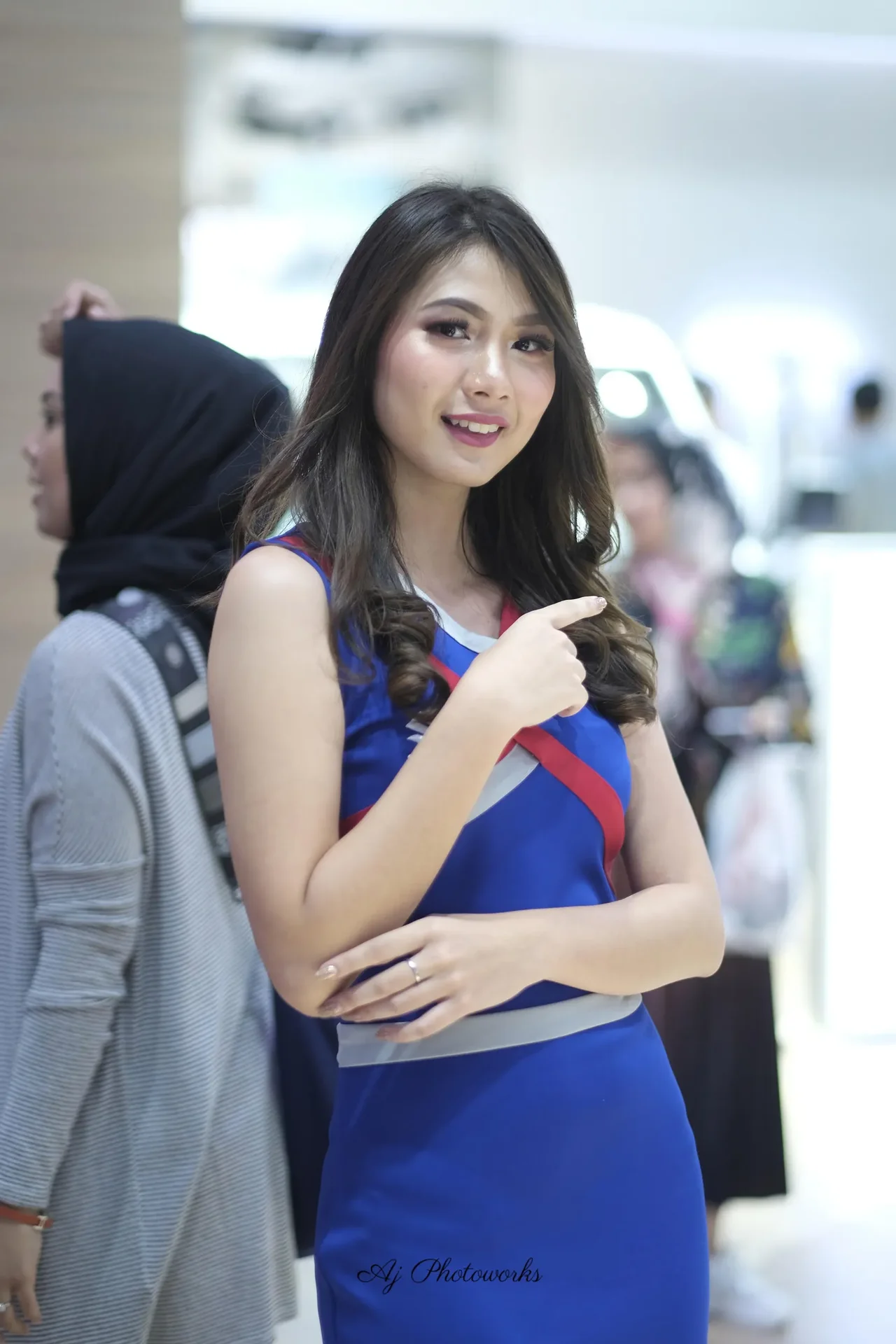 A young woman poses confidently in a vibrant blue and red Suzuki-branded dress within a modern car showroom, blending fashion and commercial aesthetics under bright, natural lighting.
