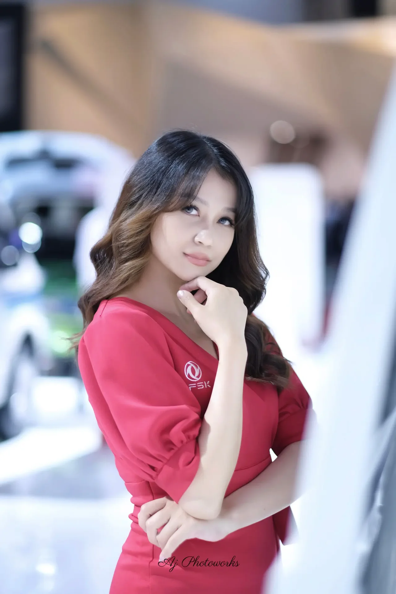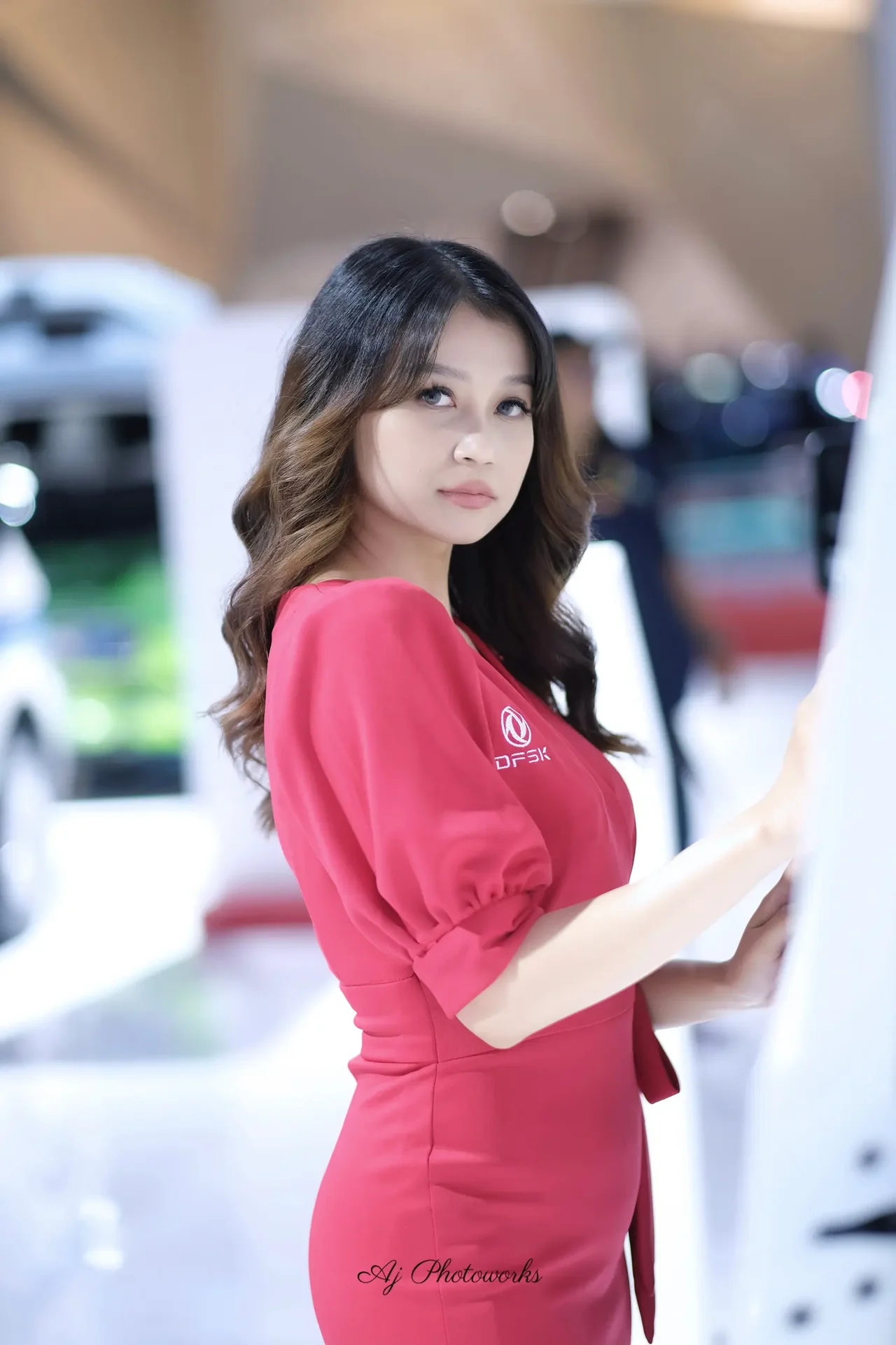 Elegance and confidence at an automotive event, showcasing a vibrant red ensemble against a dynamic industrial backdrop.