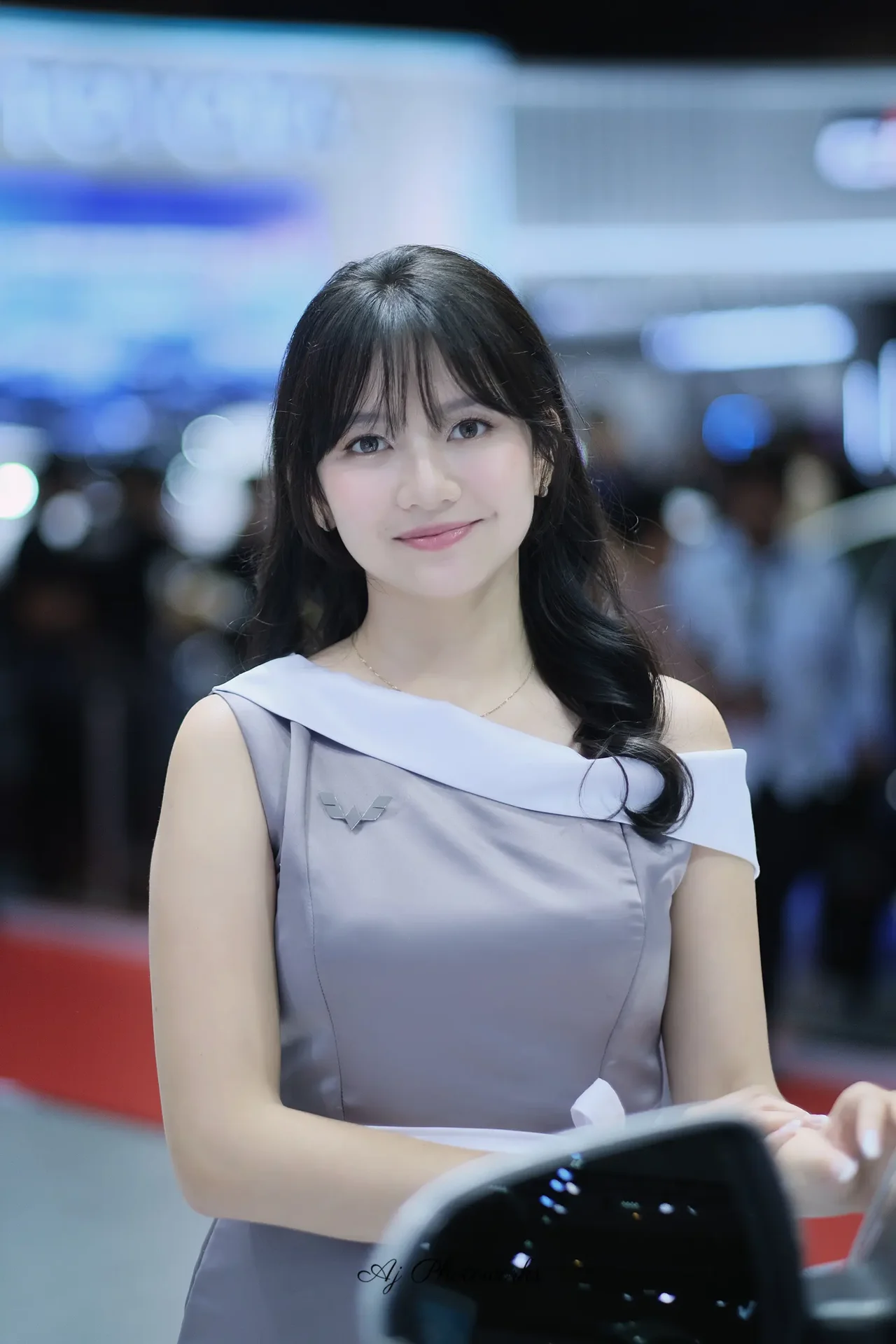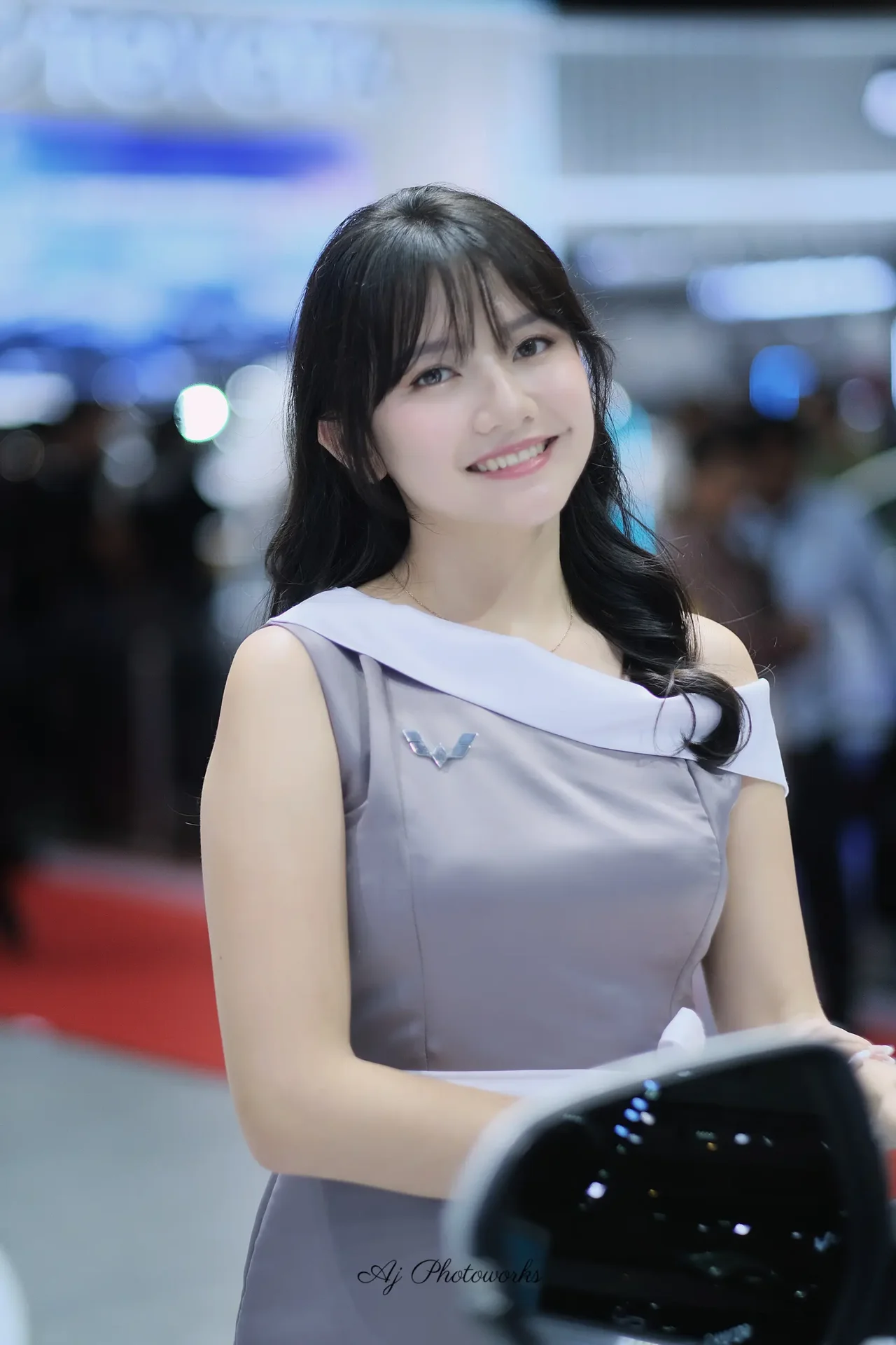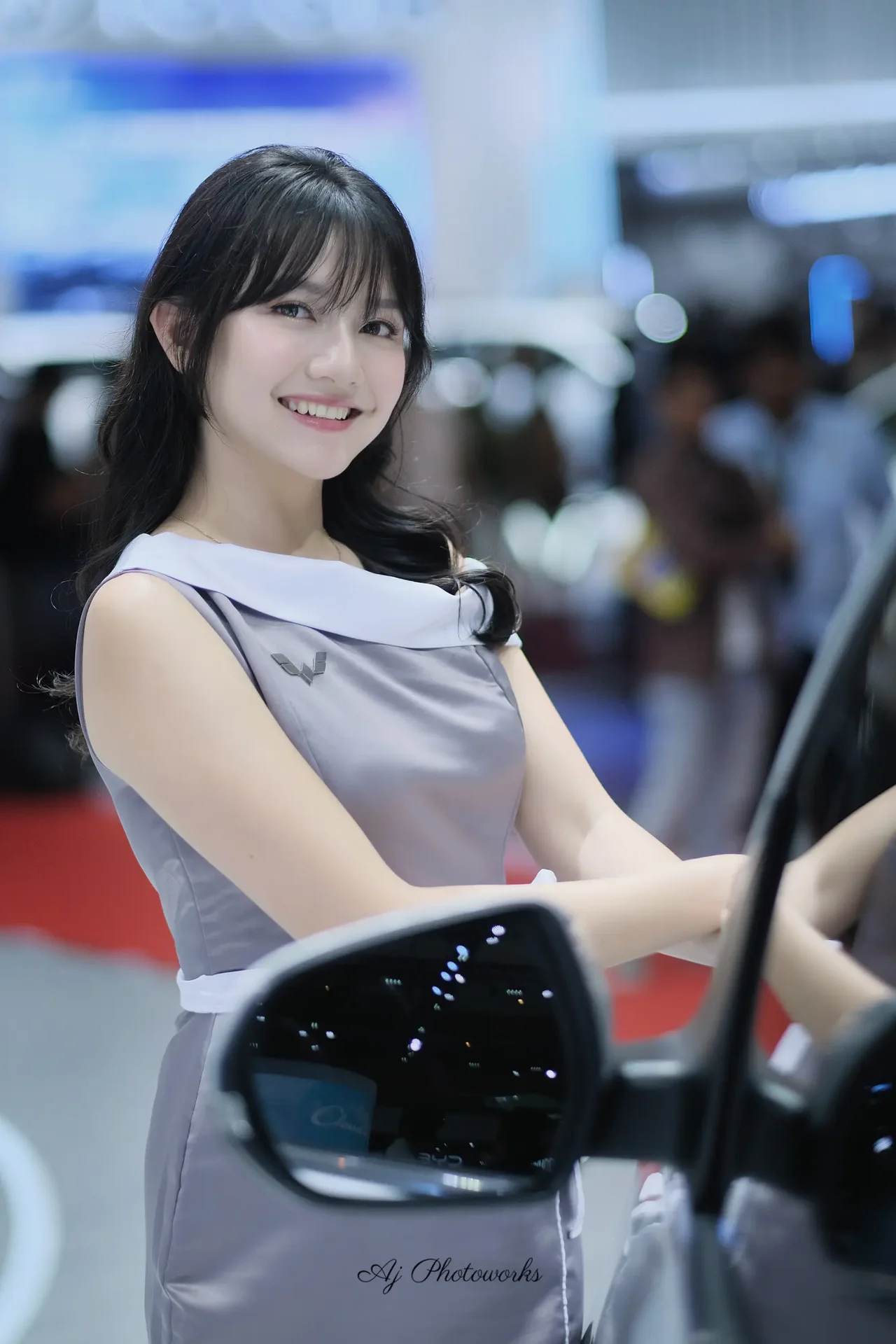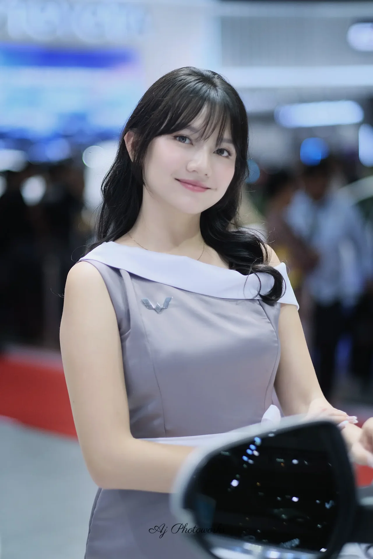 A sophisticated portrait of an Asian woman in a dress at an automotive exposition.