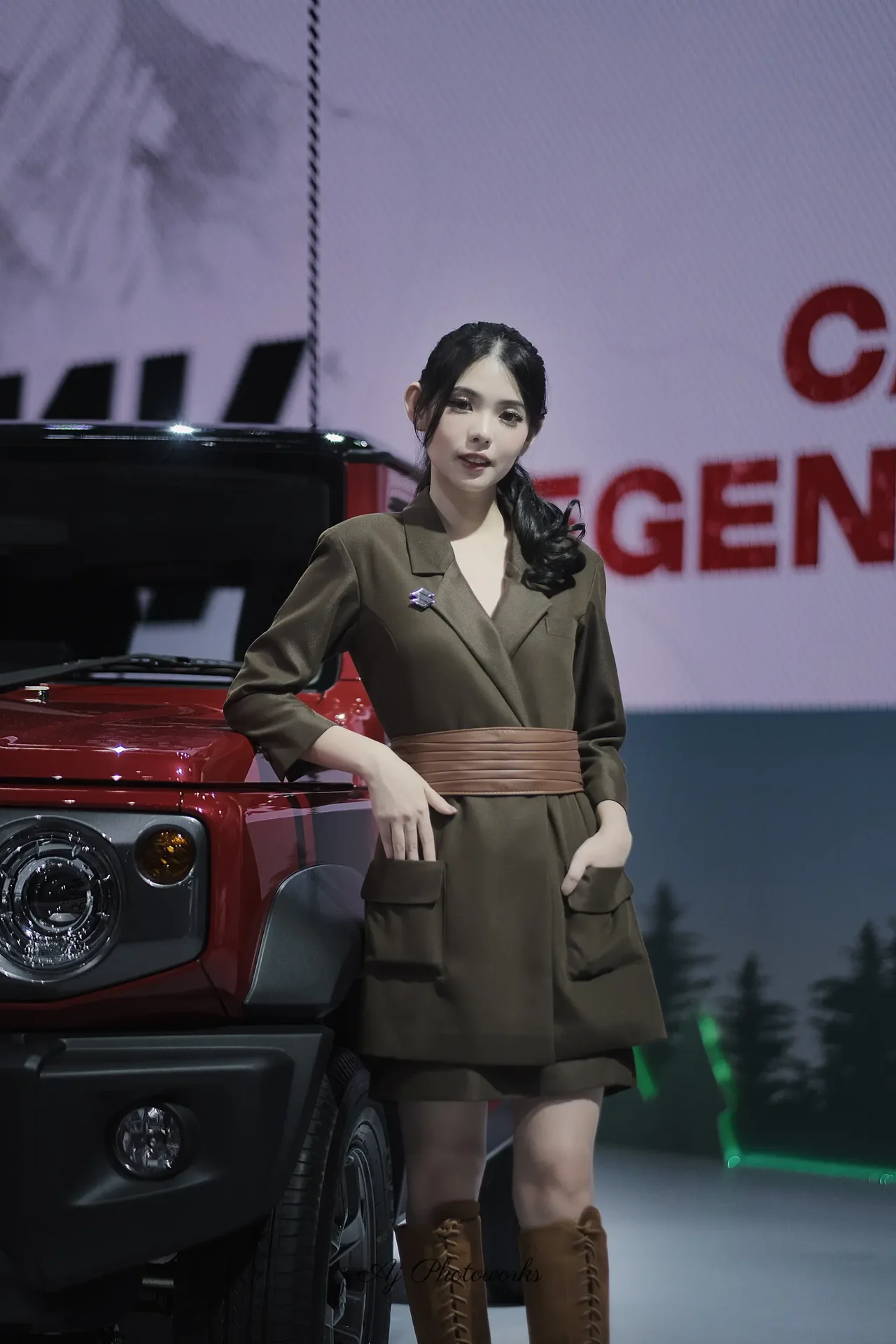 A woman in an olive-green military-inspired ensemble with a brown belt and lace-up boots poses beside a red Jeep Wrangler in a studio setting featuring a forest and mountain backdrop, emphasizing fashion editorial with spotlight lighting.