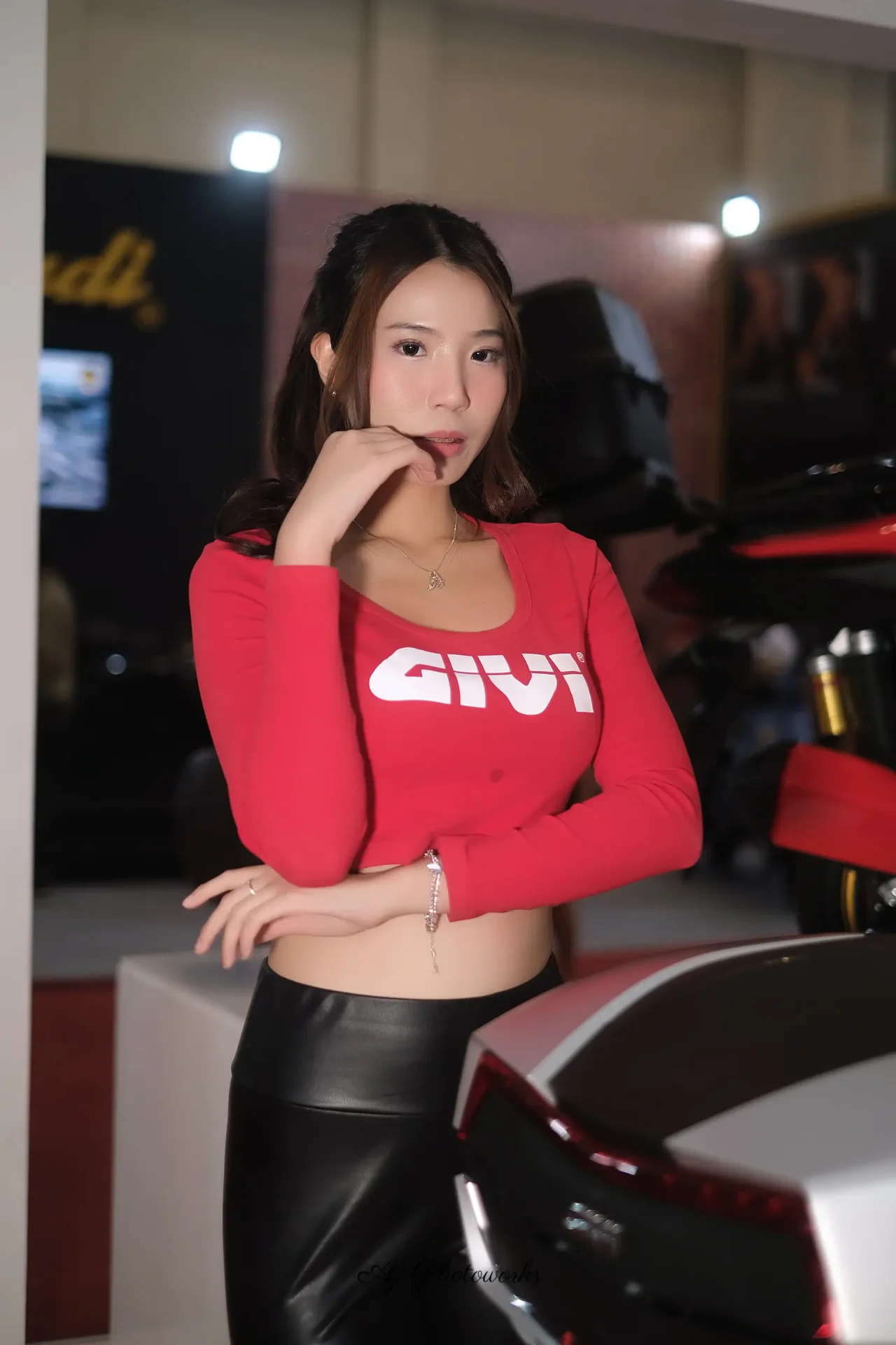 Red long-sleeve tunic with bold branding meets sleek motorcycle hardware under modern lighting.