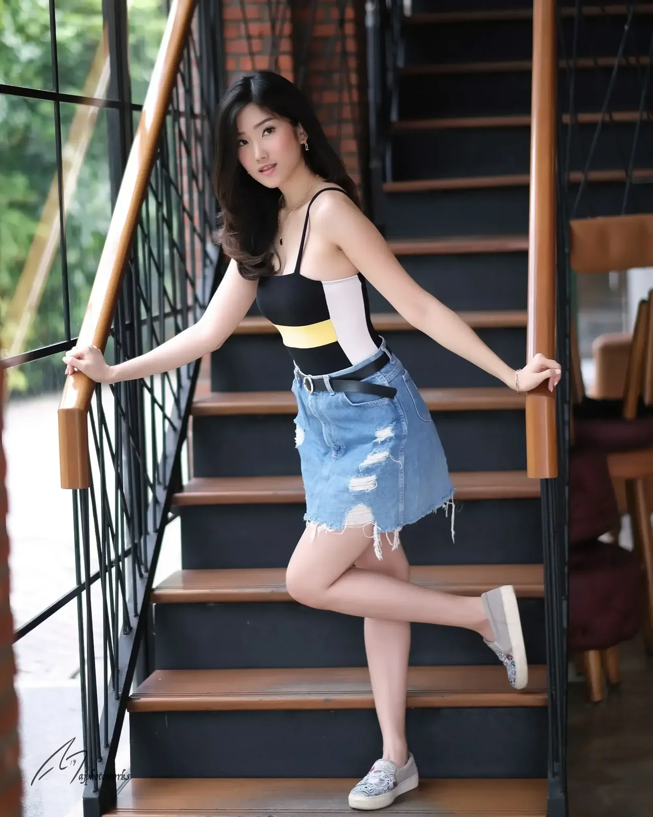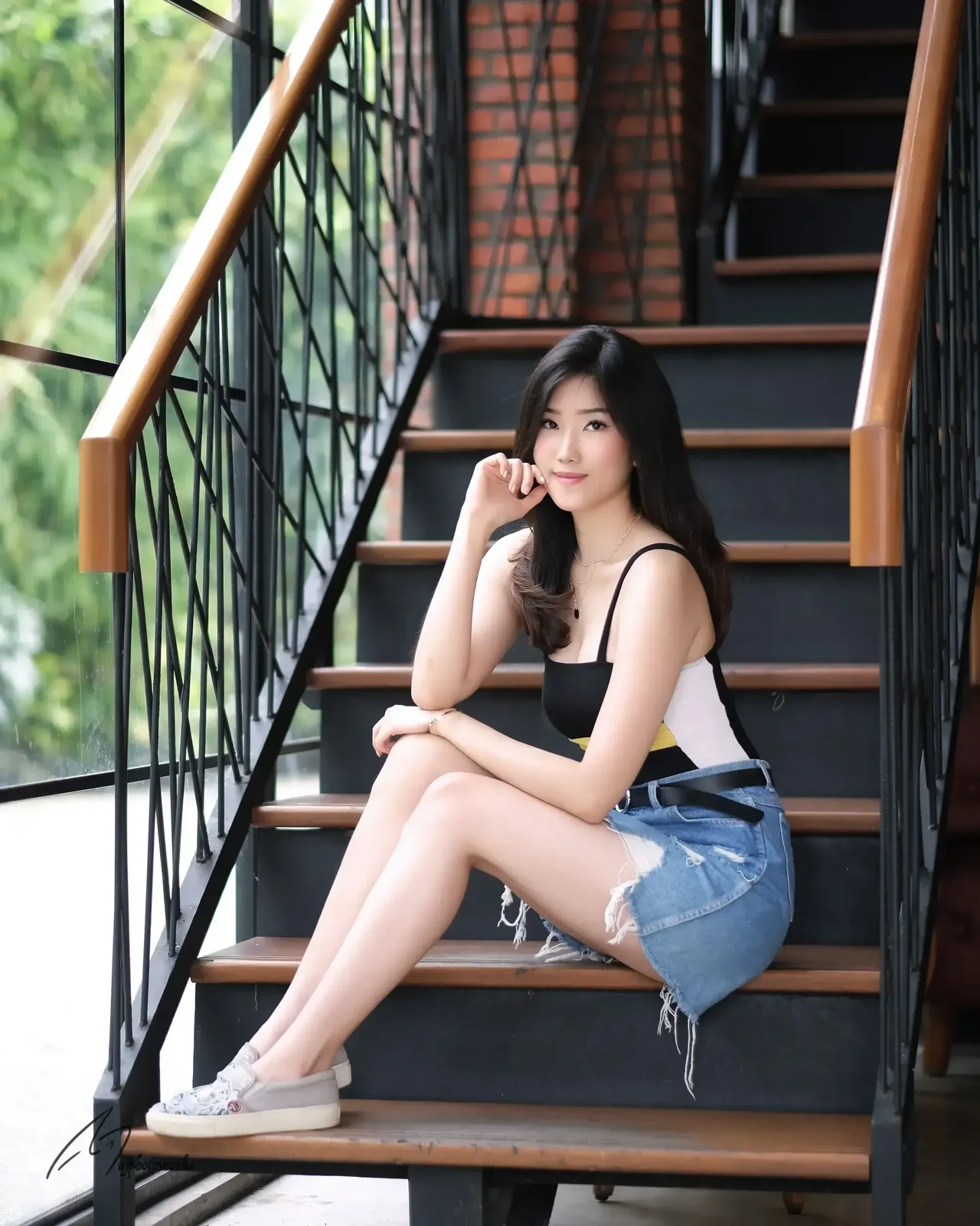 A confident young woman at an IT industry event, wearing a black and yellow crop top and distressed denim shorts, poses on a wooden staircase with iron railings, exuding modern professionalism under warm, natural lighting.