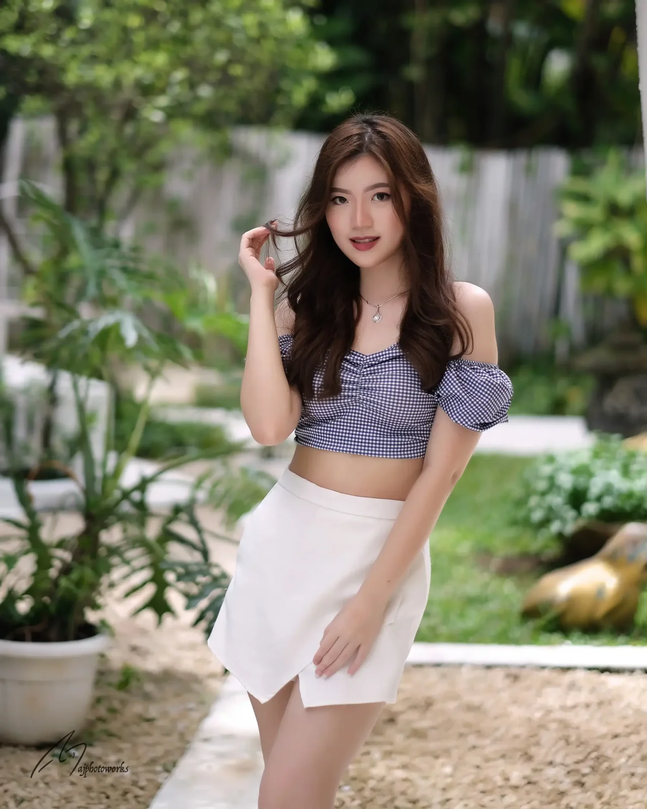 Effortless elegance captured in a sunlit garden retreat - where fashion meets tranquility.