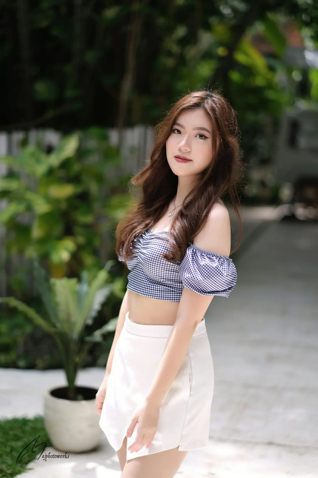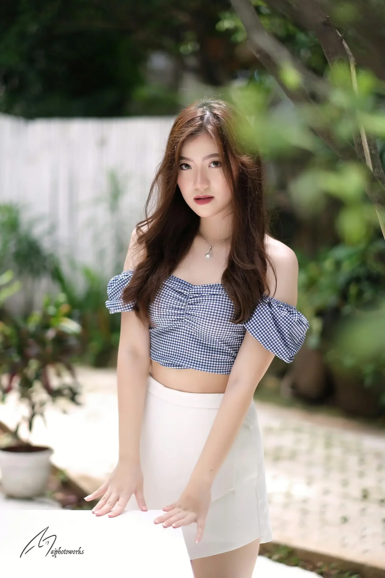 Casual chic meets natural elegance in a blend of checkered patterns and crisp white against sunlit greenery.