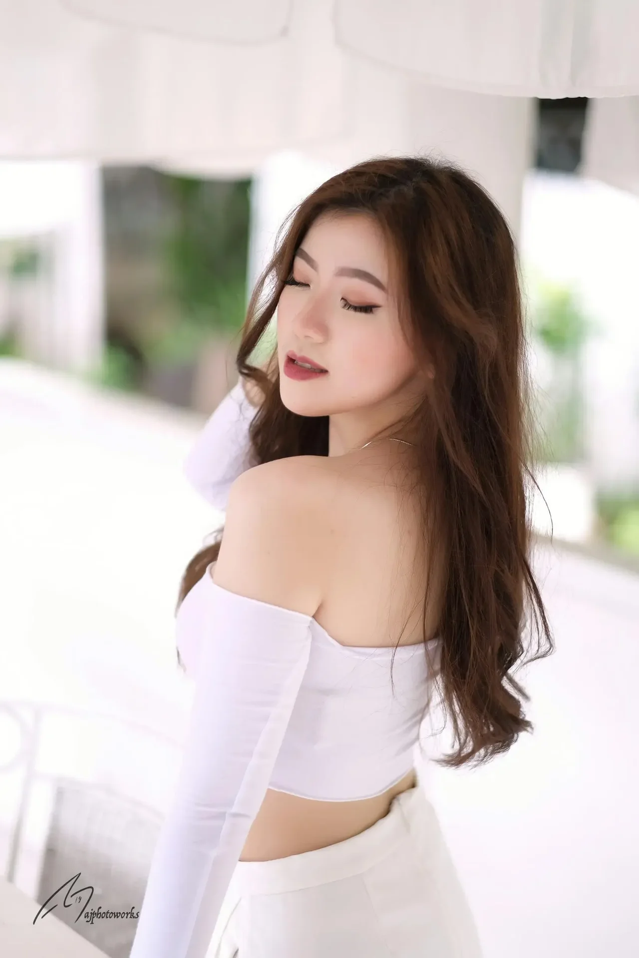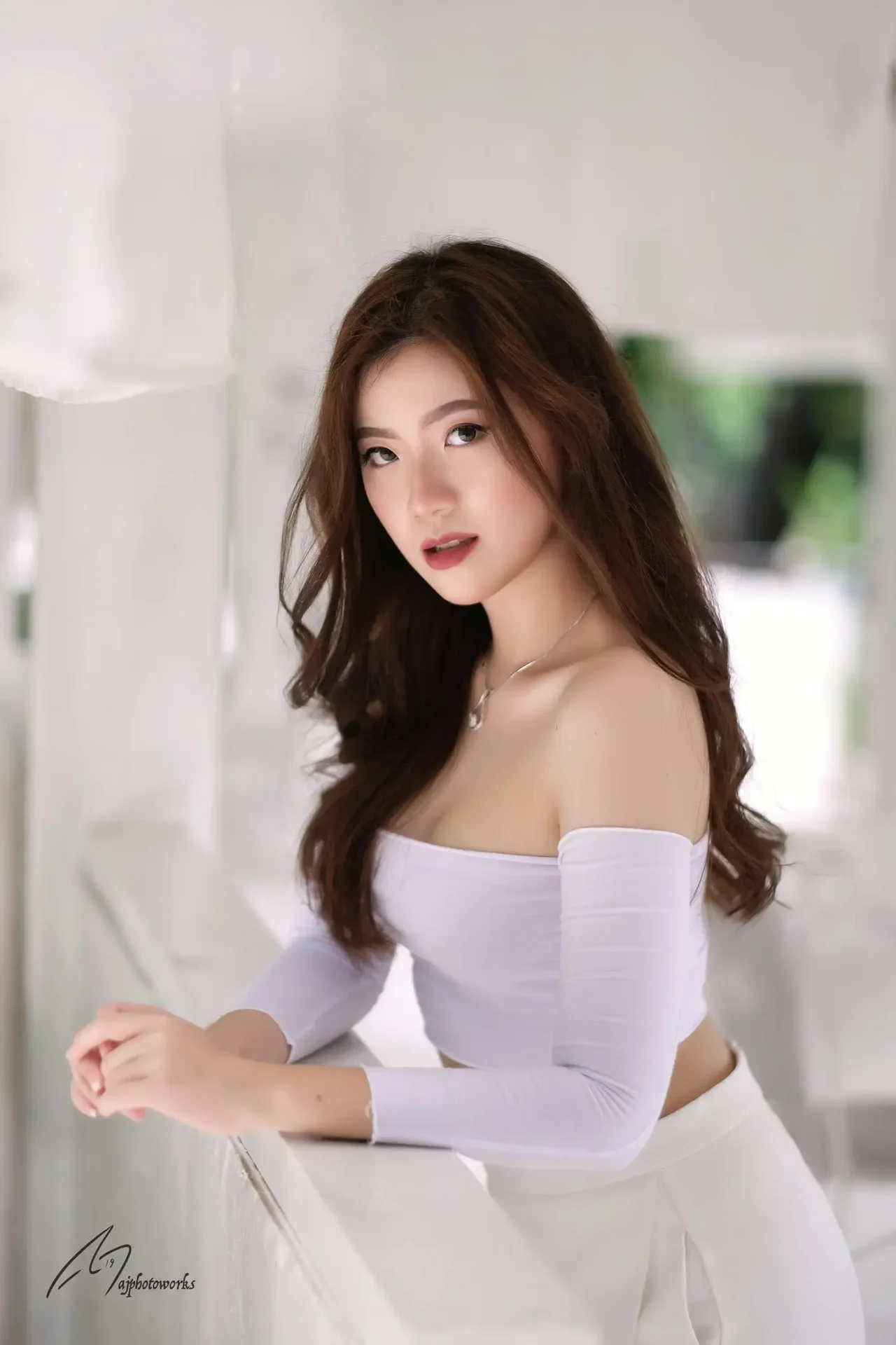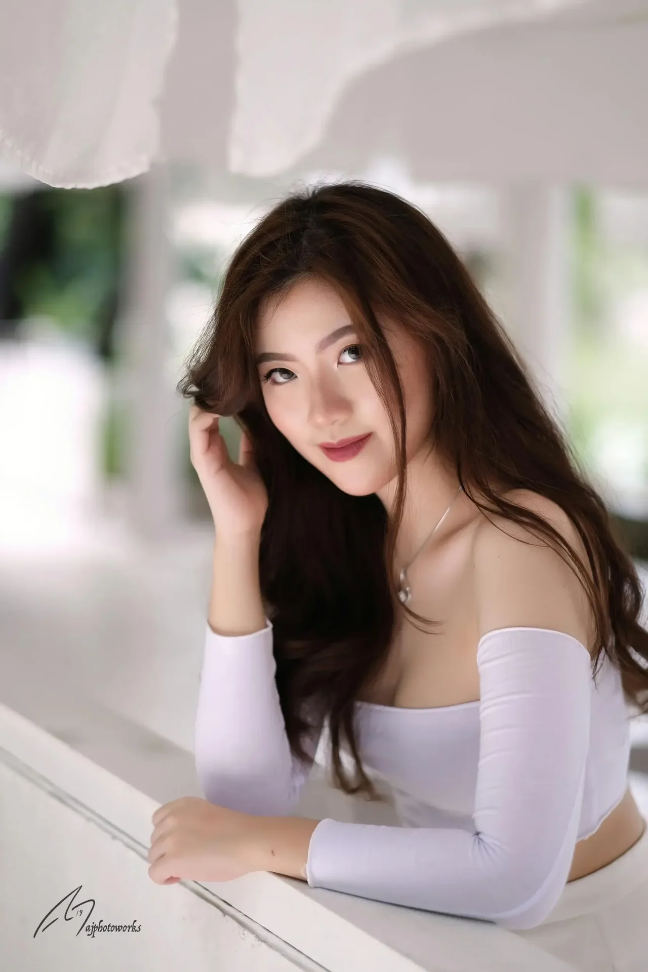 Elegance in white: A stylish fashion portrait captures poised moments in a sunlit café setting