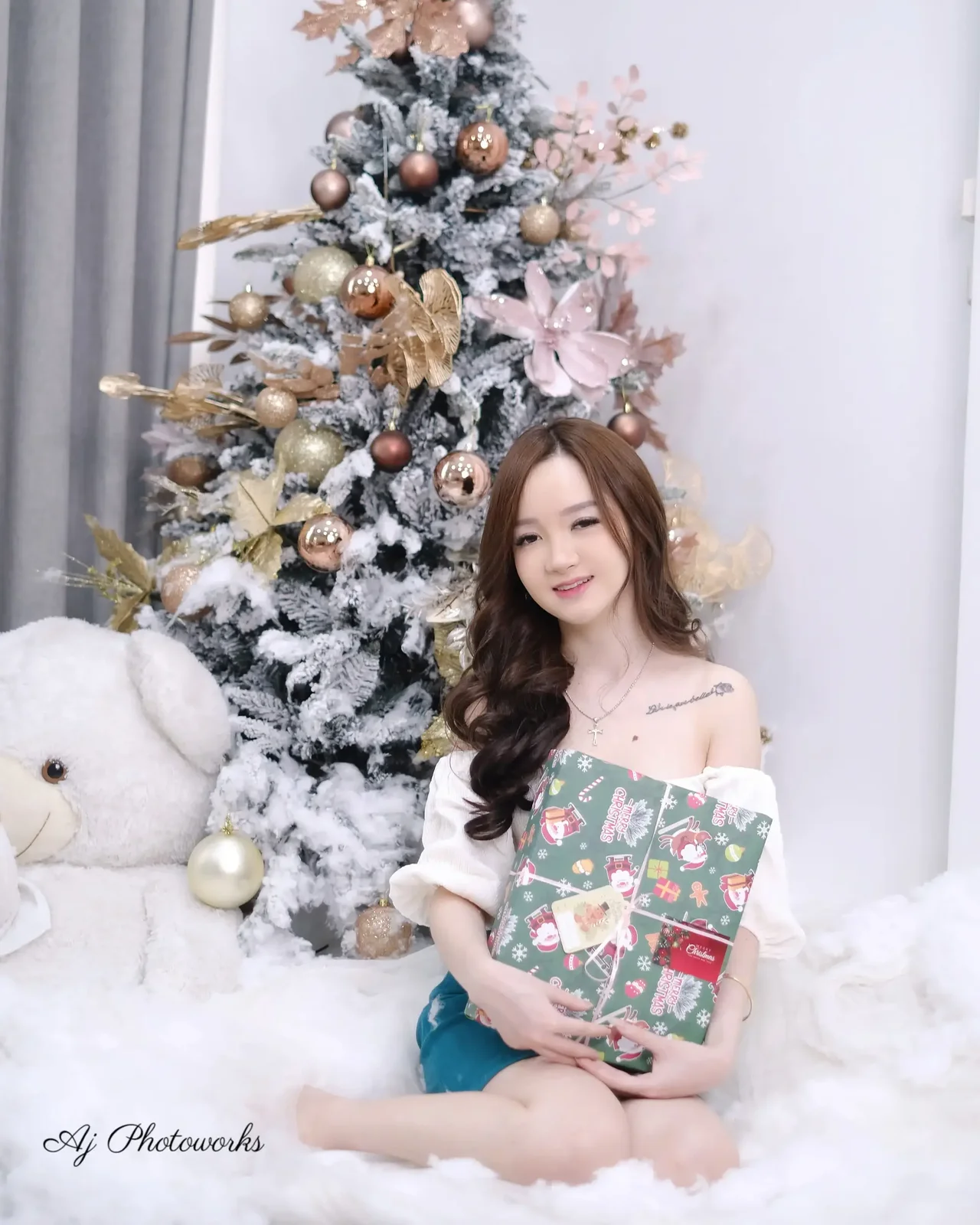 A festive holiday photoshoot featuring a woman in a white lace top and denim skirt, posing around a decorated Christmas tree with golden ornaments, holding a wrapped gift, and lounging with a Santa plush on a fluffy white surface.