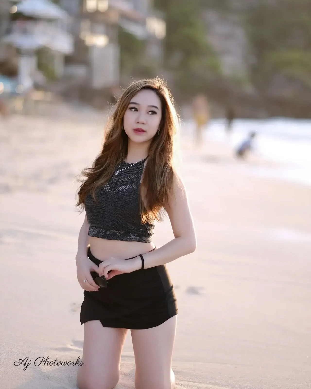 Elegance meets the serene beach at golden hour as the model poses with sophisticated charm amidst natural textures and warm hues.