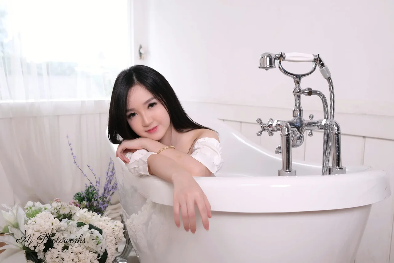 The colors of the scene—the calm white bathtub, the crisp off-shoulder sweaters, and the sunlit balcony—create a serene elegance. Each pose captures a moment of quiet confidence and soft allure.