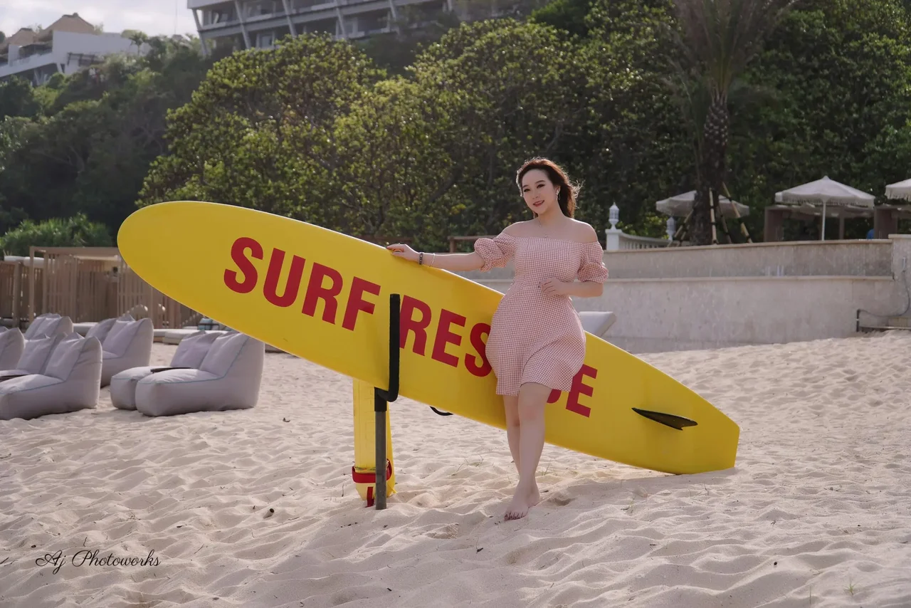 Sunlit elegance meets coastal charm: a woman in a delicate pink-white checkered dress stands on a sandy beach, flanked by gentle breezes and mounted rescue equipment.