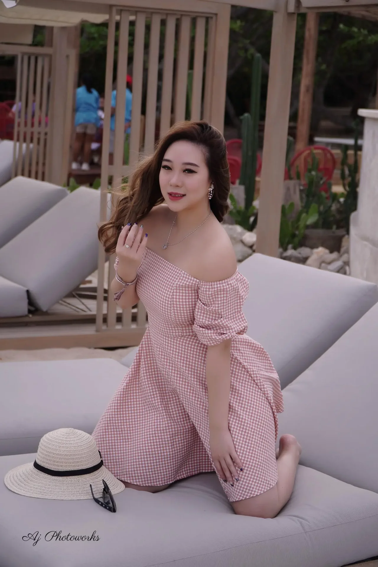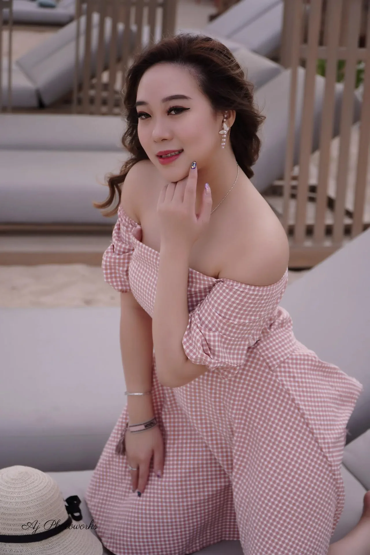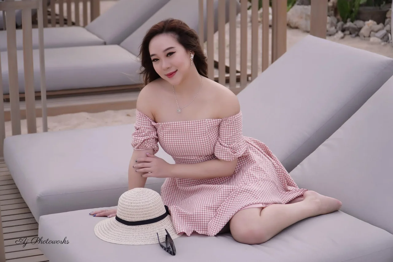 Elegant outdoor portrait of a woman in a red and white checkered off-shoulder dress, accessorized with a straw hat and sunglasses, posing among bamboo railings and lounge chairs with a water fountain backdrop.