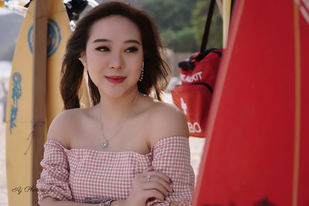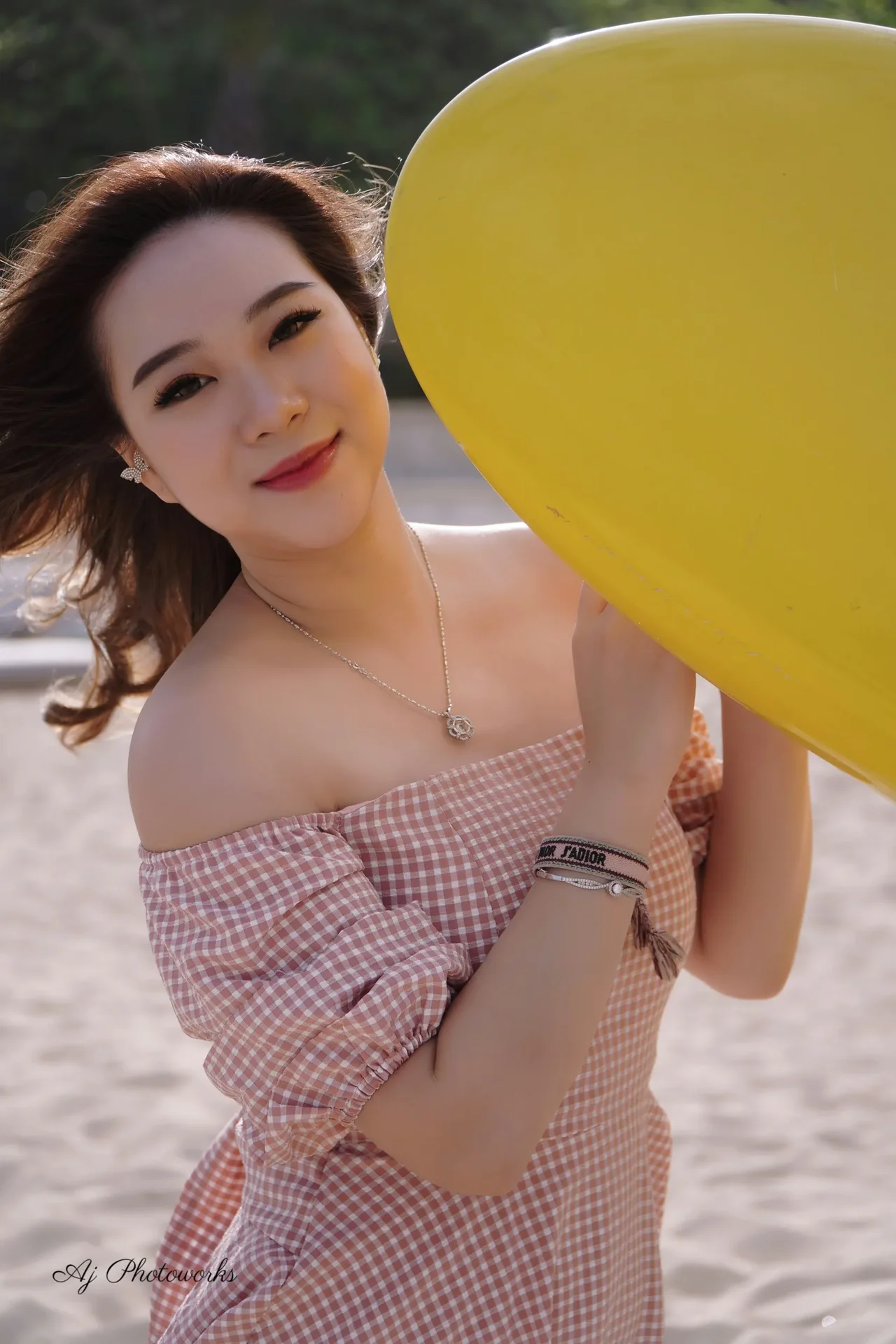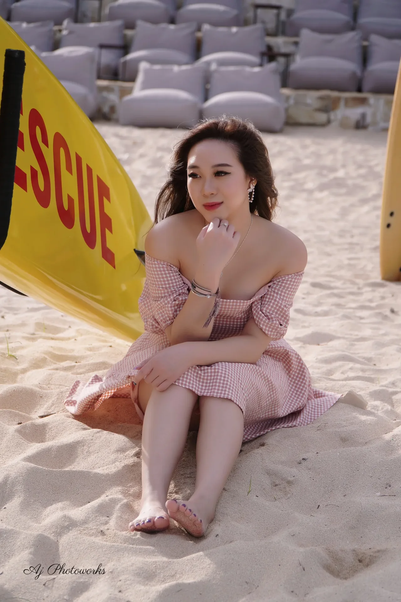 A vibrant portrait of a woman in a pink and white checkered dress across diverse beach and garden settings, showcasing fashion and lifestyle in warm, cinematic tones.