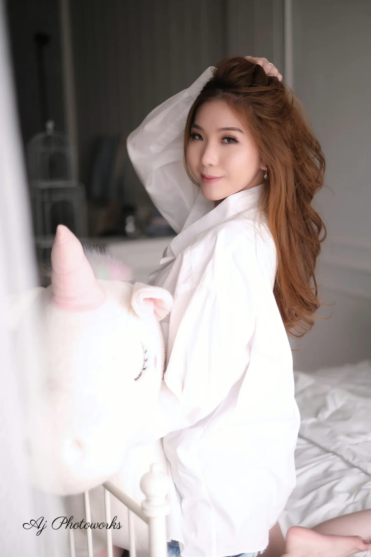 A serene model in a white robe reclines on a bed adorned with soft pillows, embracing a pastel unicorn plush, surrounded by a dreamy boudoir setup under warm studio lighting.