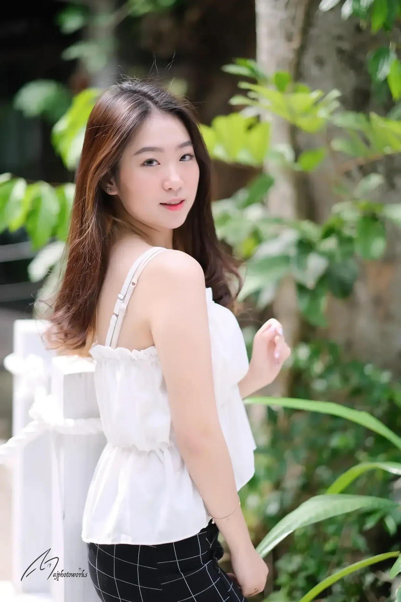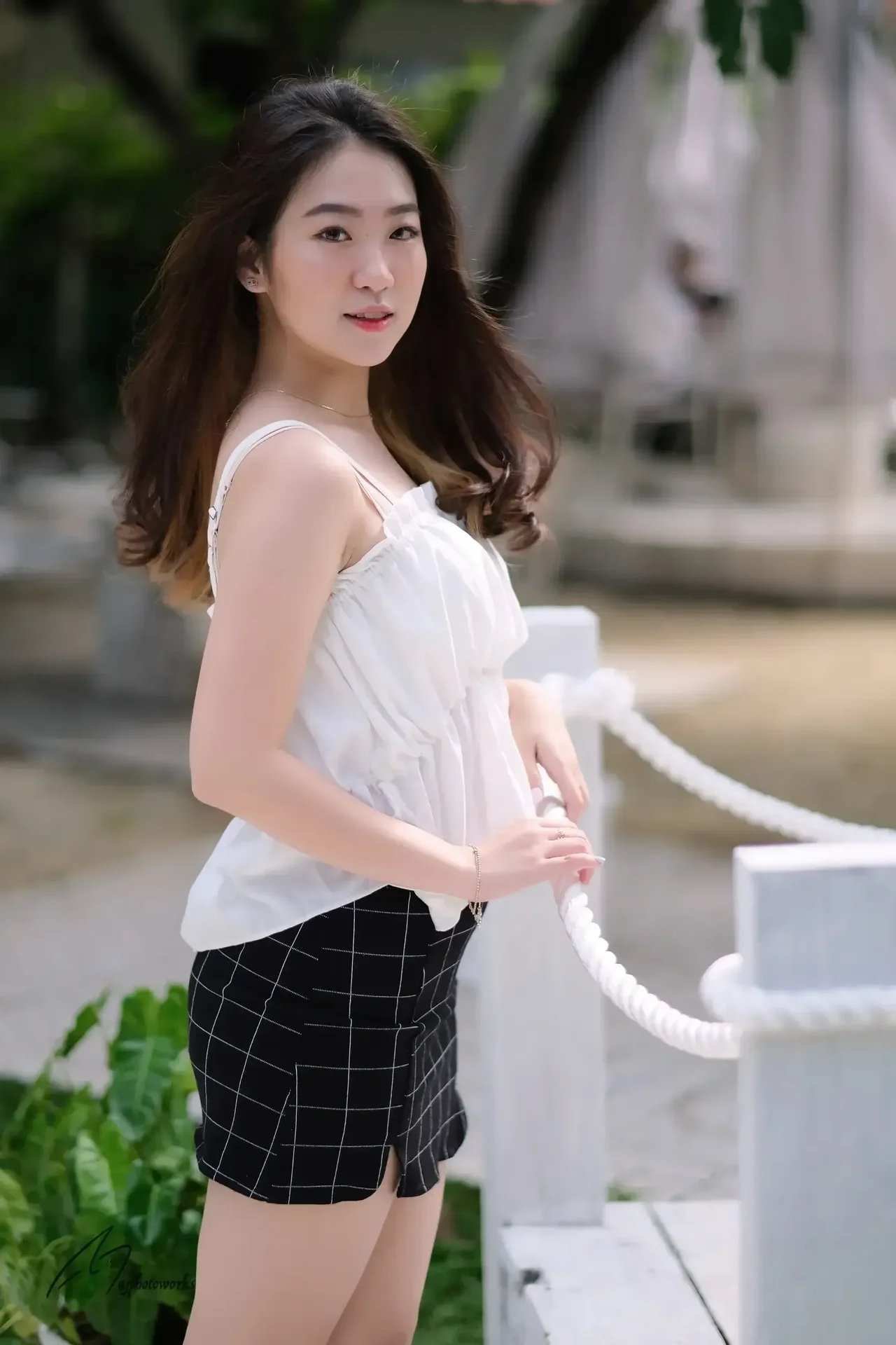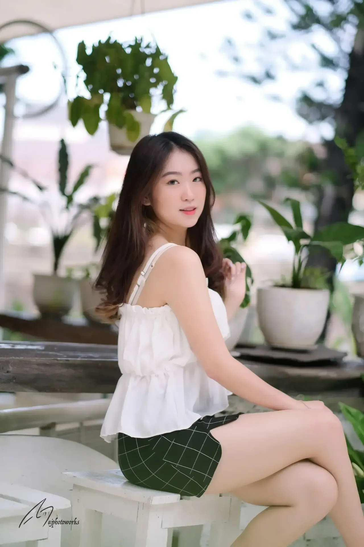 A young woman exudes modern elegance in a casual yet chic setting, blending natural beauty with urban sophistication.