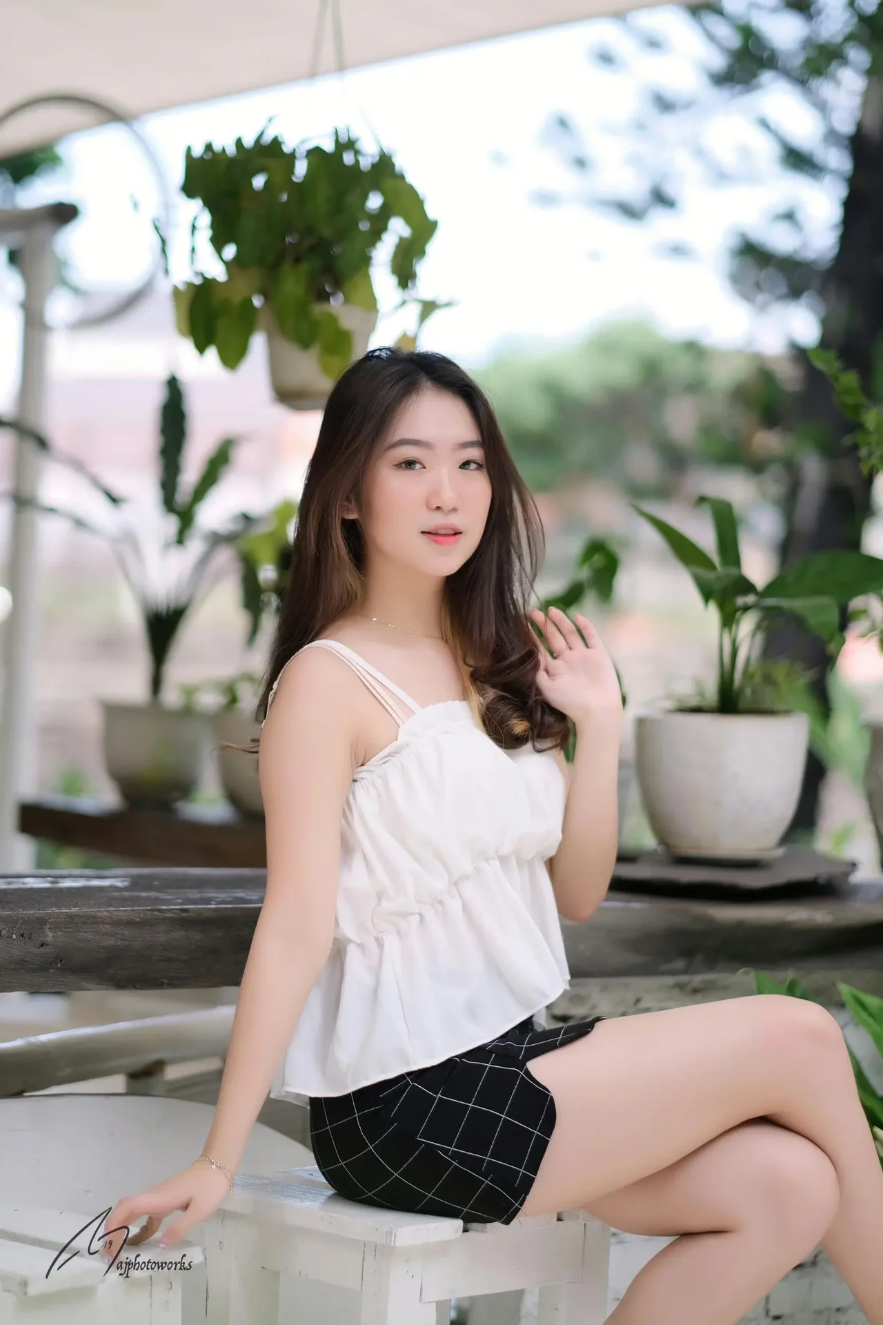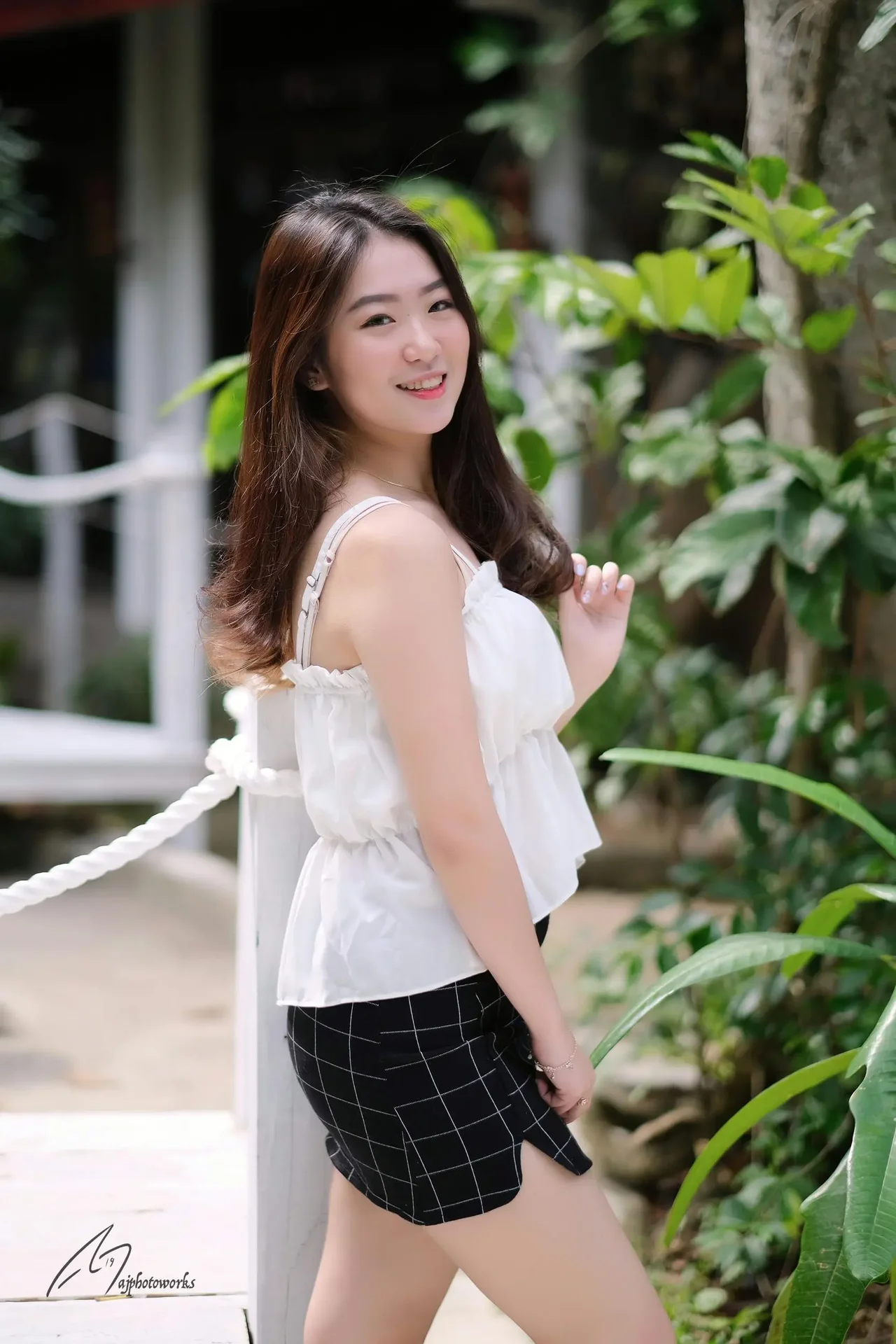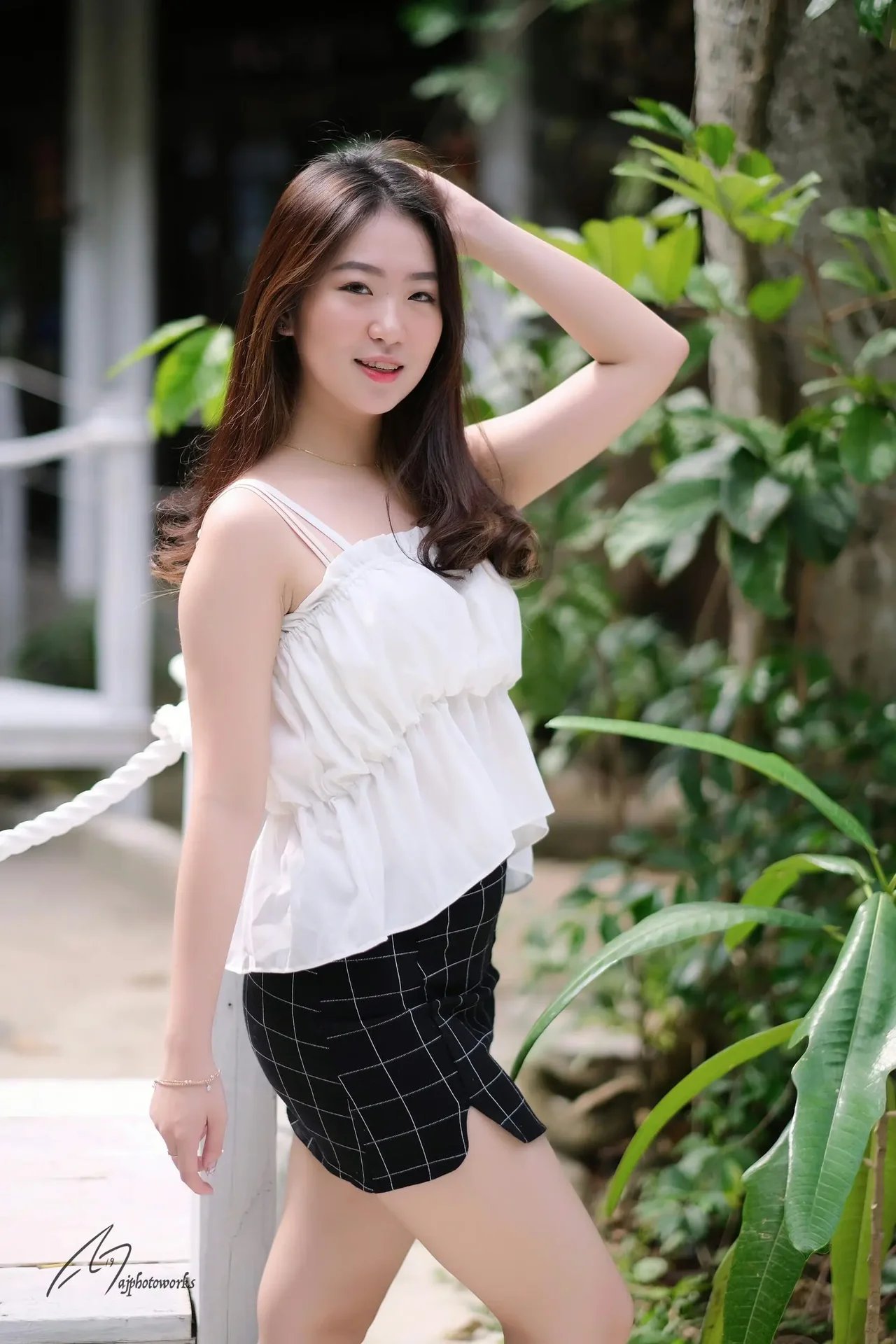 Elegant and vibrant outdoor portrait in a lush garden setting, showcasing a white lace top and black plaid skirt with natural lighting highlighting delicate textures.