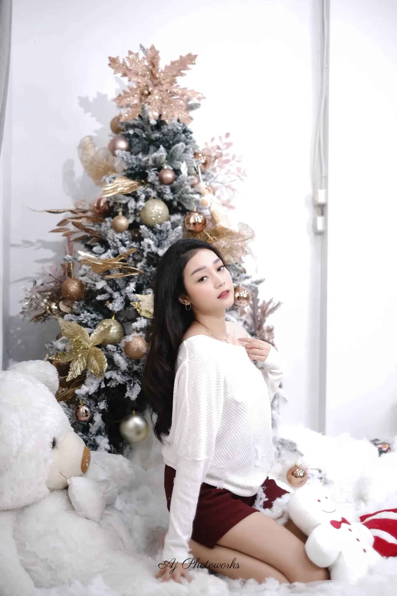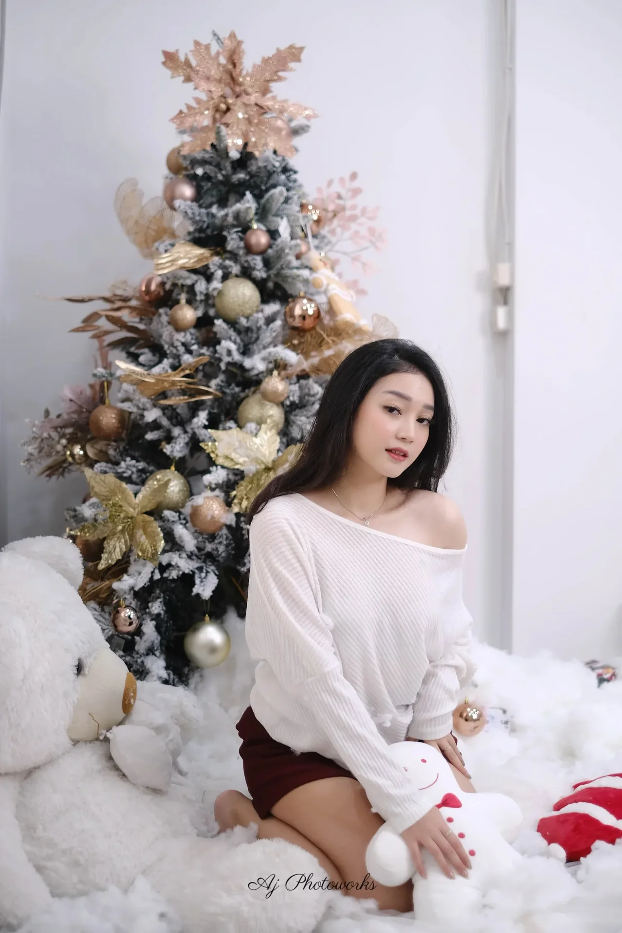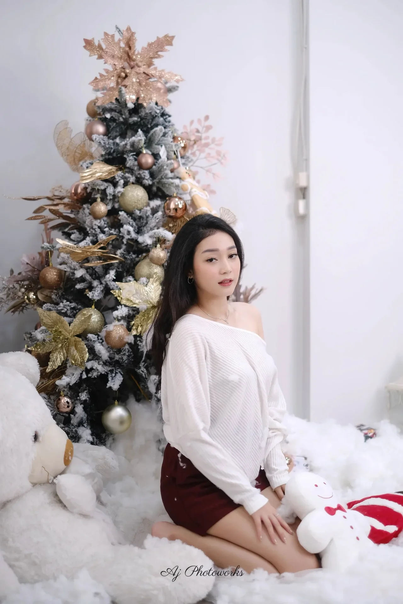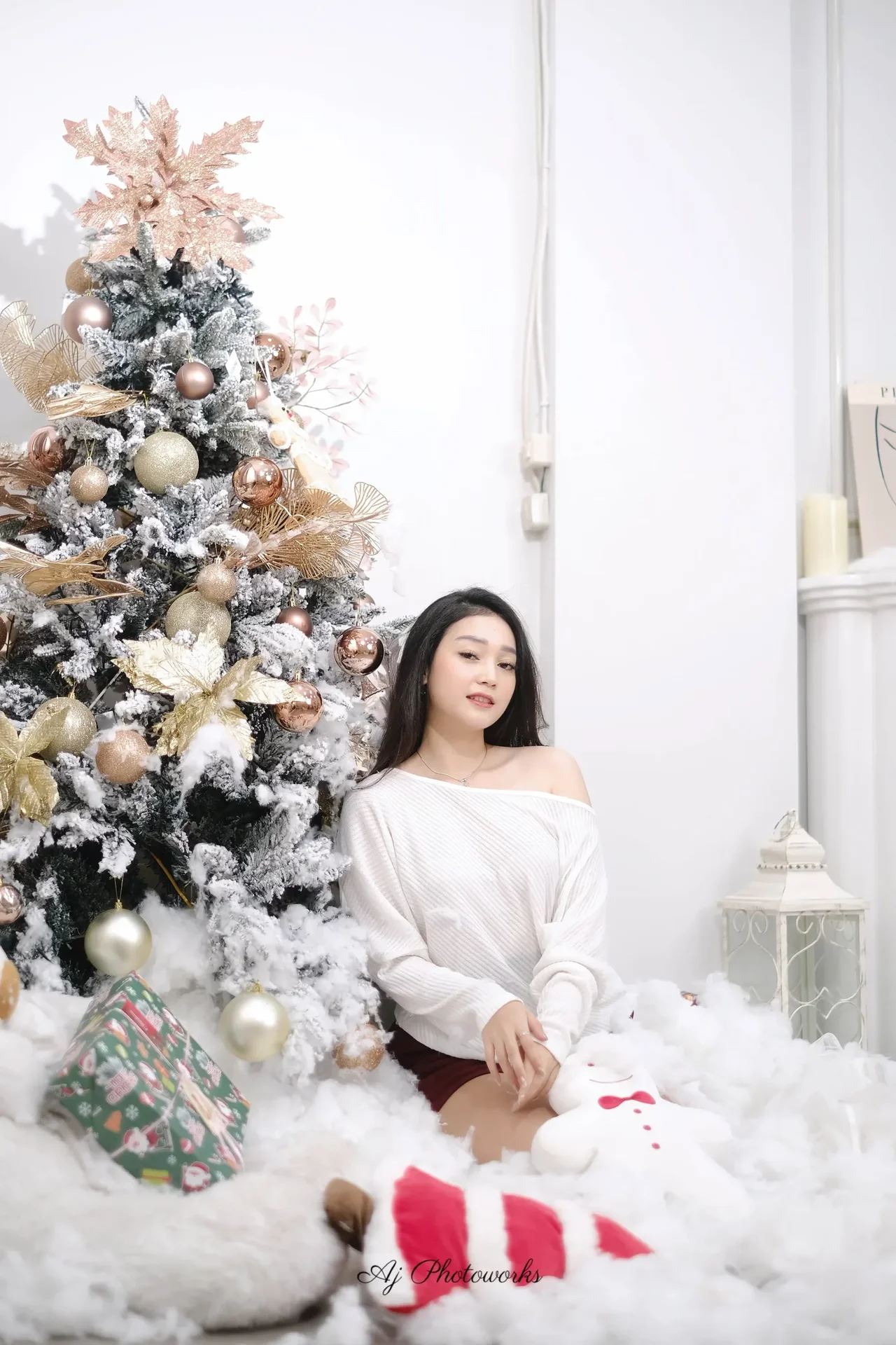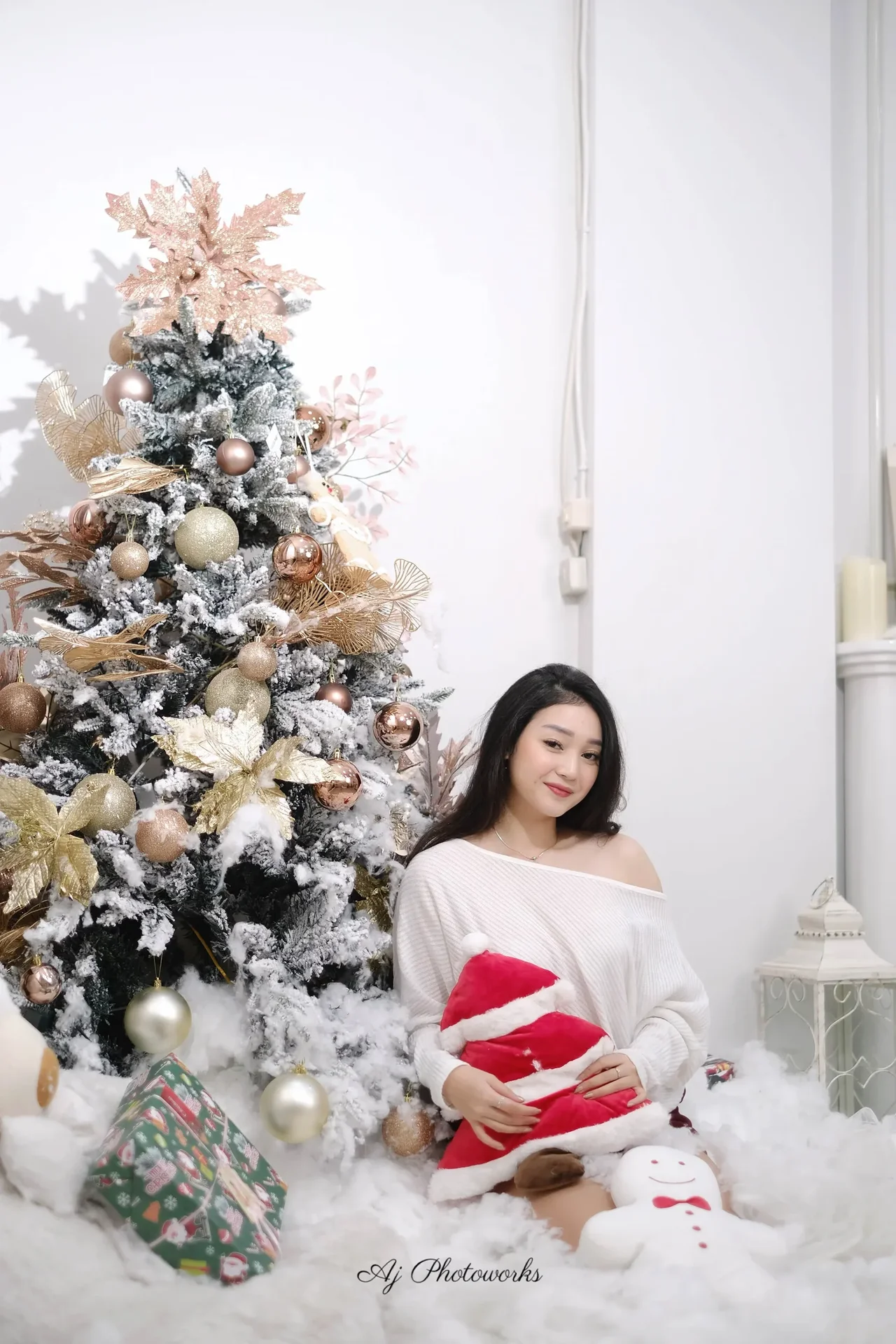 A festive holiday scene captured in a cozy studio setting, blending joyous Christmas elements with elegant fashion aesthetics.