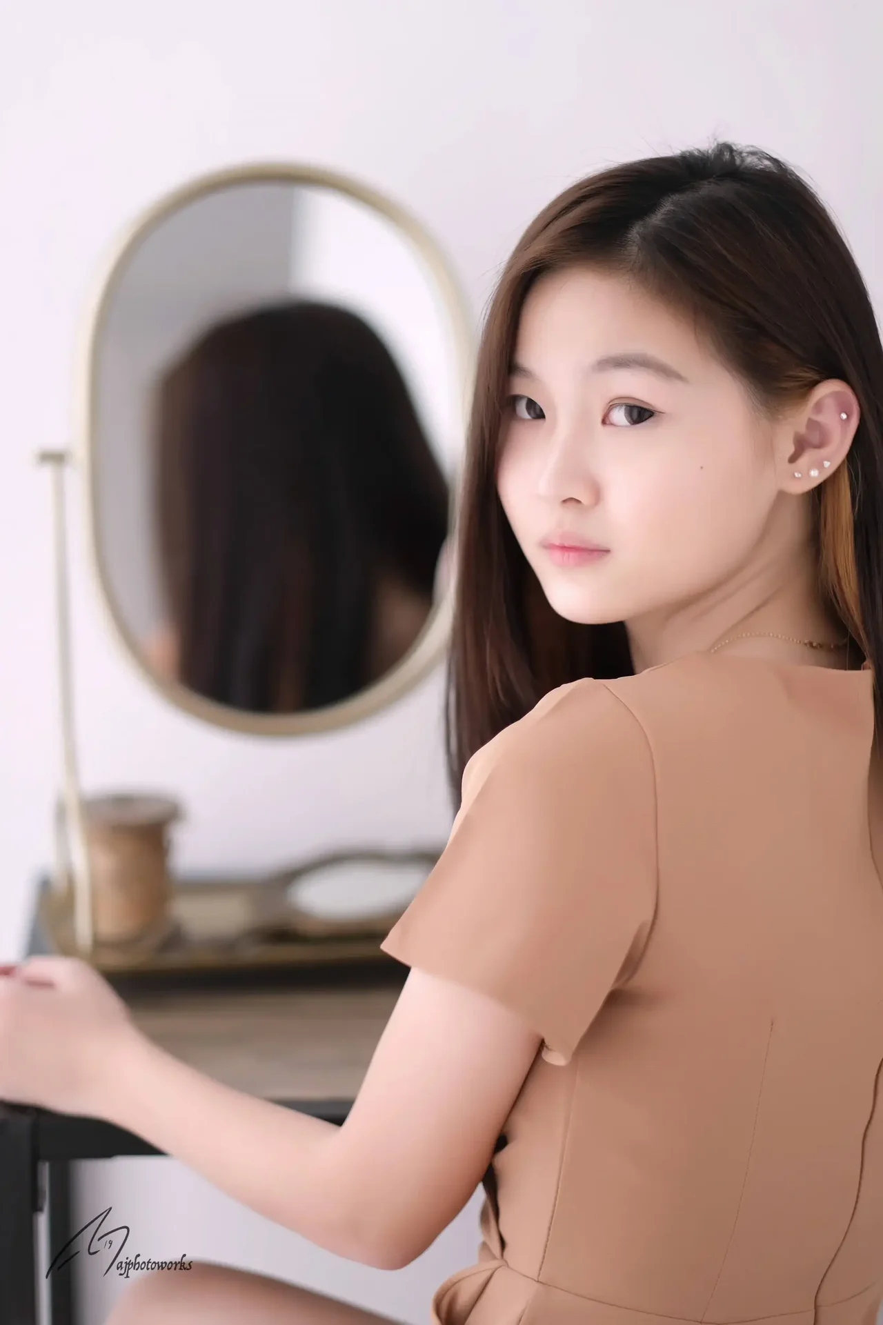 Elegant simplicity in a peach-toned dress, blending minimalist studio aesthetics with soft lighting and refined accessories.