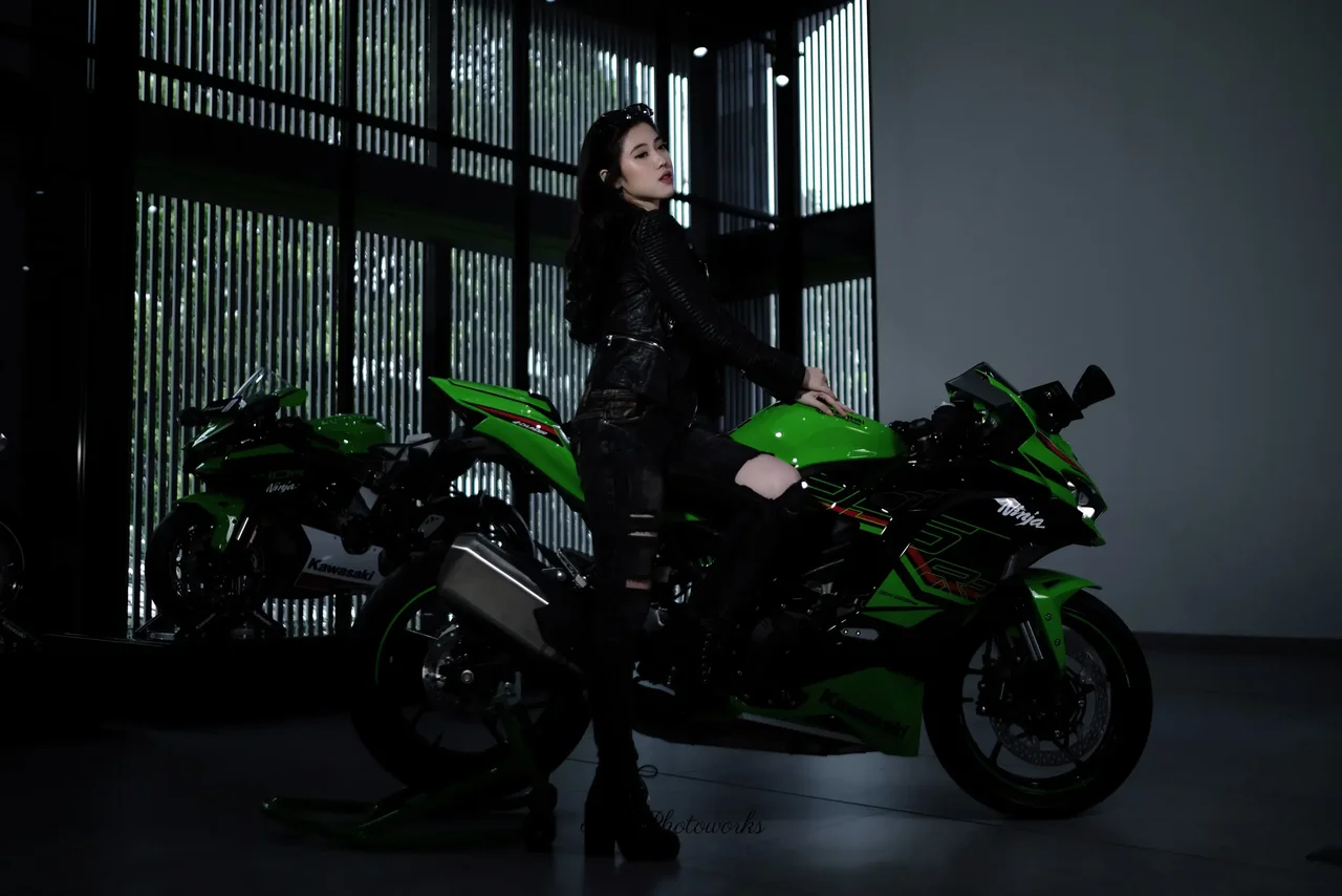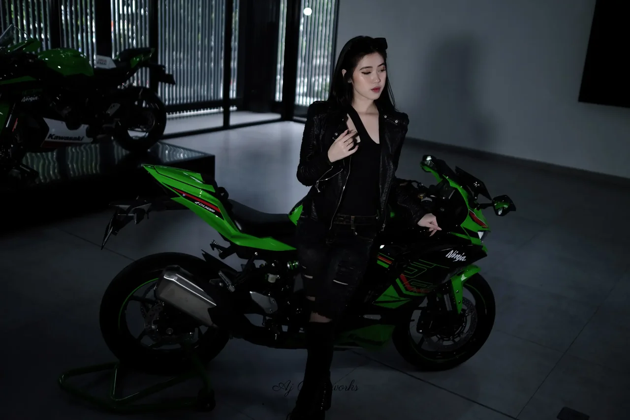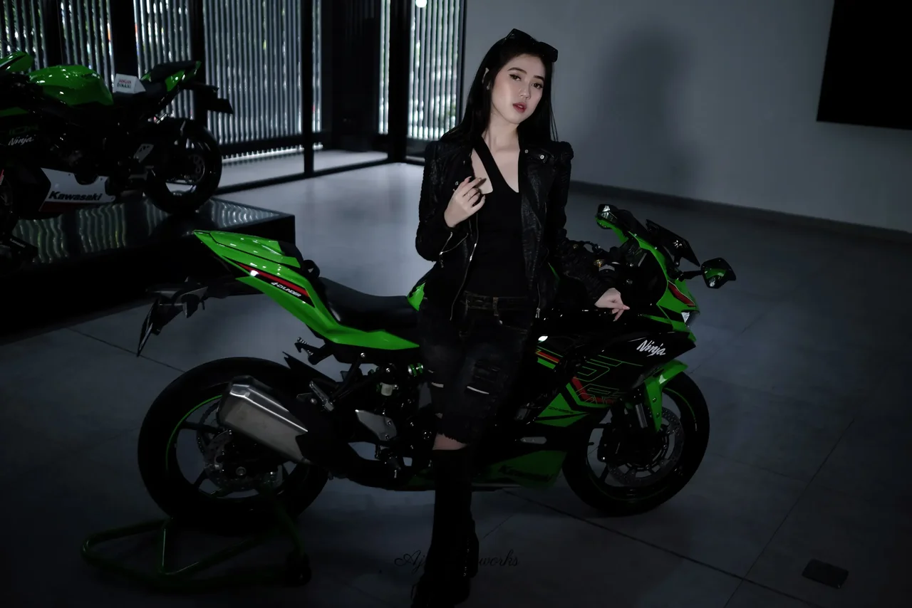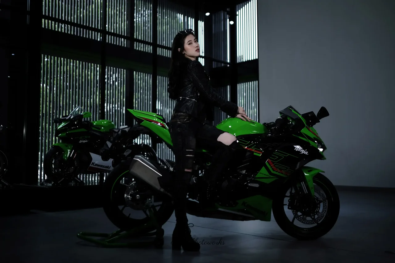 A confident woman poses on a vibrant green Kawasaki Ninja, blending edgy leather and denim in a stark, industrial showroom with bold contrasts.