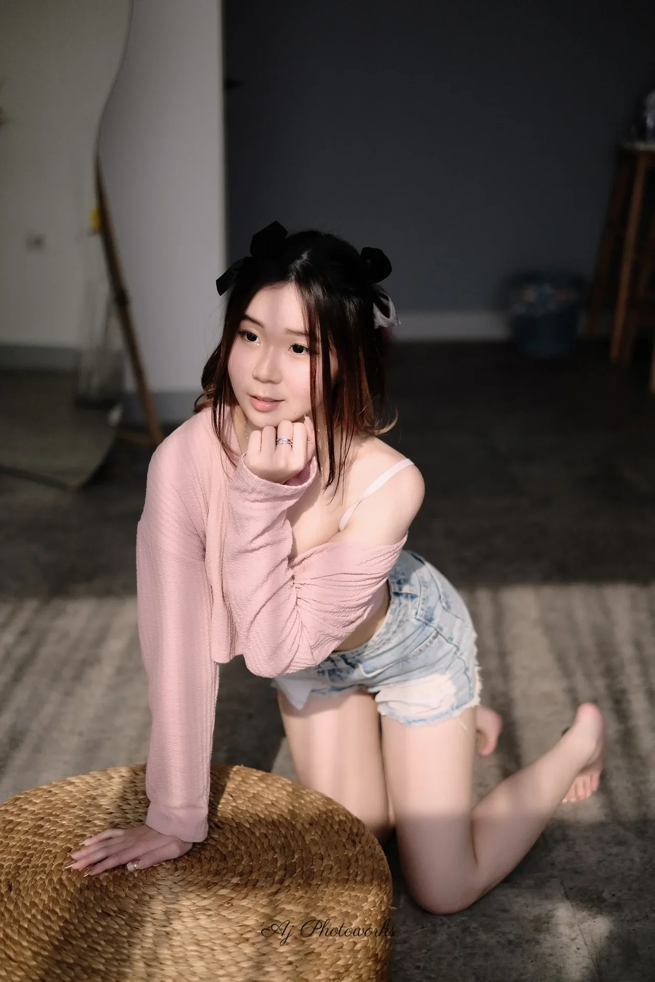 A modern fashion editorial showcasing playful styling in a minimalist studio.