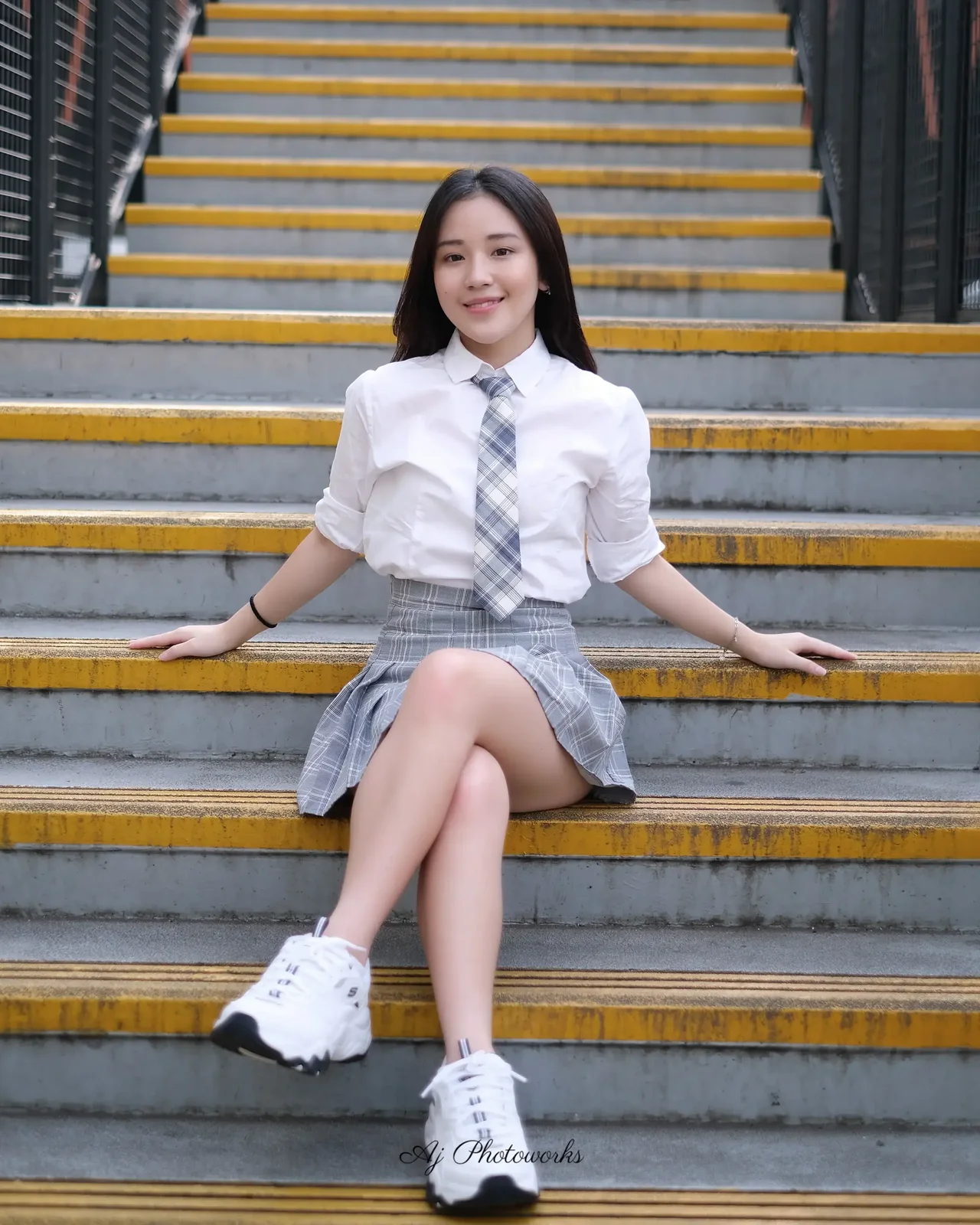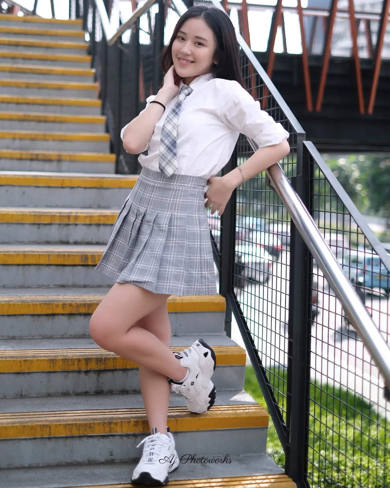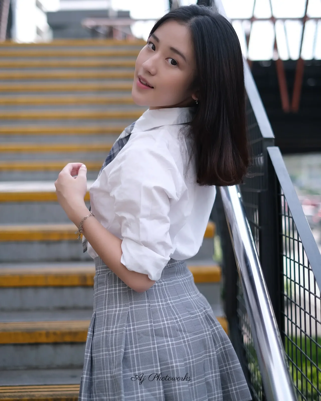 A cheerful young woman in a crisp white blouse and plaid skirt explores a sunlit urban staircase, blending youthful energy with a touch of sophistication.