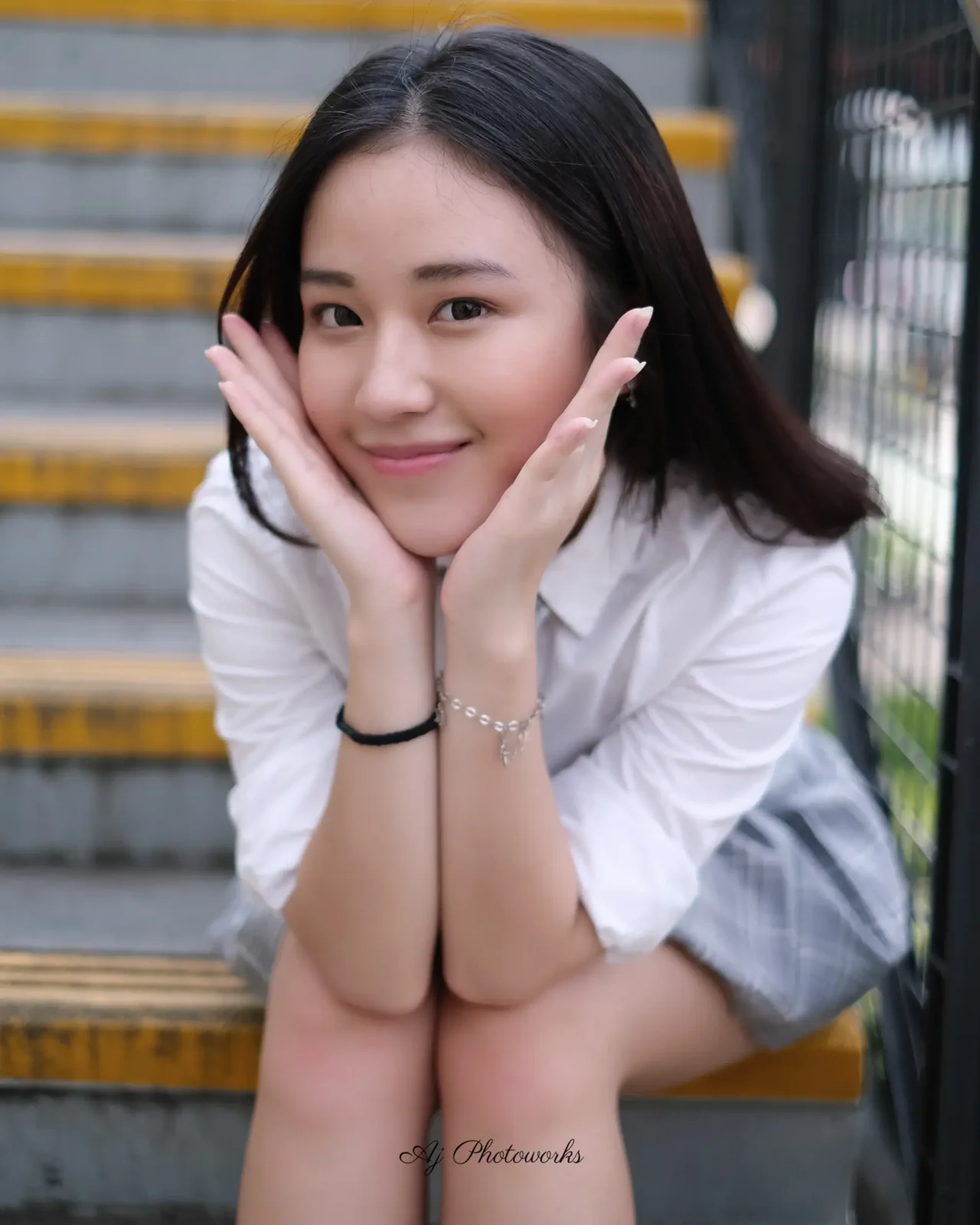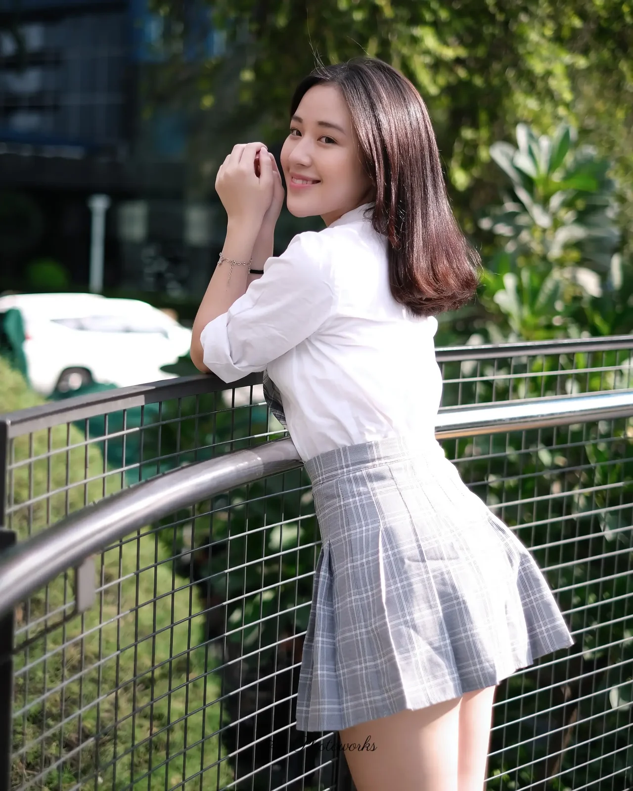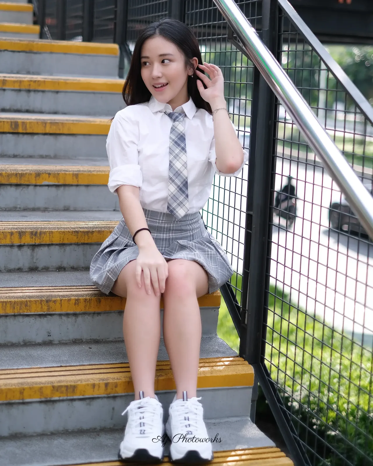 A cheerful young woman in a crisp white blouse and plaid skirt explores a sunlit urban staircase, blending youthful energy with a touch of sophistication.