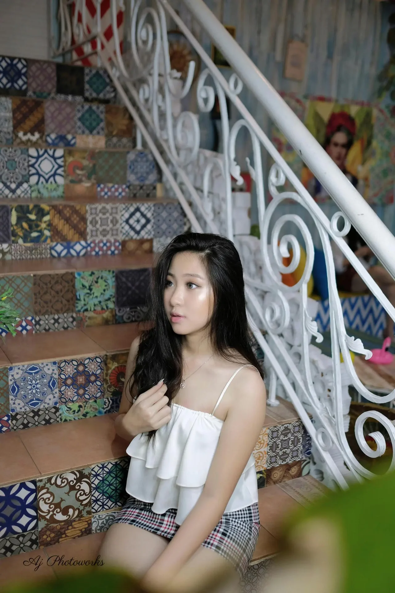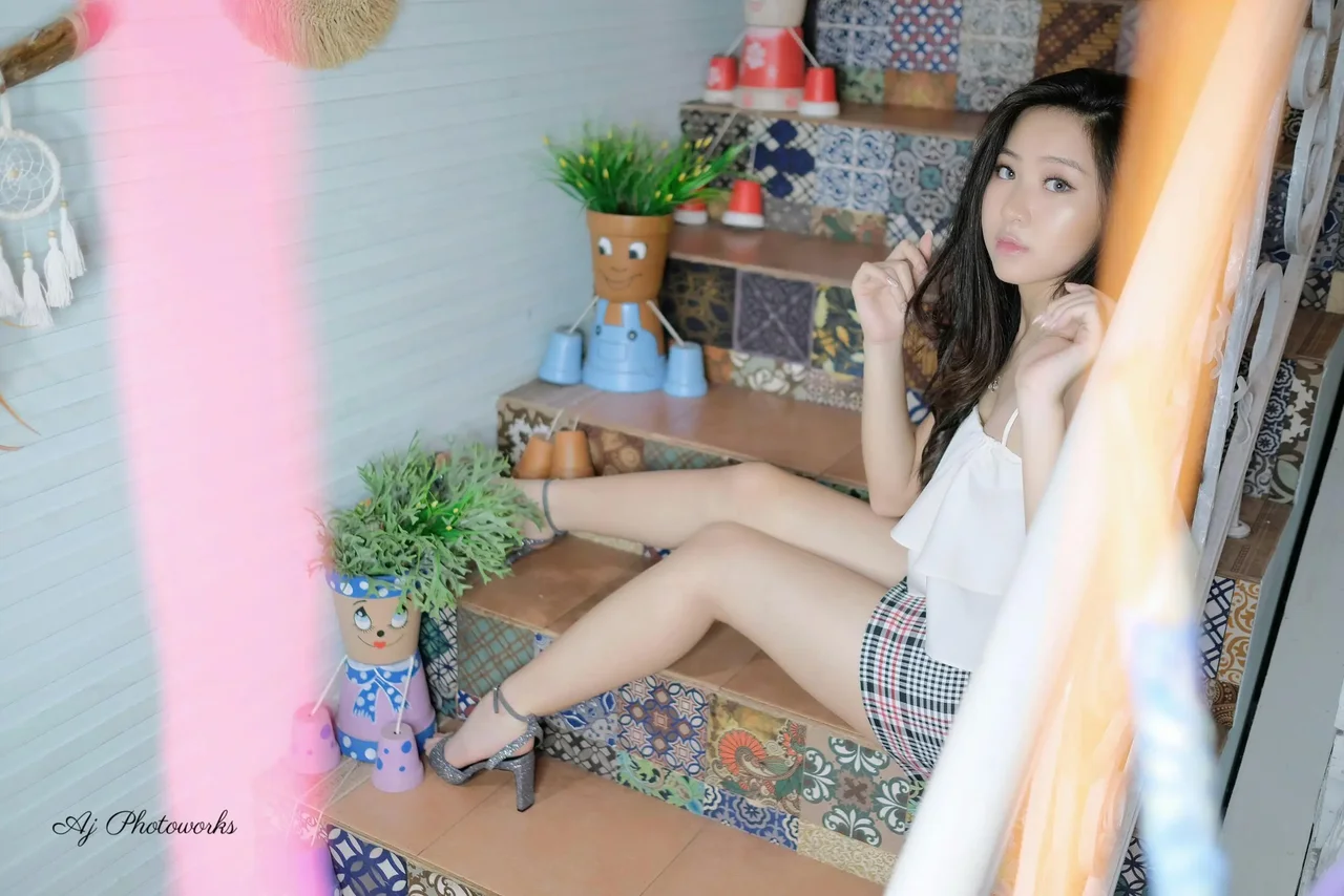 Artistic stairway portrait with vibrant tiles, playful decor, and natural lighting.