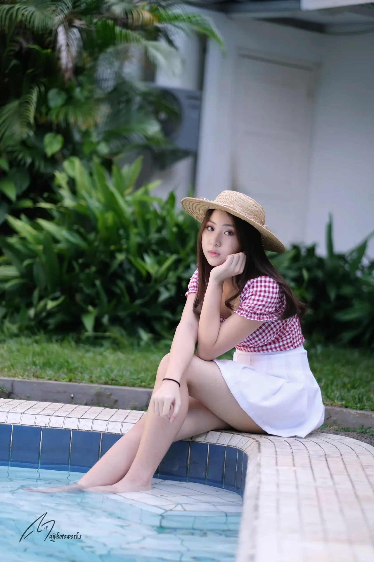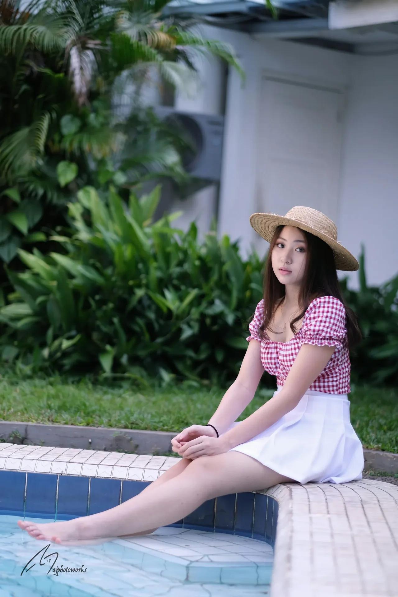 A young woman radiates confidence in a sunlit garden, her vibrant outfit contrasting with the serene poolside backdrop.